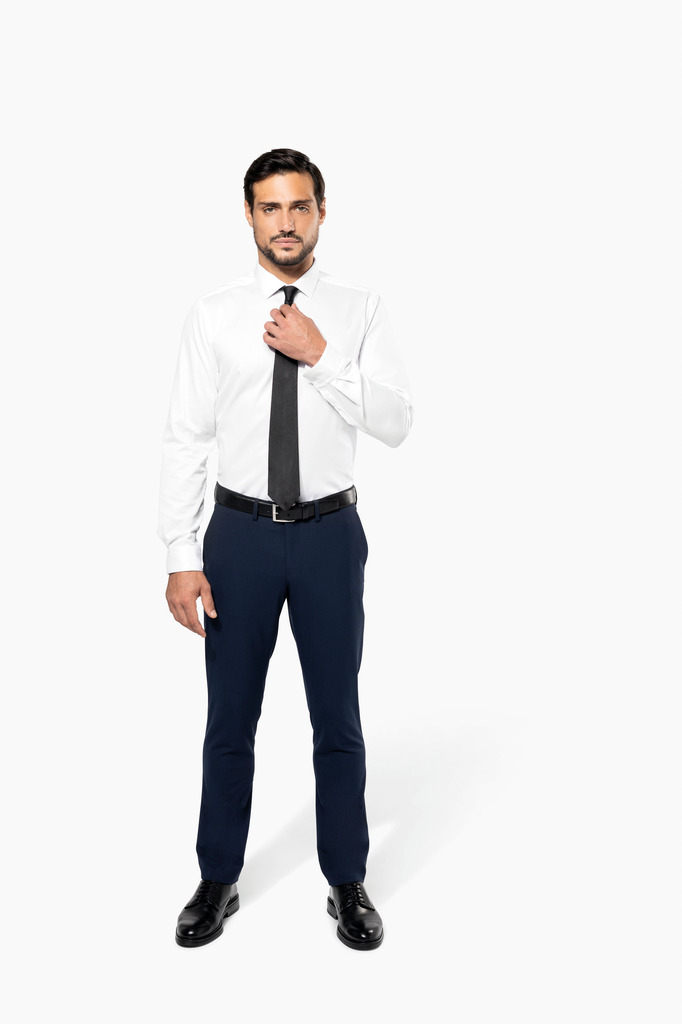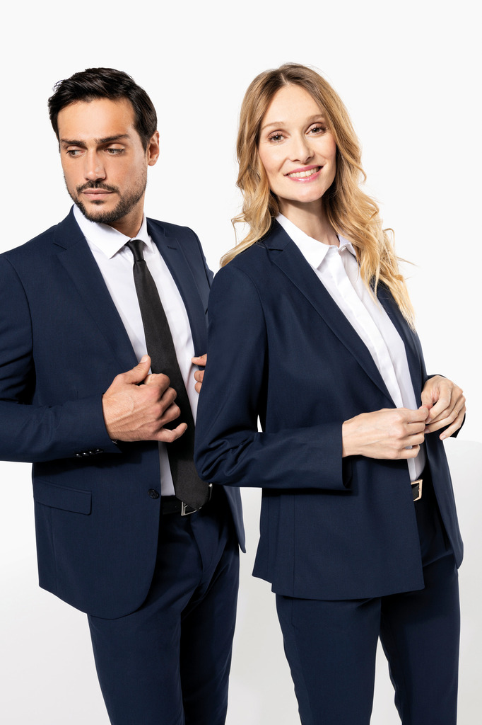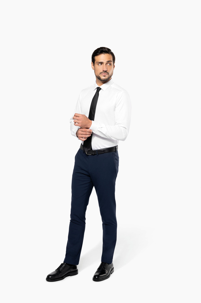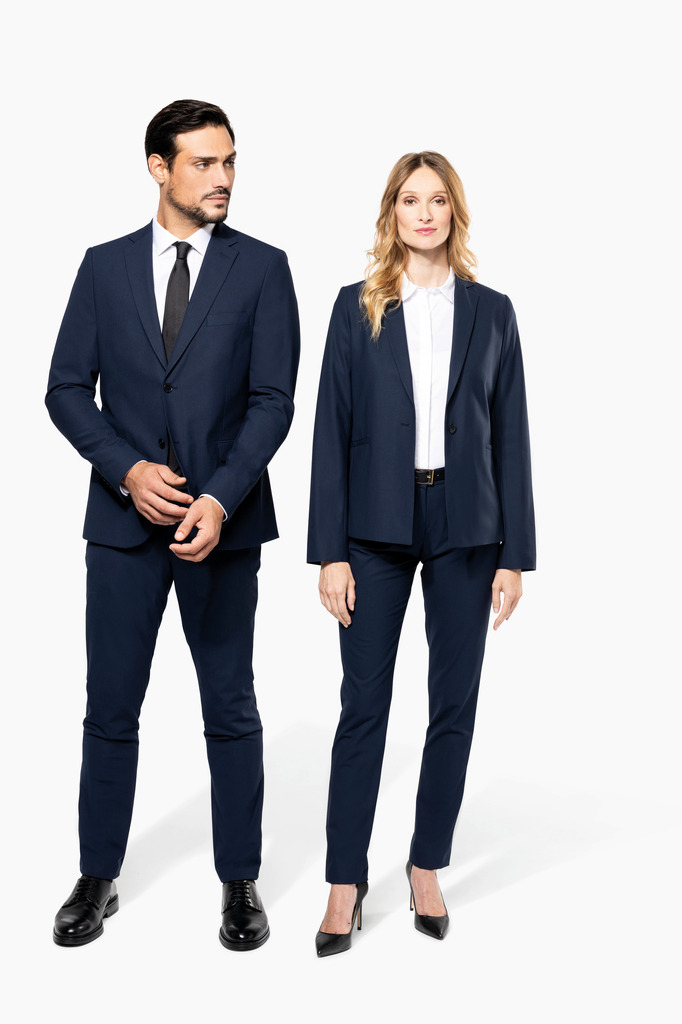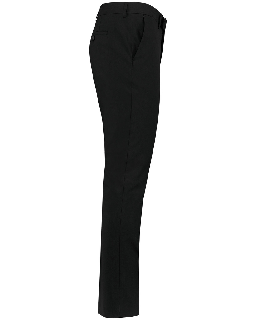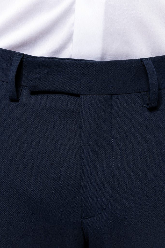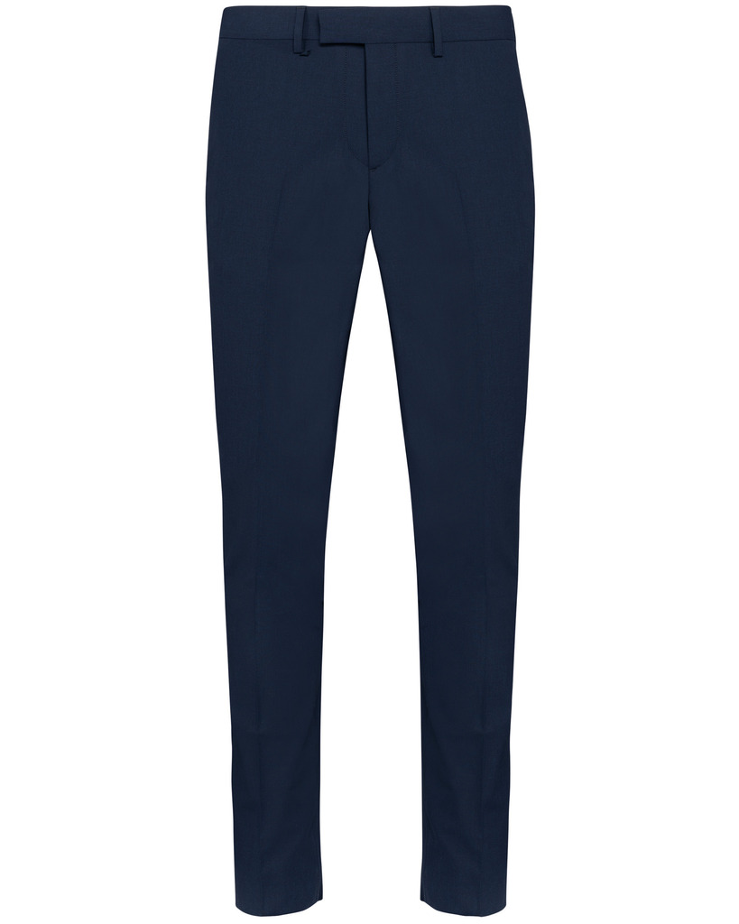 50% poliéster/23% viscose/22% lã/5% elastano. Dois bolsos italianos frontais. Dois bolsos traseiros planos com botões tom sobre tom, bem como um pesponto à volta. Pinça nas pernas na frente e traseira. Braguilha com fecho em nylon tom sobre tom com dois colchetes metálicos. Cintura com presilhas. Forro em poliéster na parte de cima das pernas na frente para mais conforto. Acabamento da bainha invisível. Sem etiqueta de marca, apenas com indicação de tamanho para facilitar a personalização.