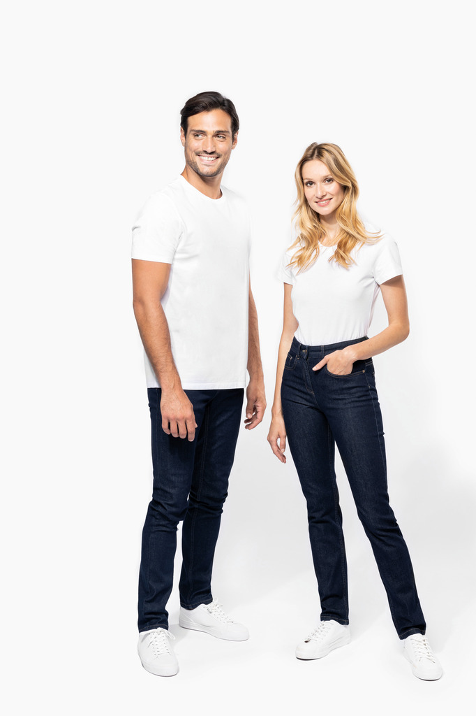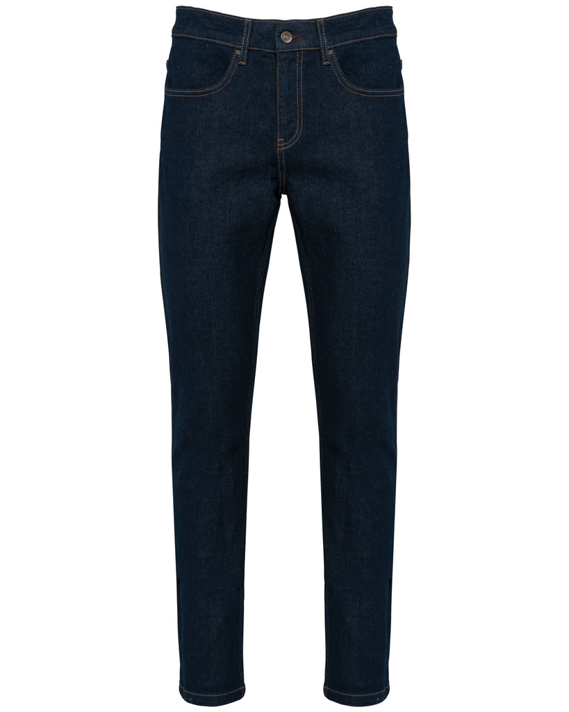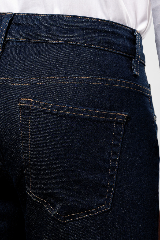 99% algodão denim/1% elastano. 10,50 oz. Fecho com um botão metálico, rebites em metal da mesma cor Old Bras. 2 bolsos frontais, dos quais um com bolso para cartão. 2 bolsos traseiros planos. Costuras em contraste bordeaux. Cintura com presilhas e interior com banda em contraste na parte traseira. Corte direito. Estas calças de ganga foram lavadas com um tratamento especÃfico que implica variações de cor de produto para produto. Ao longo das lavagens, a cor vai-se alterando. Em contacto com superfÃcies claras, pode perder a cor. Sem etiqueta de marca, apenas com indicação de tamanho para facilitar a personalização.
