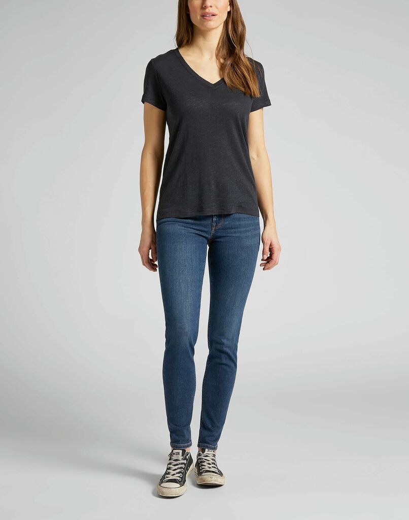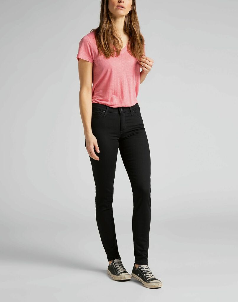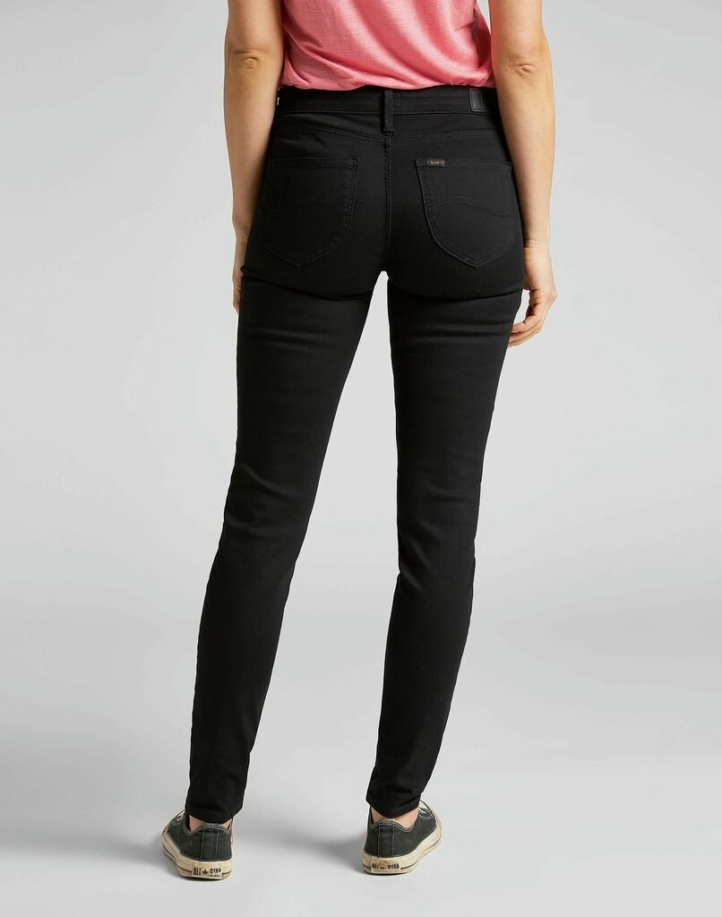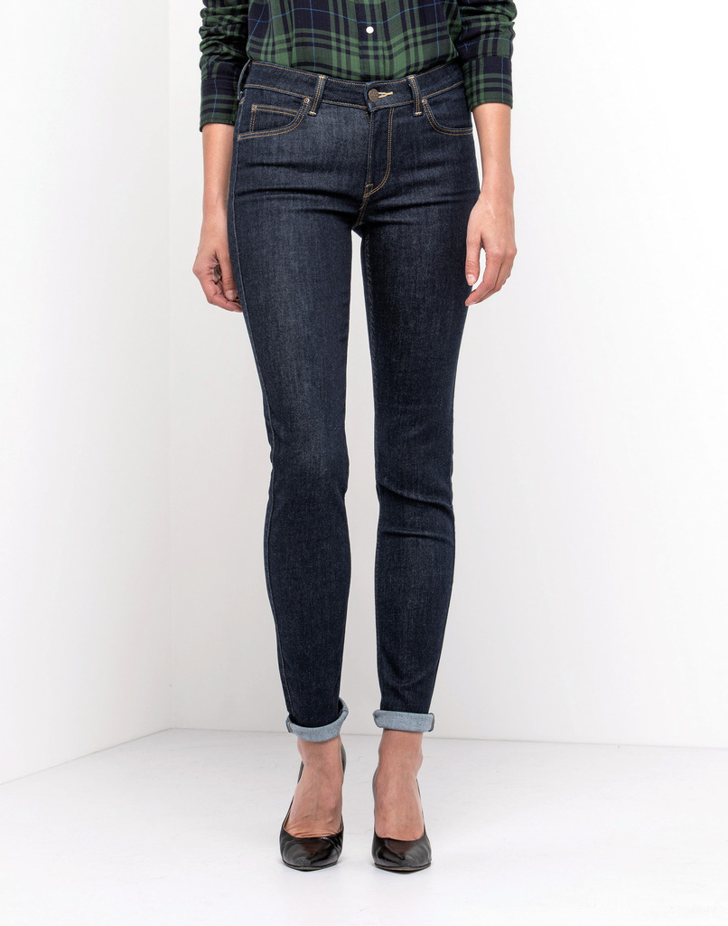 As calças de ganga Lee® Scarlett com 5 bolsos, skinny, de cintura regular, com corte justo. High Blue colourway 11 3/4 oz – 70.6% algodão/27.6% poliéster / 1.8% elastano: Ganga bastante leve e com stretch com efeitos pré lavados. Ilhós em latão envelhecido, patch em couro em castanho claro. Pespontos em contraste. Cor Rinse 11 1/2 oz – 76 % algodão / 22% poliéster / 2% elastano: a nova cor é incrivelmente “clean” e fica a matar na versão super stretch. Botões e ilhós em latão envelhecido, pespontos em contraste, patch em pele (estilo vintage com logo Lee 90’s). Contém partes não têxteis de origem animal.