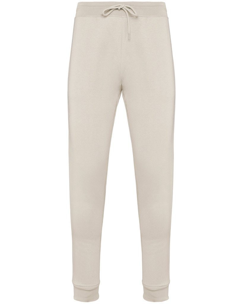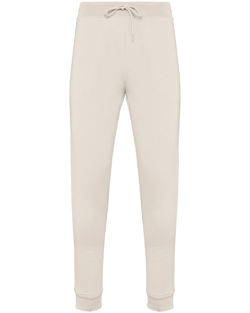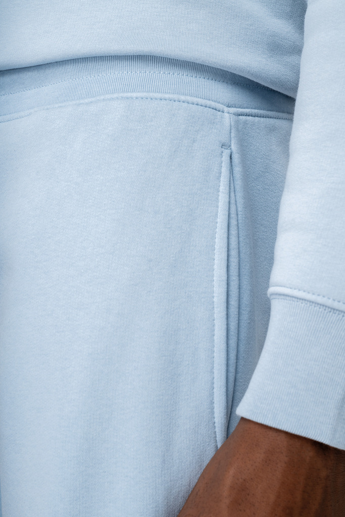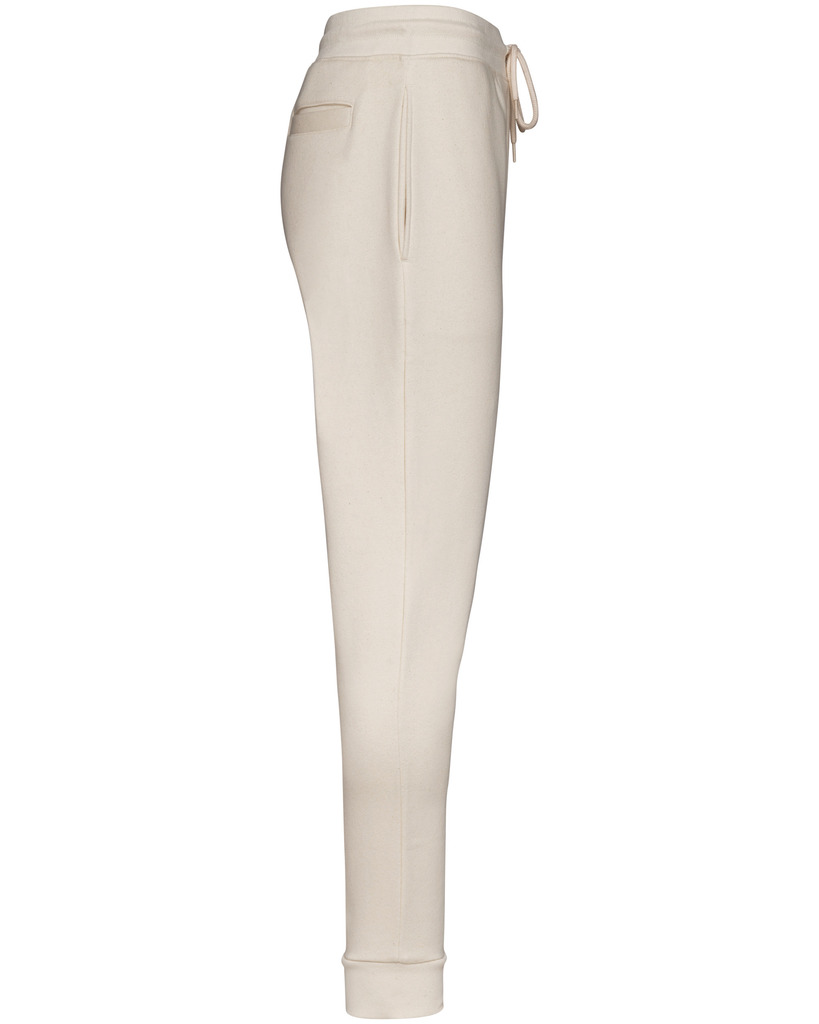 85% algodão biológico / 15% poliéster reciclado pós-consumo. Algodão penteado ringspun. Banho de enzimas. Interior cardado 3 fios LSF (Low Shrinkage Fleece). Cintura em malha rib 1 x 1 com cordão de ajuste e ilhó para passar o cordão. Bolsos laterais e um bolso traseiro. Malha rib 1 x 1 no acabamento da perna. A cor Raw Natural distingue-se pelo seu aspecto bruto visualmente texturado, salpicada de partÃculas finas visÃveis a olho nu.