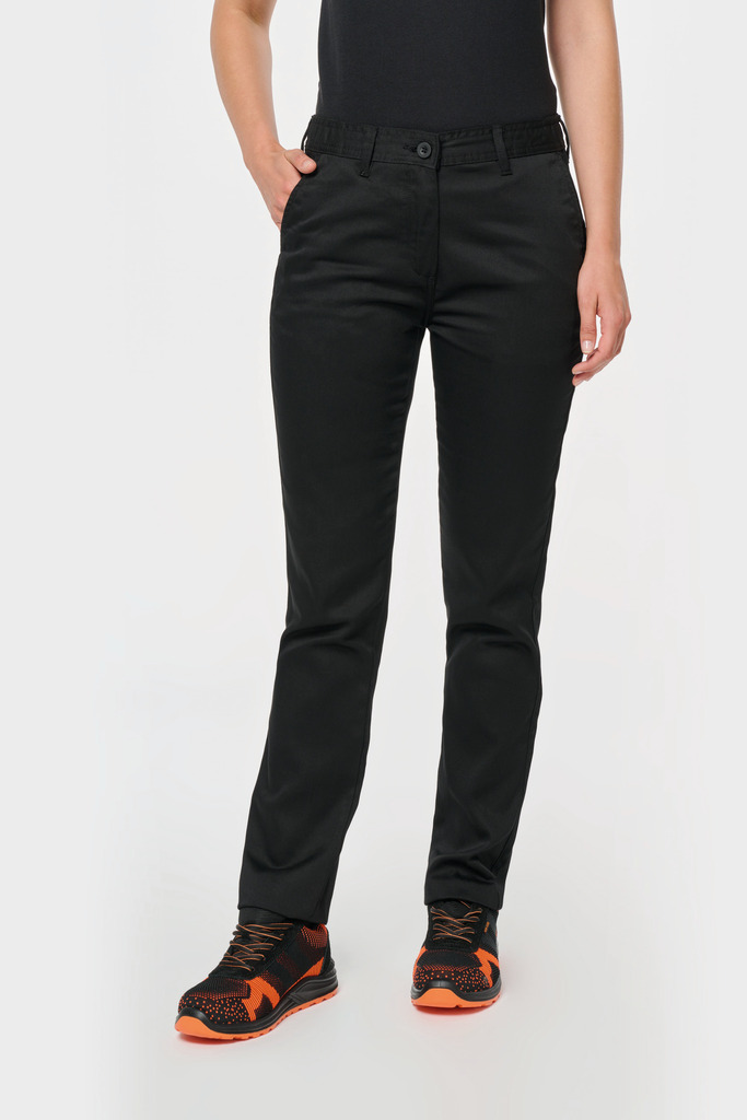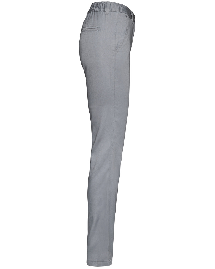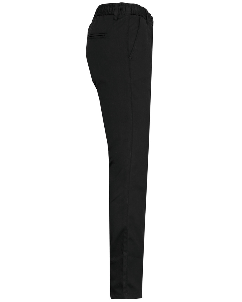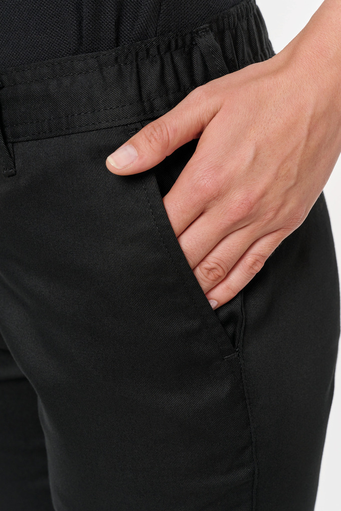 65% poliéster/35% algodão. Lavável a 60°C. 2 bolsos italianos laterais, 1 dos quais para moedas. 2 bolsos traseiros com detalhe e costuras reforçadas. Braguilha com fecho e botão. Cintura elástica com presilhas para maior conforto. Presilha interior para pendurar. Ideal para um uso diário.
