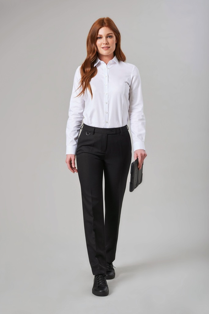 Calças direitas, presilhas e porta-chaves, 2 bolsos à frente, 2 bolsos falsos traseiros, (entregues com “bainha não terminada” – comprimento: 91,5 cm).