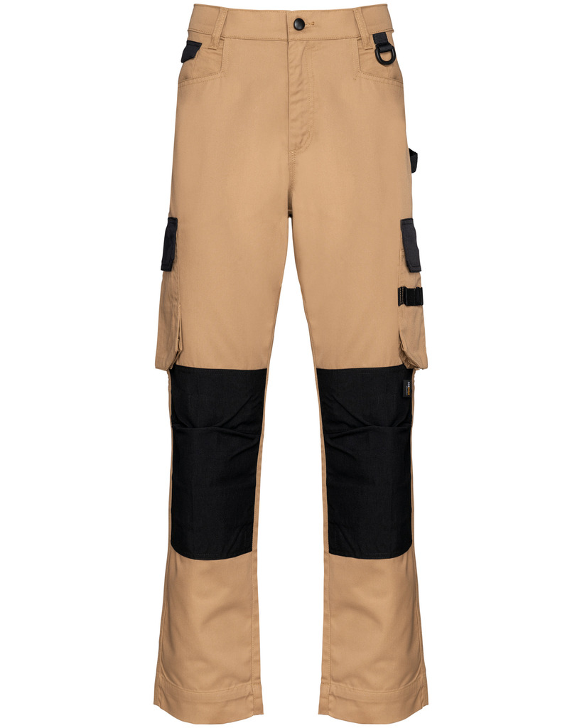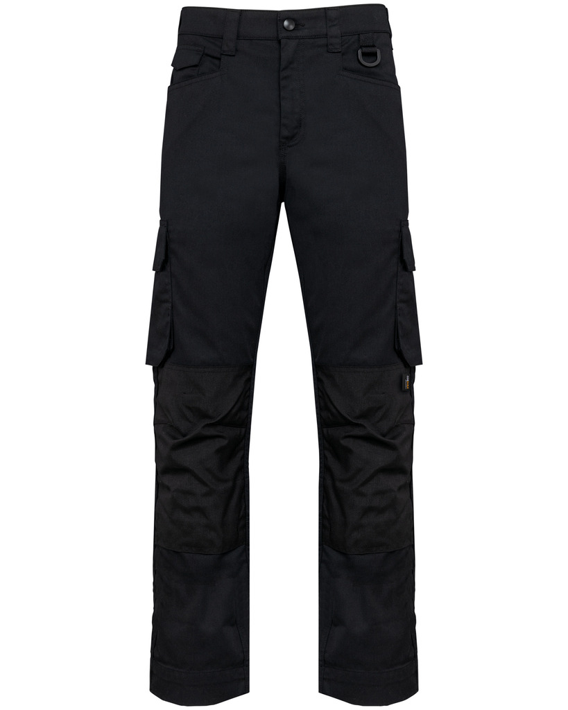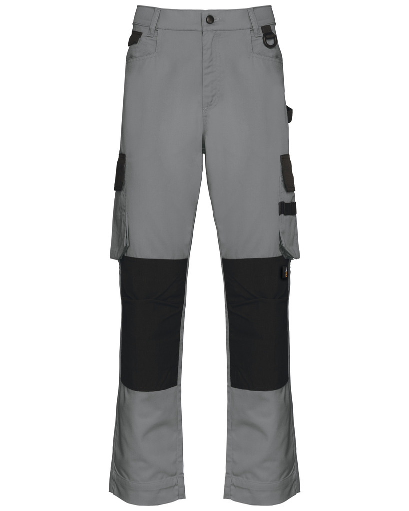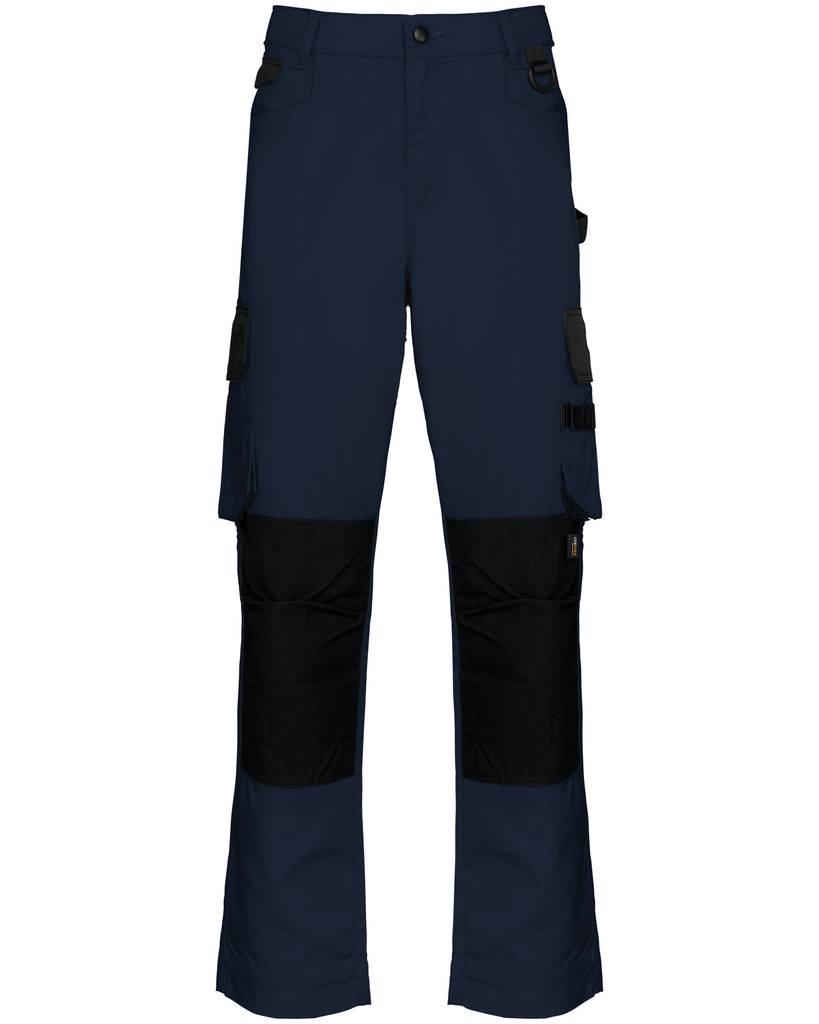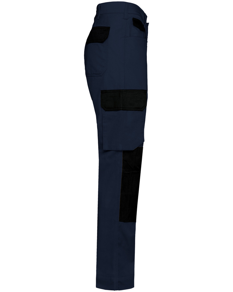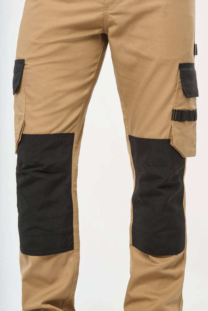65% poliéster/35% algodão. Lavagem a 60 °C. Corte direito. 2 bolsos frontais (forro no tecido principal), dos quais 1 com um pequeno bolso interior que fecha com pala em contraste (excepto na cor Noir). 2 bolsos cargo com fole e pala em contraste (excepto na cor Noir) com velcro, dos quais 1 possui 2 compartimentos e encaixes para ferramentas. 2 bolsos traseiros com pala e velcro, 1 porta-martelo do lado esquerdo. 2 bolsos joelheiras Cordura® em contraste (cor Noir para todas as cores) com velcro e pala no interior para segurar e adaptar a joelheira. Cintura com presilhas. Argola em plástico presa na cintura na frente do lado esquerdo. Fecho e botão (botão metálico revestido com plástico). Pesponto duplo nas costuras laterais, costura tripla na traseira e na frente. Joelheiras não incluÃdas. Pesponto entrepernas. Entrepernas 80 e bainha com 5 cm. Etiqueta de marca amovÃvel.