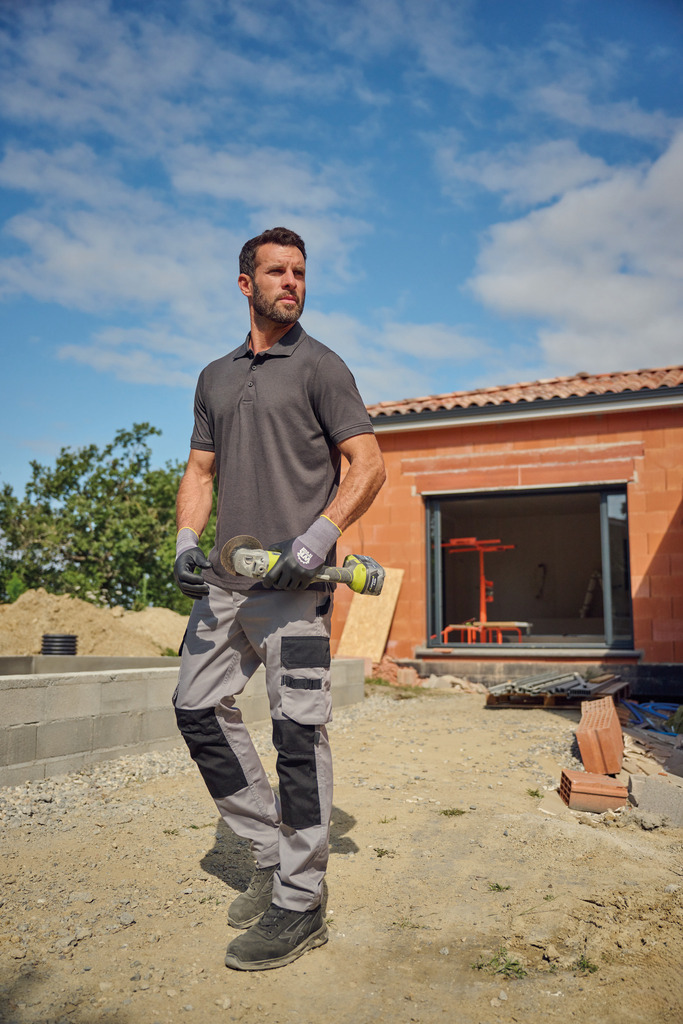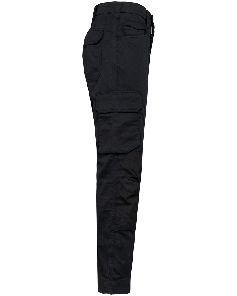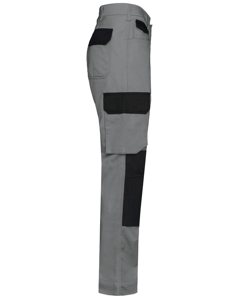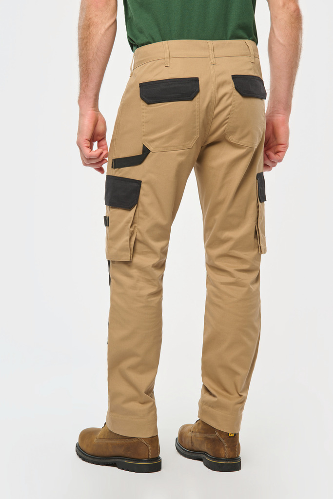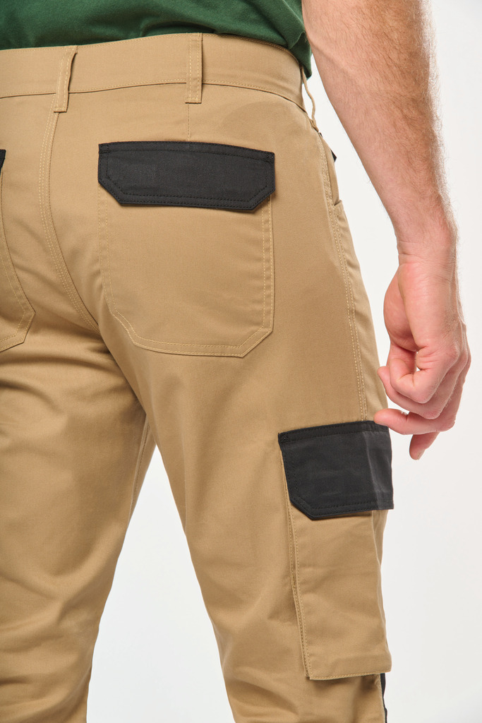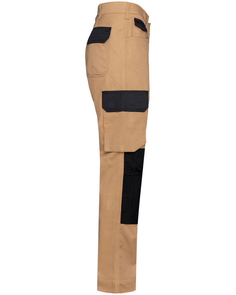 65% poliéster/35% algodão. Lavagem a 60 °C. Corte direito. 2 bolsos frontais (forro no tecido principal), dos quais 1 com um pequeno bolso interior que fecha com pala em contraste (excepto na cor Noir). 2 bolsos cargo com fole e pala em contraste (excepto na cor Noir) com velcro, dos quais 1 possui 2 compartimentos e encaixes para ferramentas. 2 bolsos traseiros com pala e velcro, 1 porta-martelo do lado esquerdo. 2 bolsos joelheiras Cordura® em contraste (cor Noir para todas as cores) com velcro e pala no interior para segurar e adaptar a joelheira. Cintura com presilhas. Argola em plástico presa na cintura na frente do lado esquerdo. Fecho e botão (botão metálico revestido com plástico). Pesponto duplo nas costuras laterais, costura tripla na traseira e na frente. Joelheiras não incluÃdas. Pesponto entrepernas. Entrepernas 80 e bainha com 5 cm. Etiqueta de marca amovÃvel.