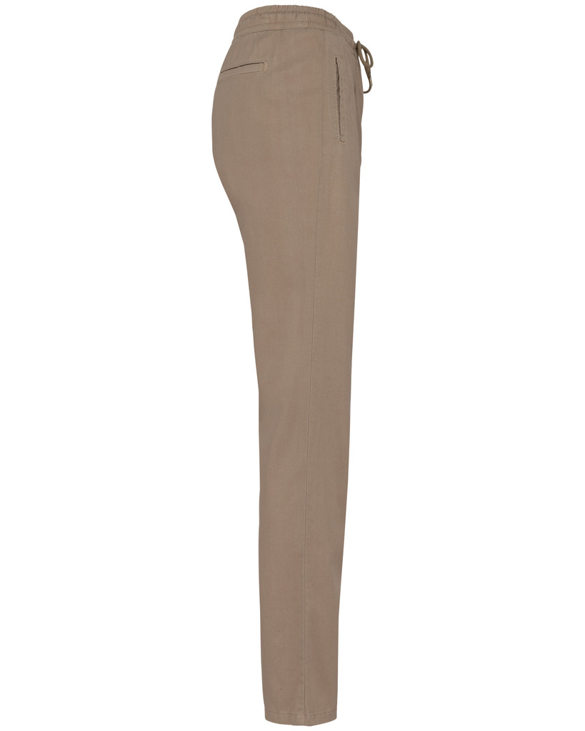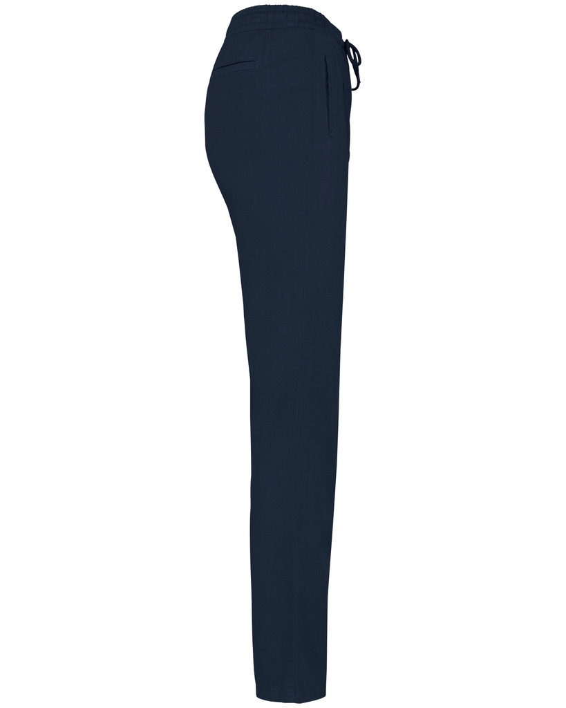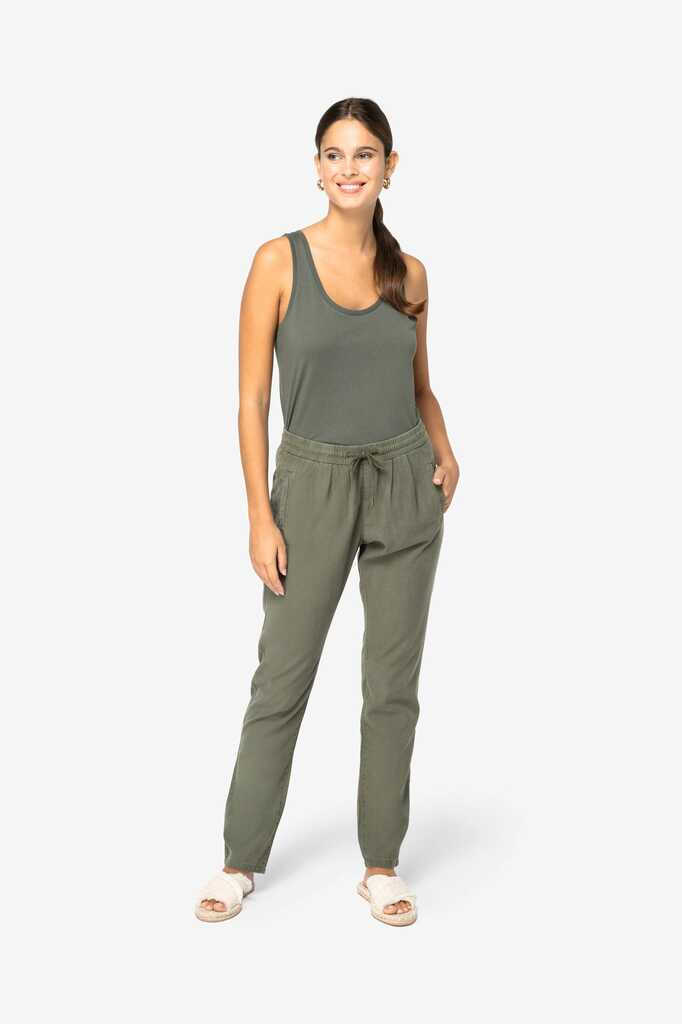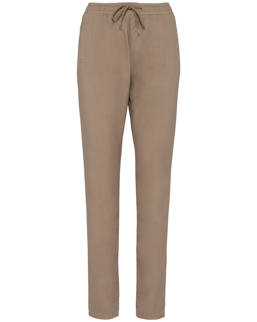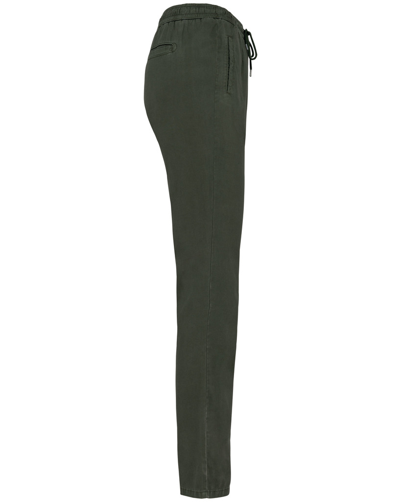 65% liocel TENCELâ„¢ / 35% algodão biológico. Corte descontraÃdo. Acabamento toque pele de pêssego. Cintura elástica com cordão de ajuste e pontas em metal. Dois bolsos frontais e traseiros com pesponto. Cantos dos bolsos reforçados. Costura com nervura à frente, nas costas, nas laterais e entrepernas. Este produto é susceptÃvel de tingir em contacto com superfÃcies ou peças de roupa claras.