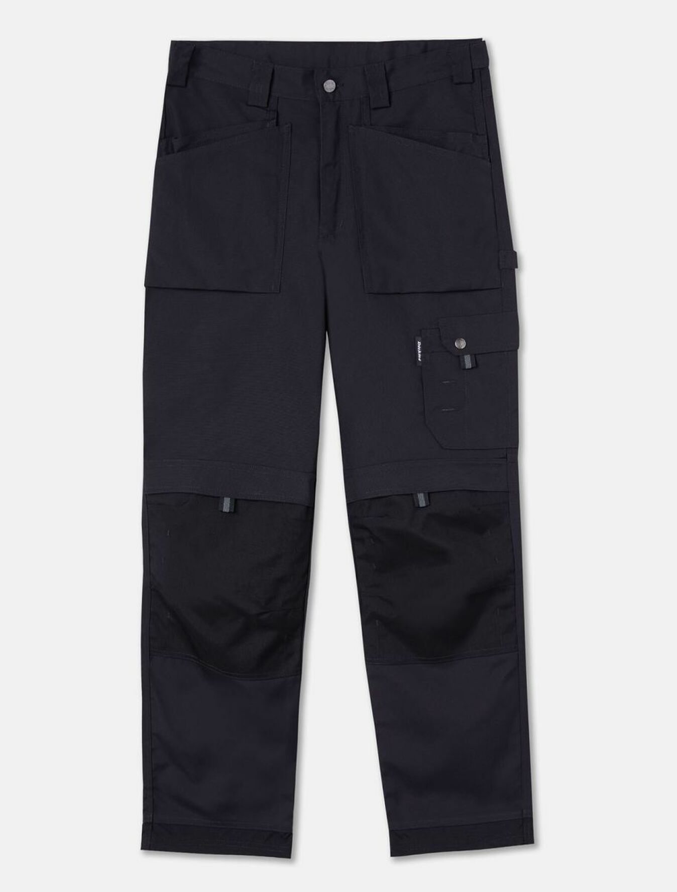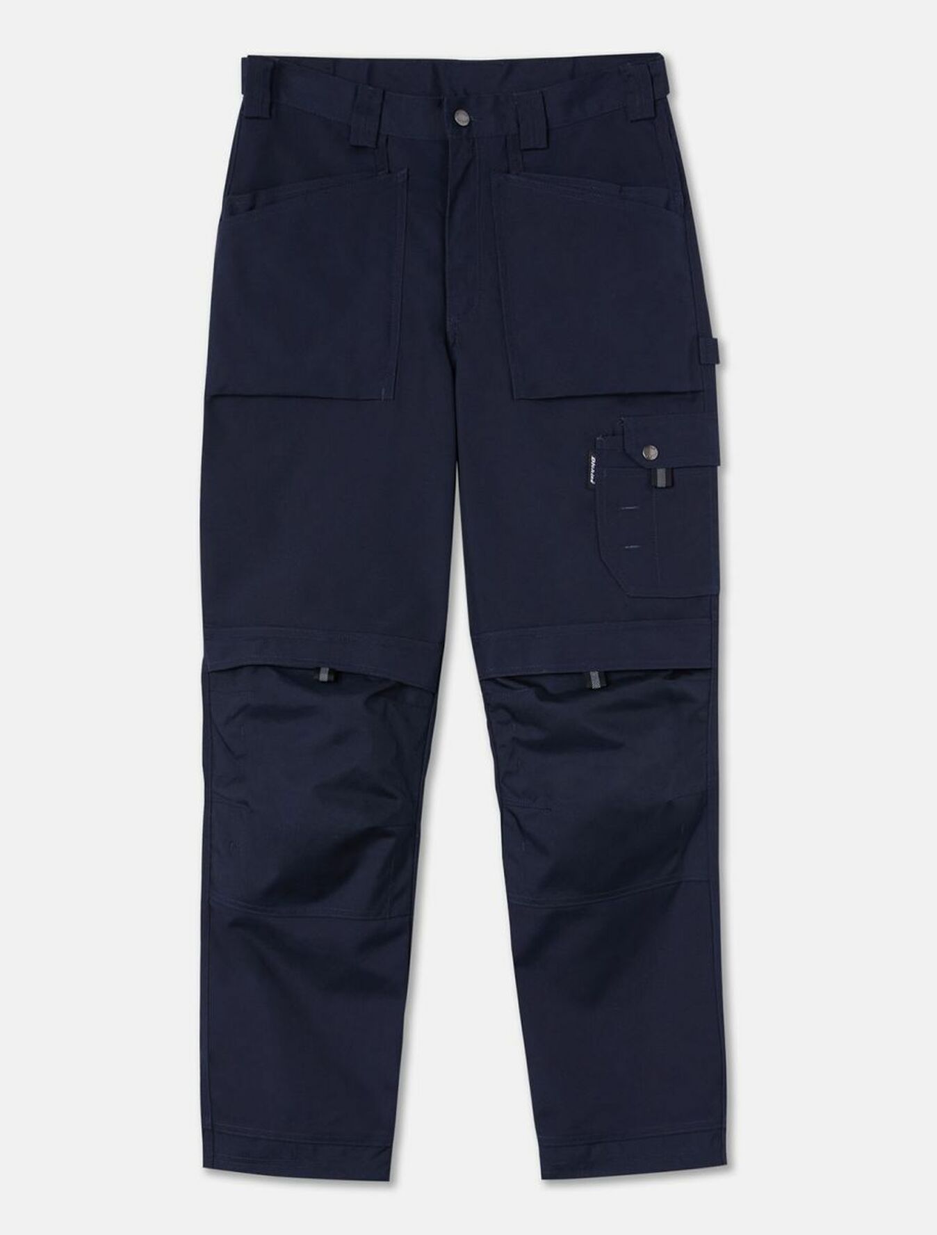65% poliéster, 35% algodão. Algodão canvas. Multibolsos. Reforços nos joelhos. Bolsos Holster. Bolso para régua. Bolso para telemóvel. Presilha para martelo.