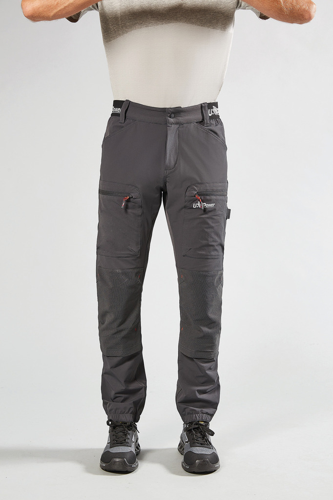 92% nylon, 8% Spandex. Calças de trabalho stretch em tecido U-4, corte jogging, cintura e extremidades das pernas elásticas para melhor ajuste. Fecho central e botão em plástico anti-riscos. Calças de trabalho reforçadas com protecção nas bainhas e reforço atrás para maior protecção na zona da lombar. O tecido elástico destas calças muito elásticas exerce um movimento simultâneo em quatro direcções, garantindo, assim, uma grande liberdade de movimentos e um conforto prolongado. Além disso, é impermeável, respirável e de secagem rápida. Horizon é um modelo de calças para homem multibolsos, muito confortável e de grande funcionalidade: dois grandes bolsos frontais, dois bolsos multifunções na frente com fecho, dois bolsos traseiros, dos quais um tem fecho e o outro velcro, bolsos para joelheiras, bolso para fita métrica e presilha para o martelo. A banda reflectora na presilha tubular traseira assegura grande visibilidade.