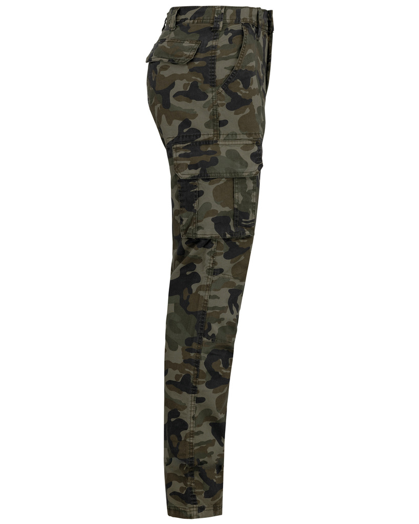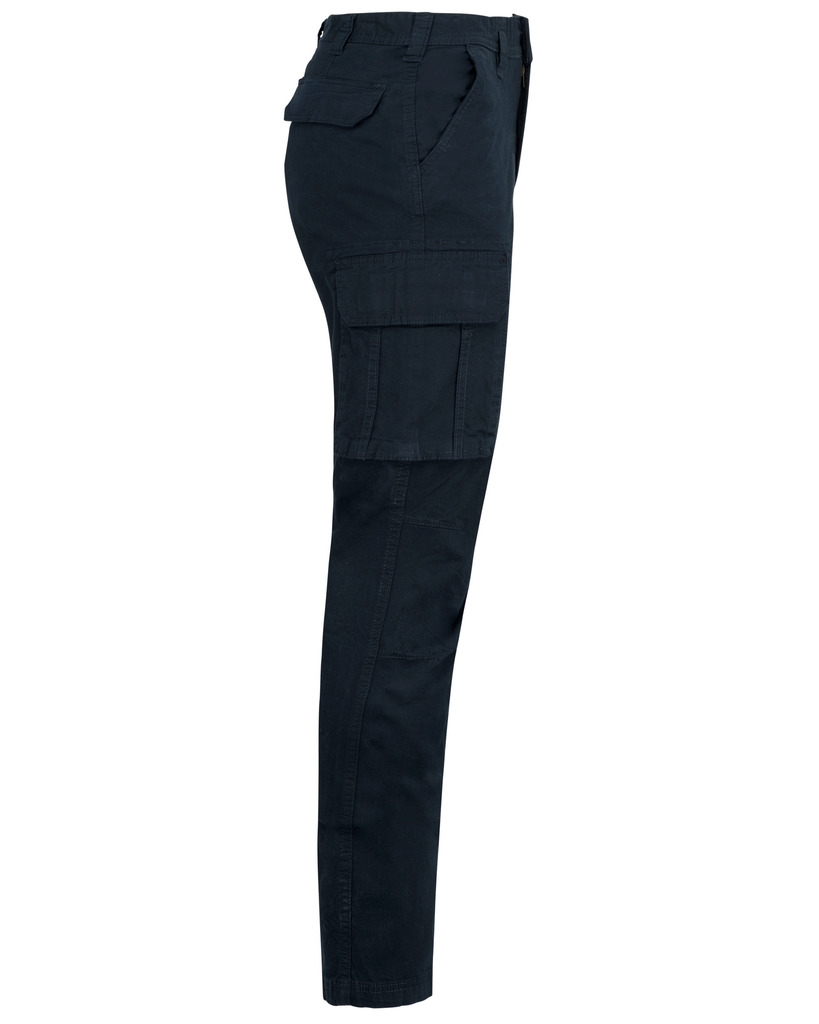 98% algodão / 2% elastano. Tecido em sarja com toque de pele de pêssego. Com fecho e botão de metálico. 2 bolsos frontais. 2 bolsos laterais com divisórias com pala. 2 bolsos traseiros com pala.