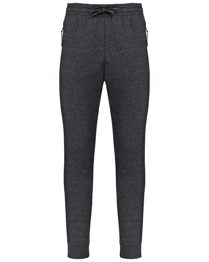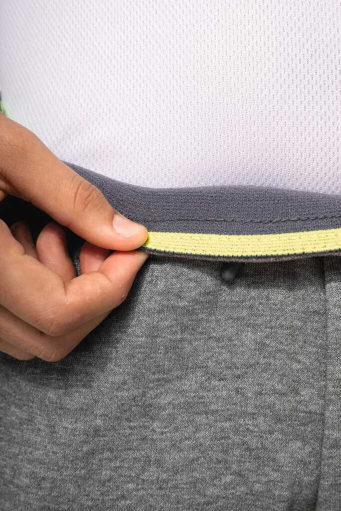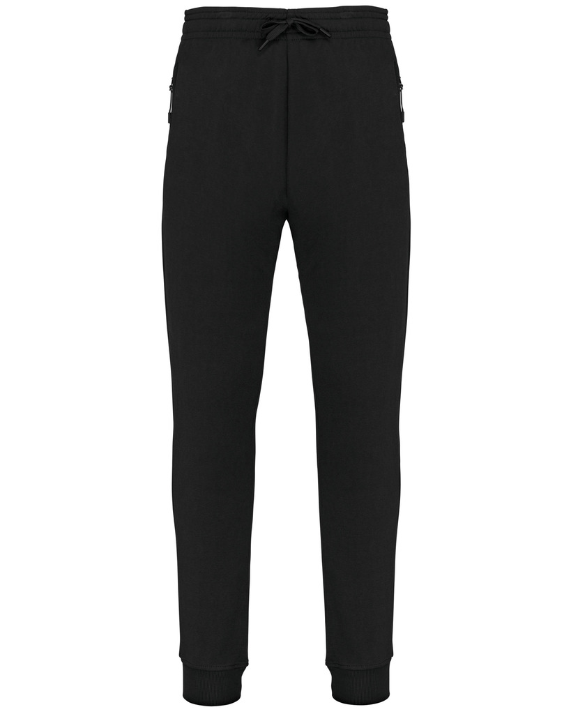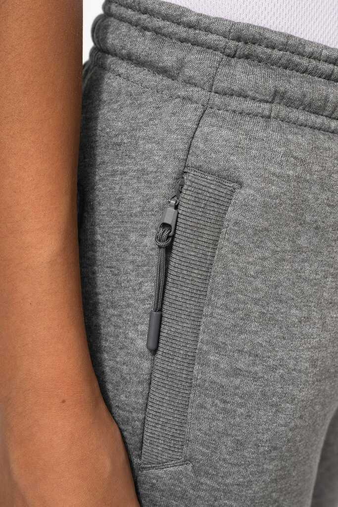 65% poliéster/35% algodão. Interior cardado. Cós elástico com cordão de ajuste à cor. Para maior conforto, acabamento interior do cós com elástico e suave ao toque, com costura em contraste fluorescente. 2 bolsos fantasia laterais com fecho, forro do bolso em rede e um bolso para telemóvel em contraste com cor fluorescente. 1 bolso traseiro. Base das pernas justas com um acabamento em malha rib 2 x 2.