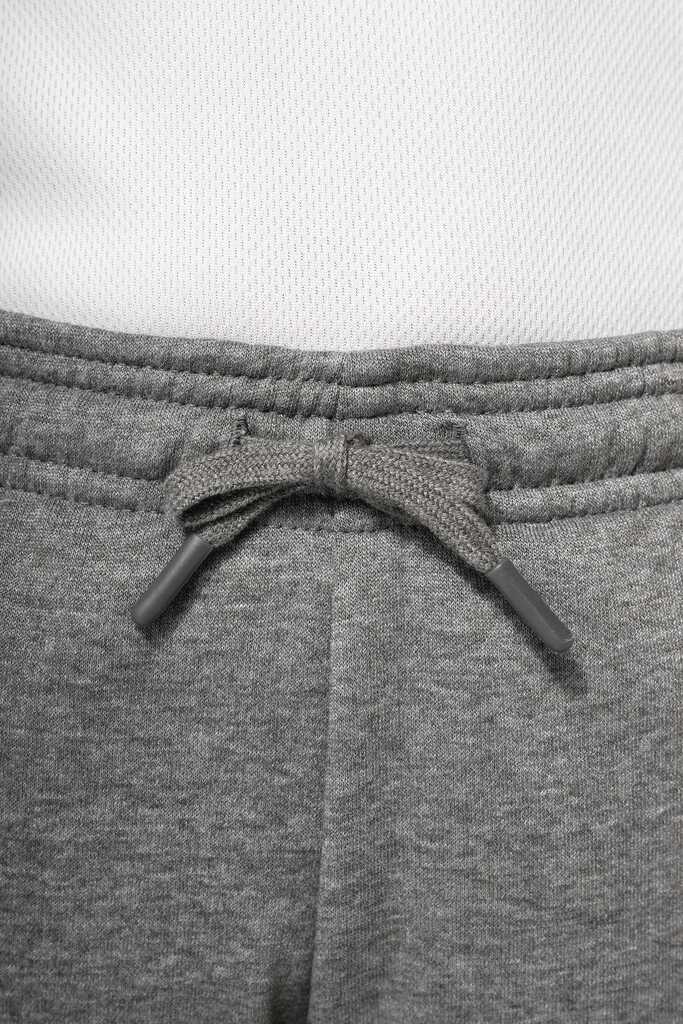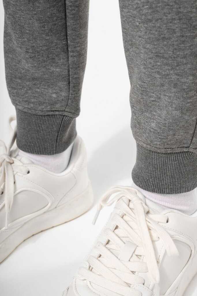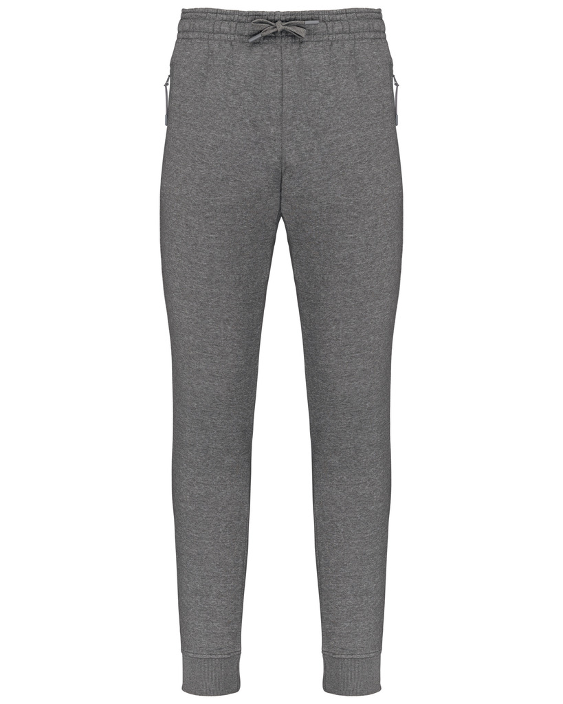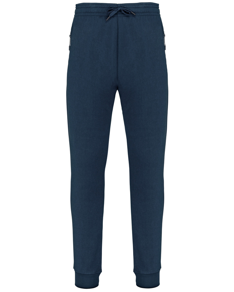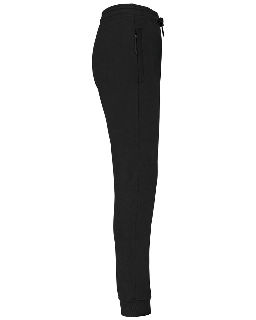 65% poliéster/35% algodão. Interior cardado. Cós elástico com cordão de ajuste à cor. Para maior conforto, acabamento interior do cós com elástico e suave ao toque, com costura em contraste fluorescente. 2 bolsos fantasia laterais com fecho, forro do bolso em rede e um bolso para telemóvel em contraste com cor fluorescente. 1 bolso traseiro. Base das pernas justas com um acabamento em malha rib 2 x 2.