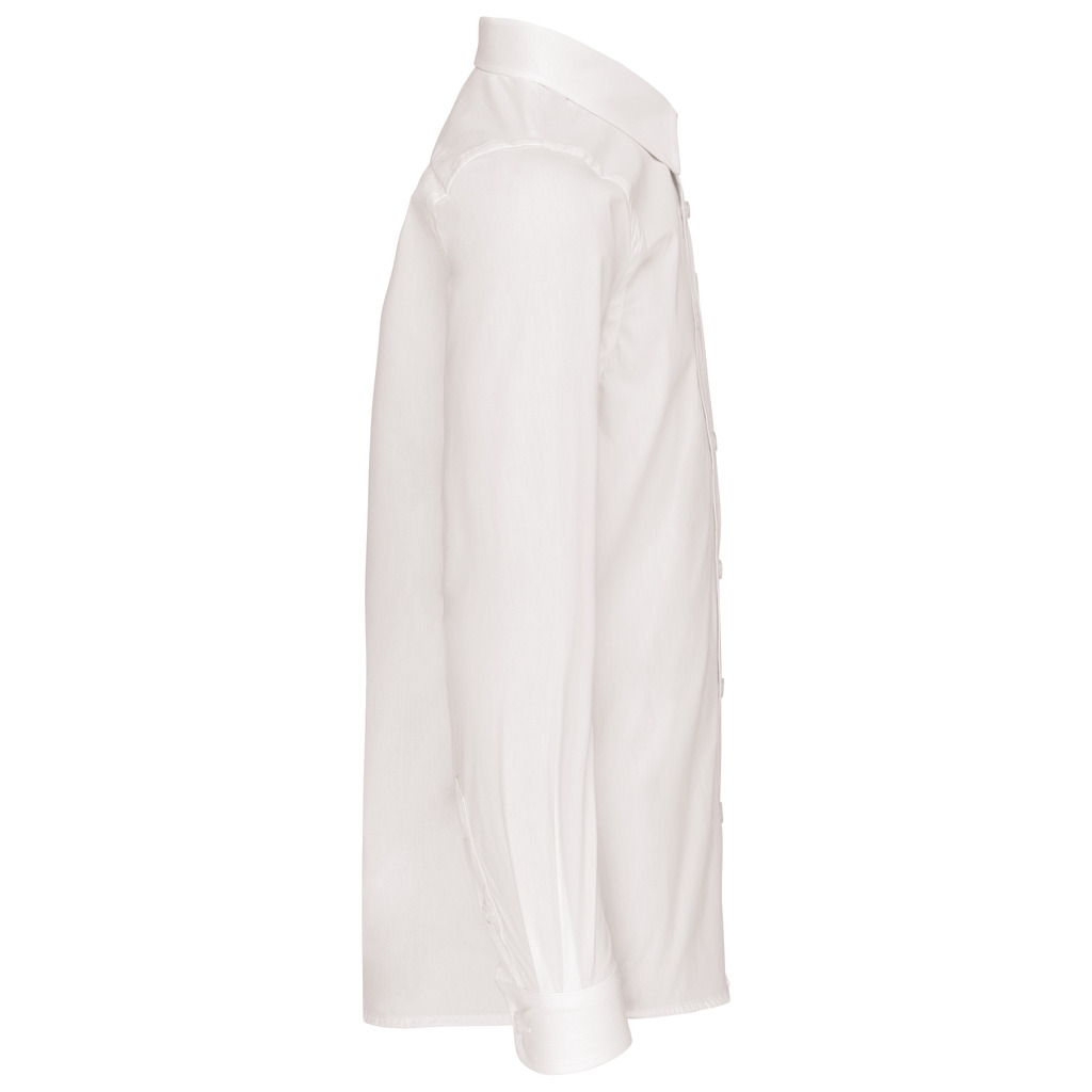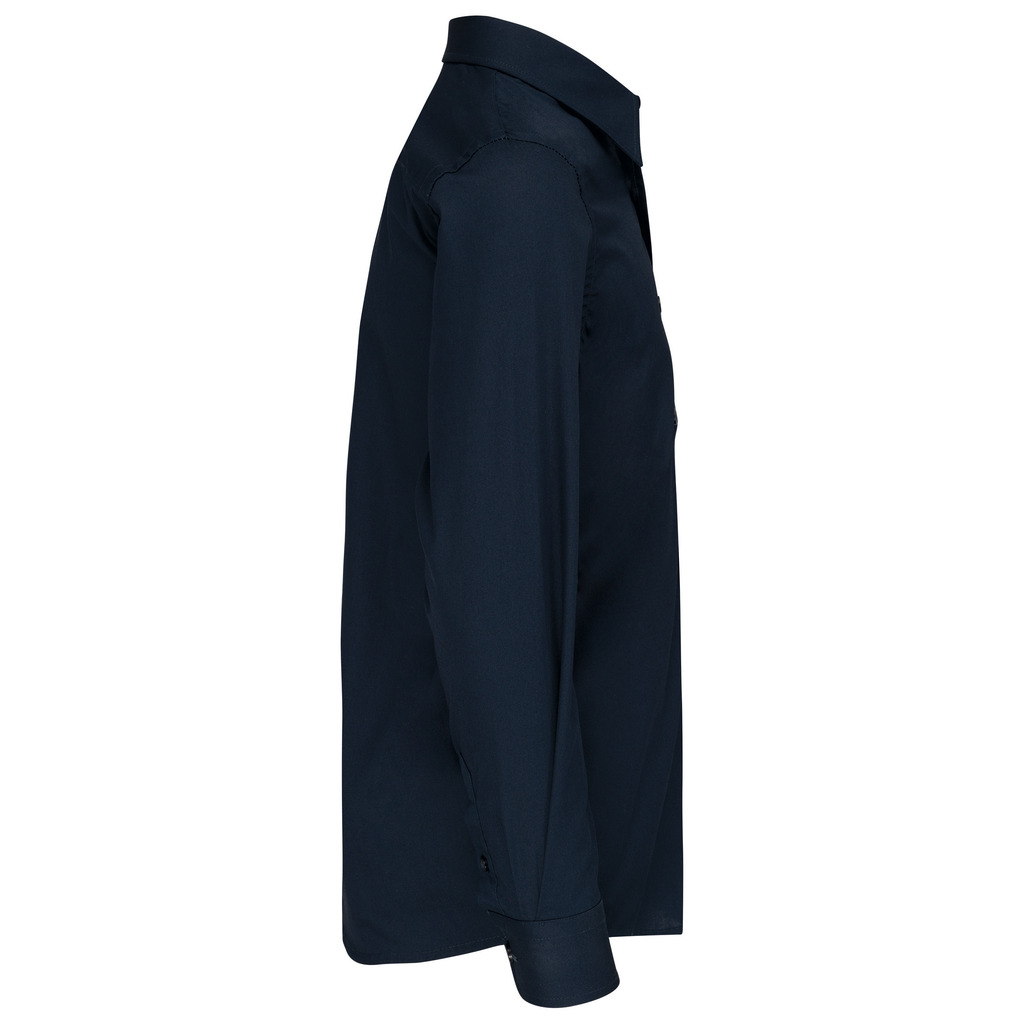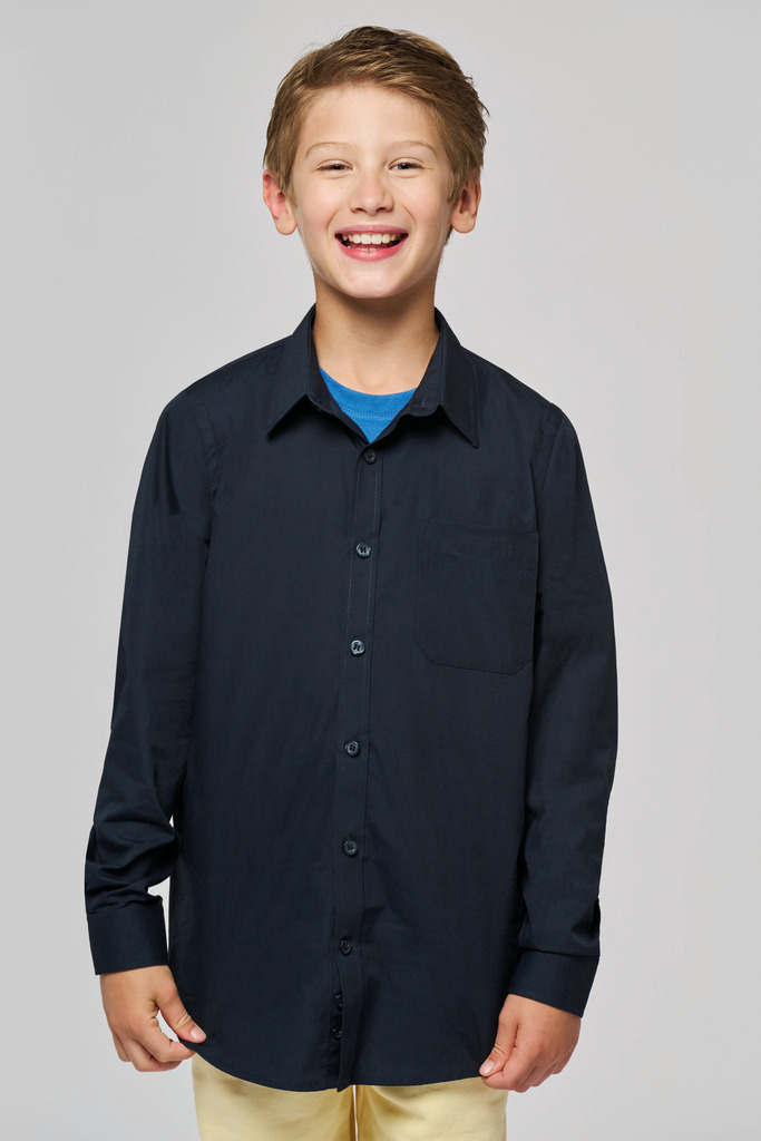 100% Algodão. Tratamento fácil. Botões à cor. 1 bolso no peito. Punhos ajustáveis com botão duplo. 2 botões extra. Bainhas arredondadas.