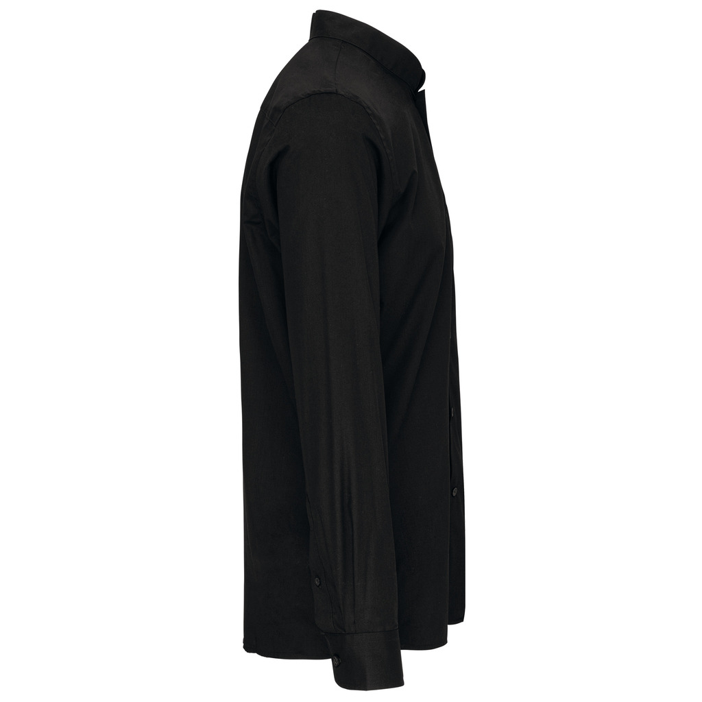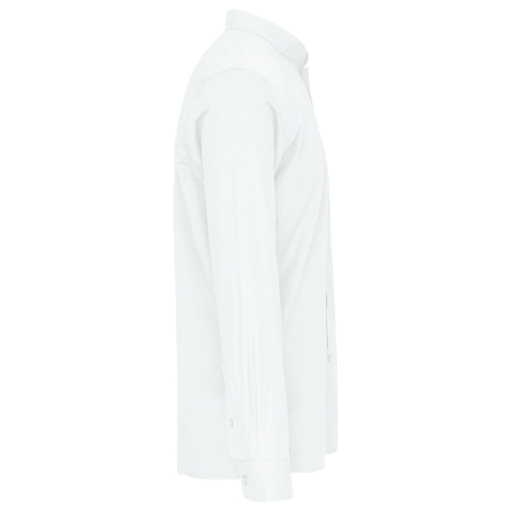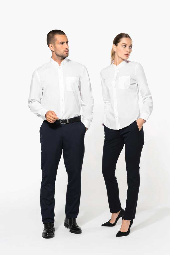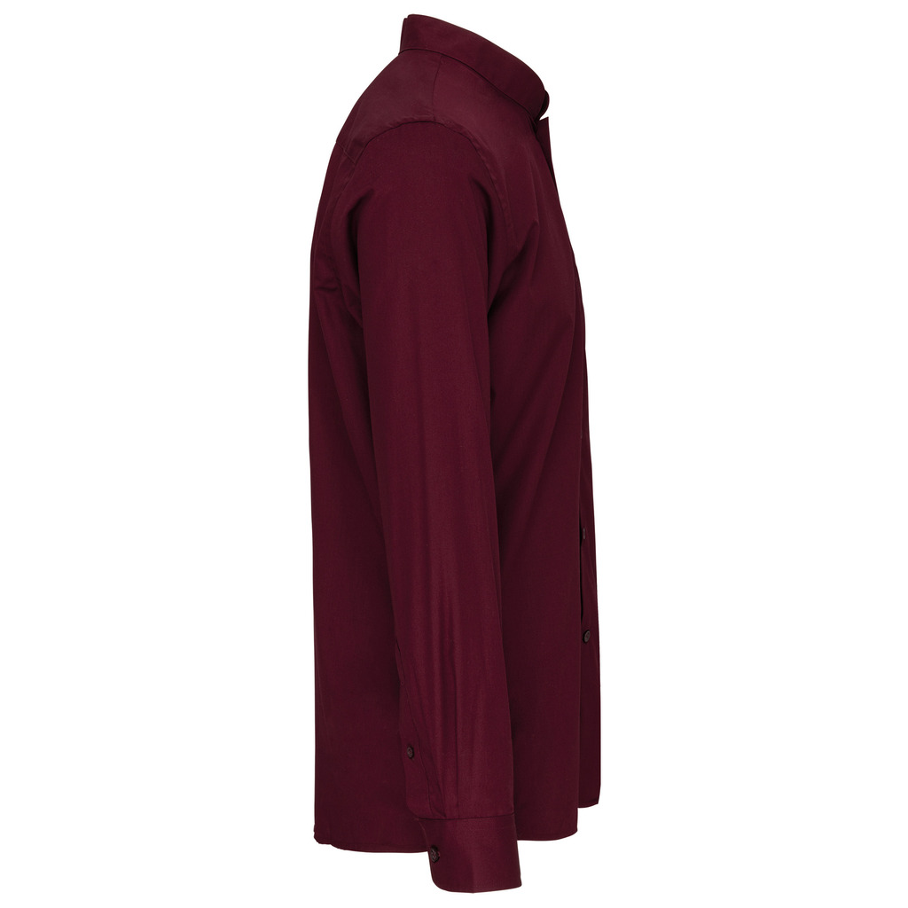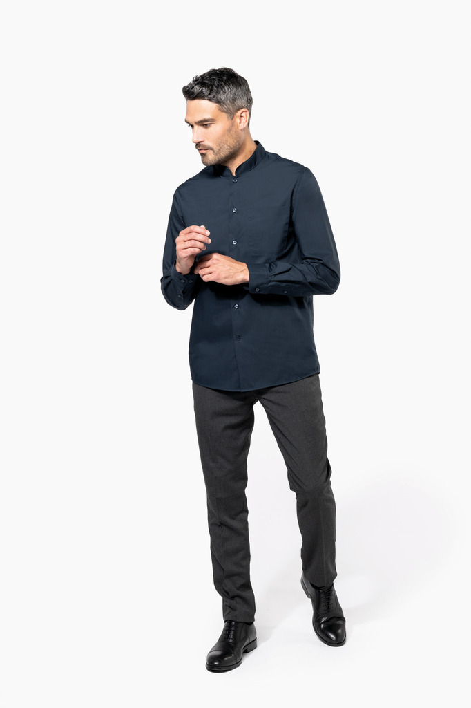 65% Poliéster / 35% Algodão Popeline. Tecido tratamento fácil. Colarinho tipo padre. Botões à cor. Bolso peito esquerdo com cantos arredondados. Punhos ajustáveis. 2 botões extra. Corte justo.