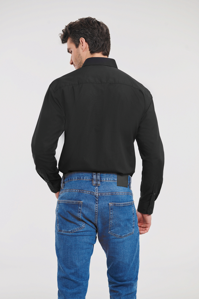 Mistura: 65% poliéster – 35% algodão. Camisa de executivo elegante em popeline clássica. Tratamento fácil. Ideal para vestuário de trabalho, é resistente. Bainha direita. Carcela com 7 botões em cor a condizer. Punhos ajustáveis arredondados com 2 botões e carcela com um único botão. Bolso no peito esquerdo.