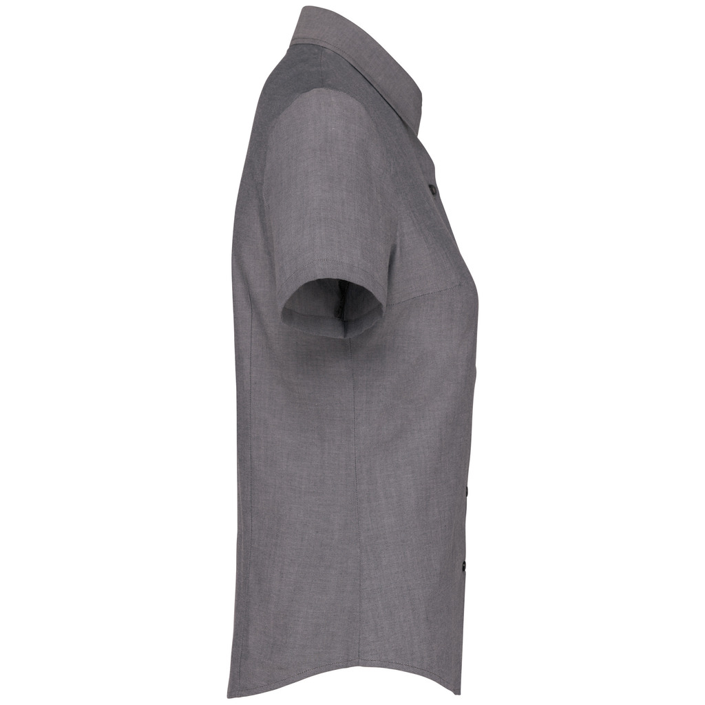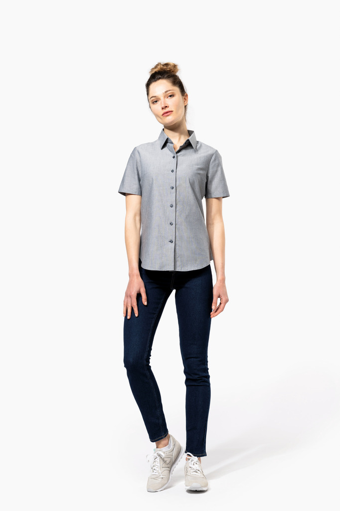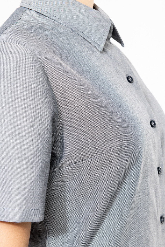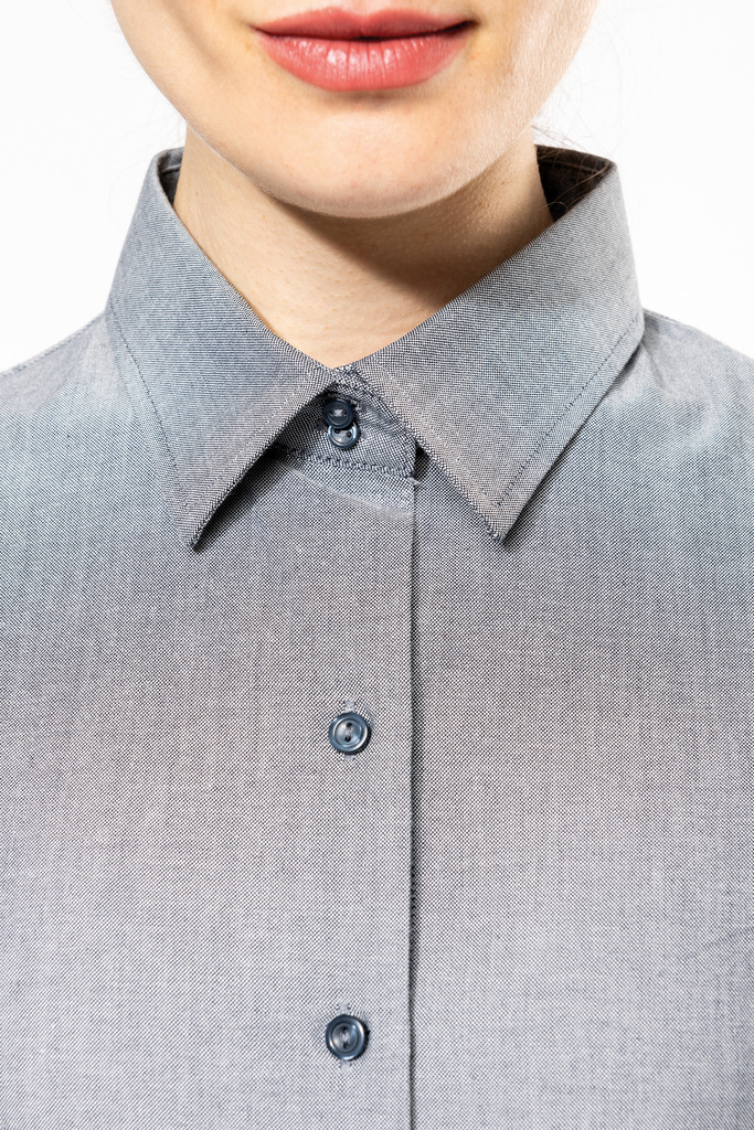 70% algodão / 30% Poliéster. Tecido tratamento fácil (Easy care). Tecido oxford. Botões à cor. Corte cintado. Botões extra. Bainha arredondada.