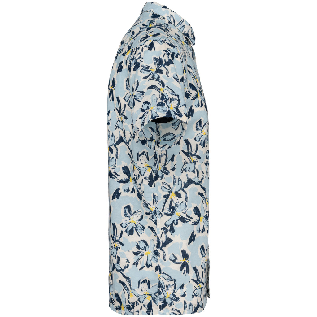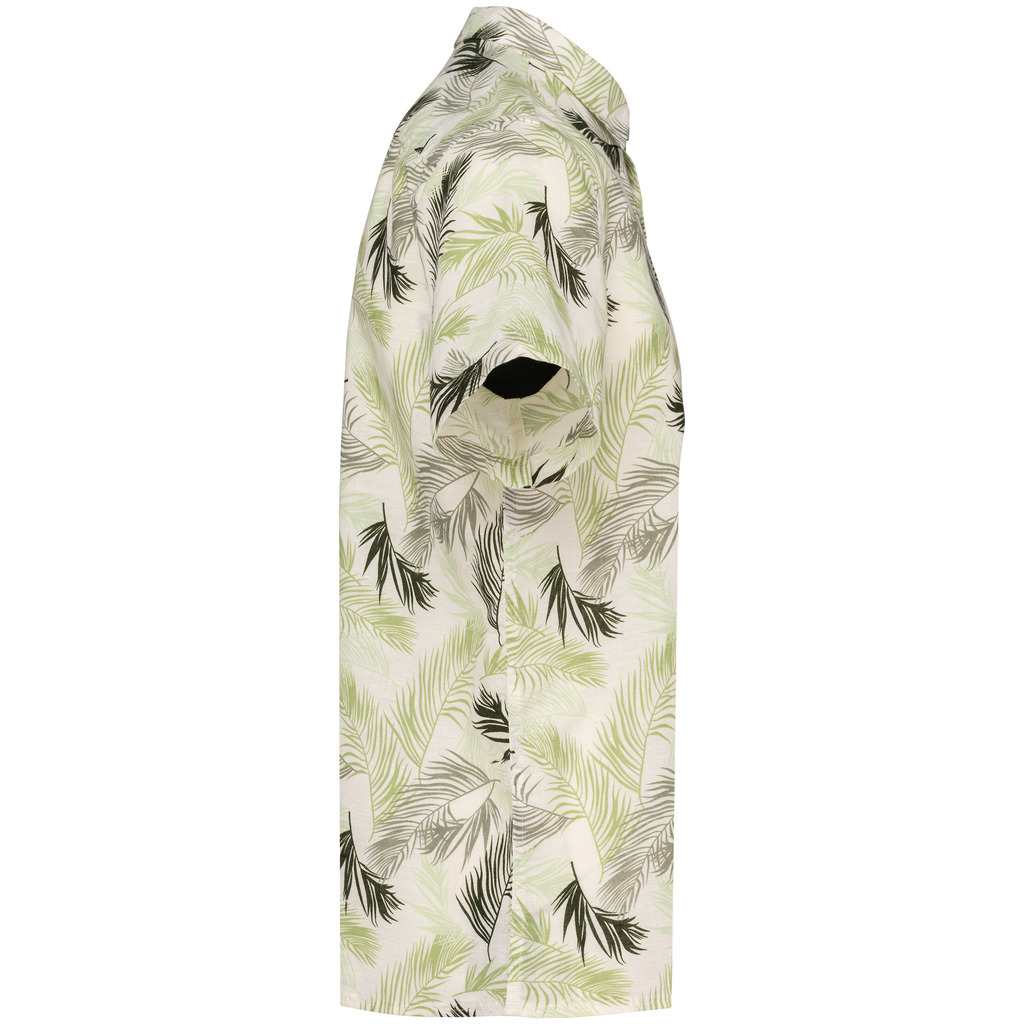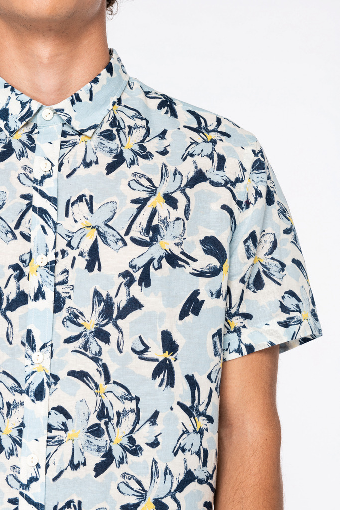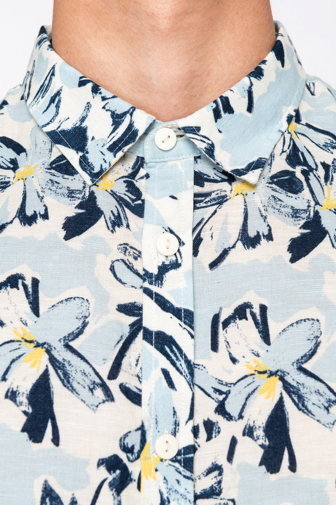 62% linho / 38% algodão biológico. Tecida. Corte justo. Costuras laterais. Colarinho da camisa com suportes. Carcela com botões em contraste. Padrão contÃnuo. Encaixe nas costas. Ombros e cavas com pesponto duplo. Costura dupla nos punhos e na bainha. Peça lavada após montagem: as cores podem variar ligeiramente de produto para produto.
