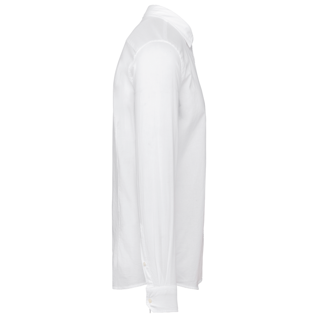 100% algodão biológico IC2 (em conversão)*. Fabricada em Portugal. Corte justo. Popeline de algodão leve. Botões em plástico reciclado. Colarinho com suporte. Encaixe na parte de cima das costas. Carcela traseira com botões tom sobre tom com efeito nacarado. Carcela com botões nos punhos. Costuras laterais e nos punhos com pesponto duplo. Costura simples no cós. Peça lavada após produção: as cores podem variar ligeiramente.