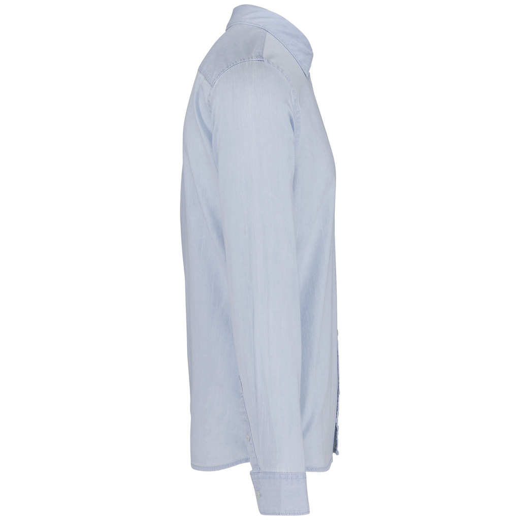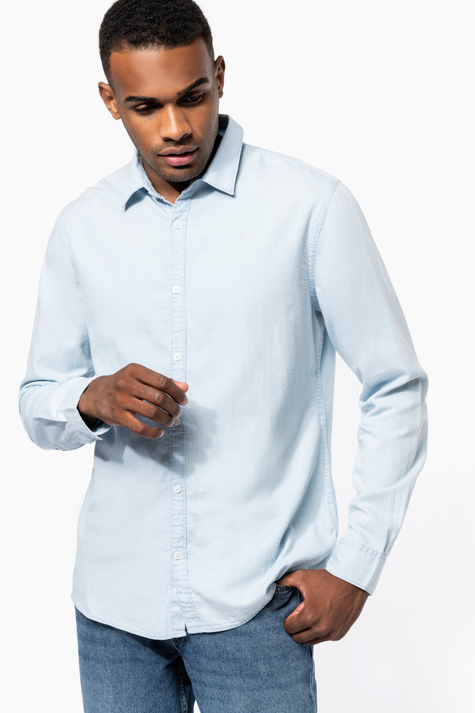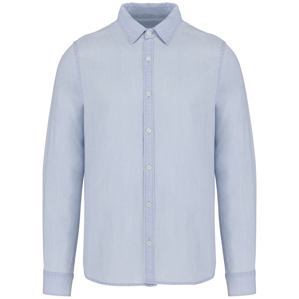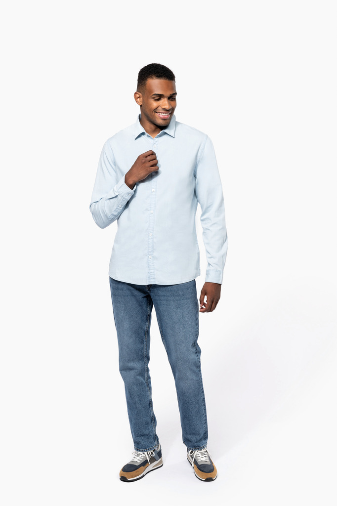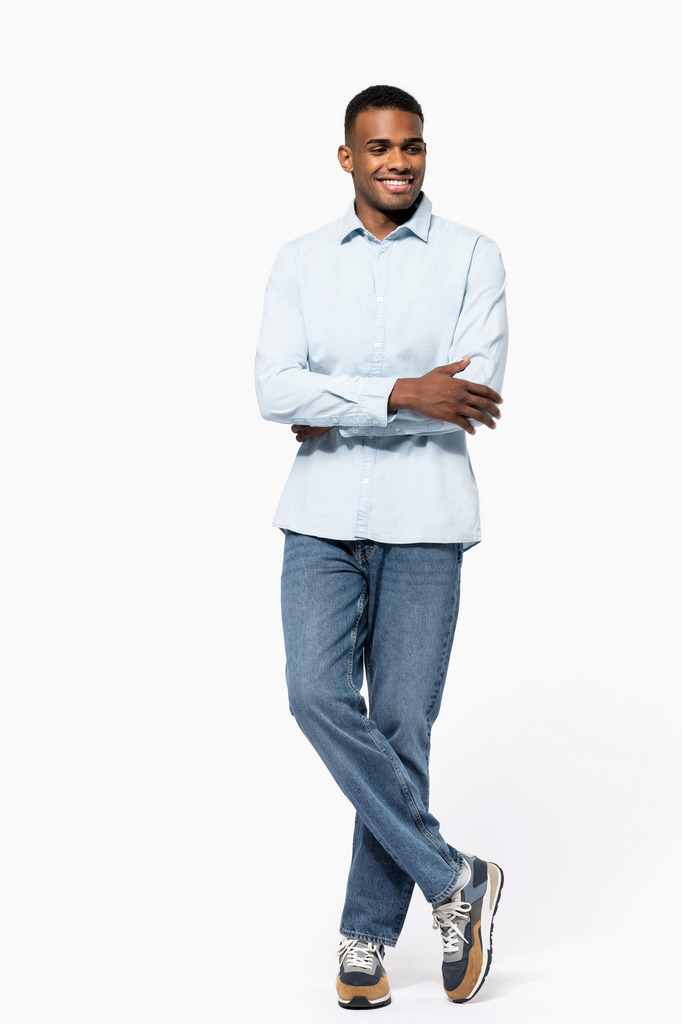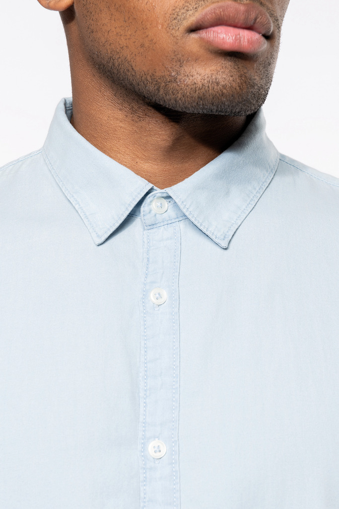 100% algodão biológico. Algodão penteado. Corte justo. Carcela clássica com botões com efeito nacarado. Pinça nas costas para look descontraÃdo. Carcela da manga com botão.