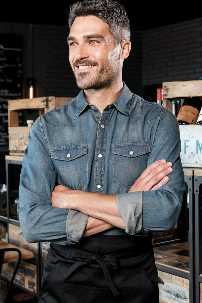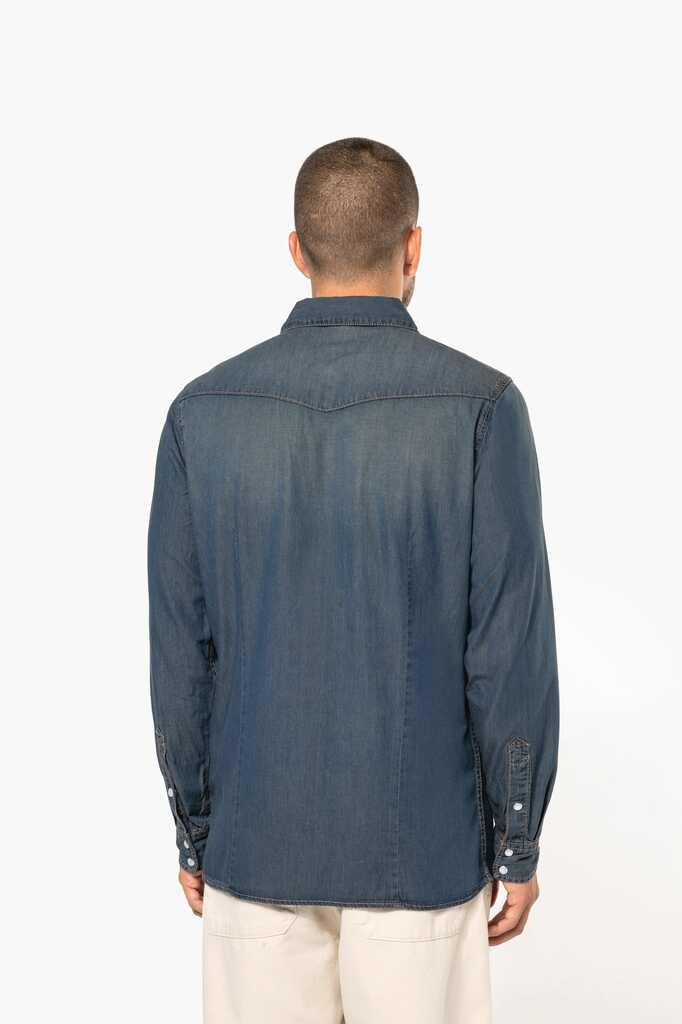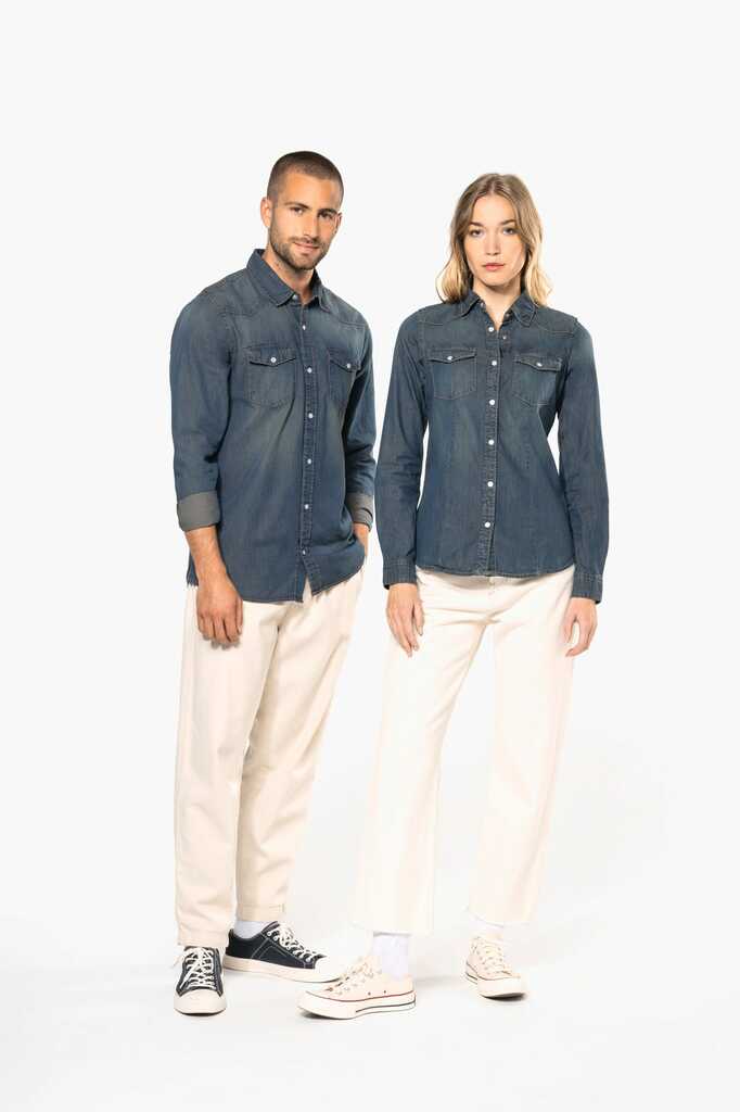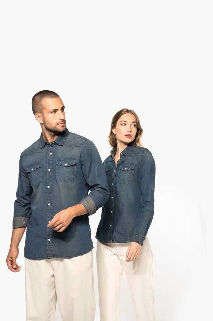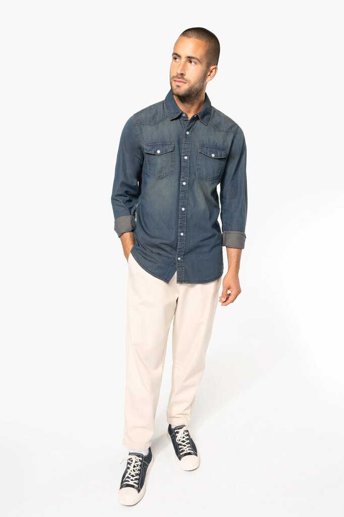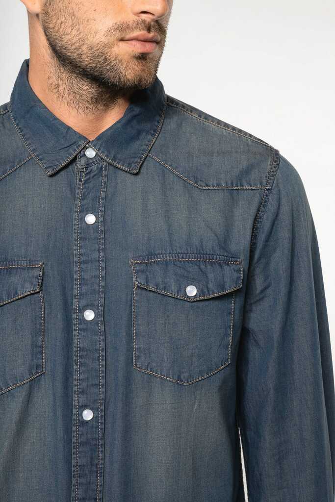 100% Algodão. Camisa em tecido lavado com enzimas. Corte justo. Molas de pressão fantisia. 2 bolsos frontais com pala e molas. Punhos com molas. Bainha arredondada. Peça fornecida com etiqueta sem marca, contendo apenas indicação de tamanho para facilitar a personalização. Este produto foi submetido a um tratamento especial e apresenta um aspecto intencionalmente envelhecido. Este procedimento implica variações de cor de produto para produto, o que torna cada peça única.