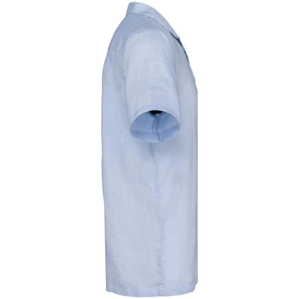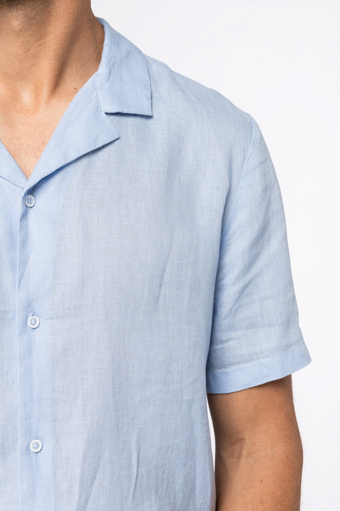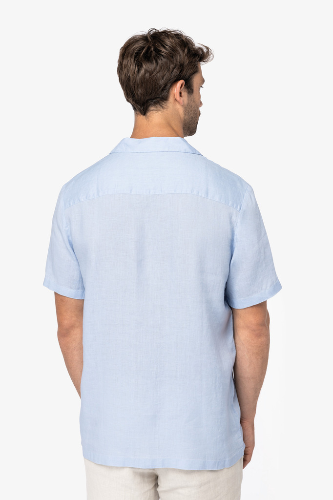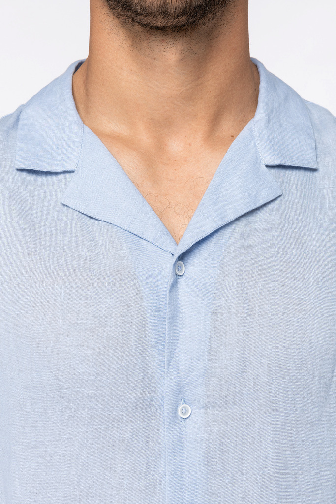 100% linho. Tecida. Corte justo. Colarinho bowling. Encaixe nas costas. Bainha simples nos punhos e na parte inferior da peça. Carcela com botões em contraste efeito nacarado em plástico reciclado com recobrimento no interior. Peça lavada após montagem, as cores podem variar de produto para produto.
