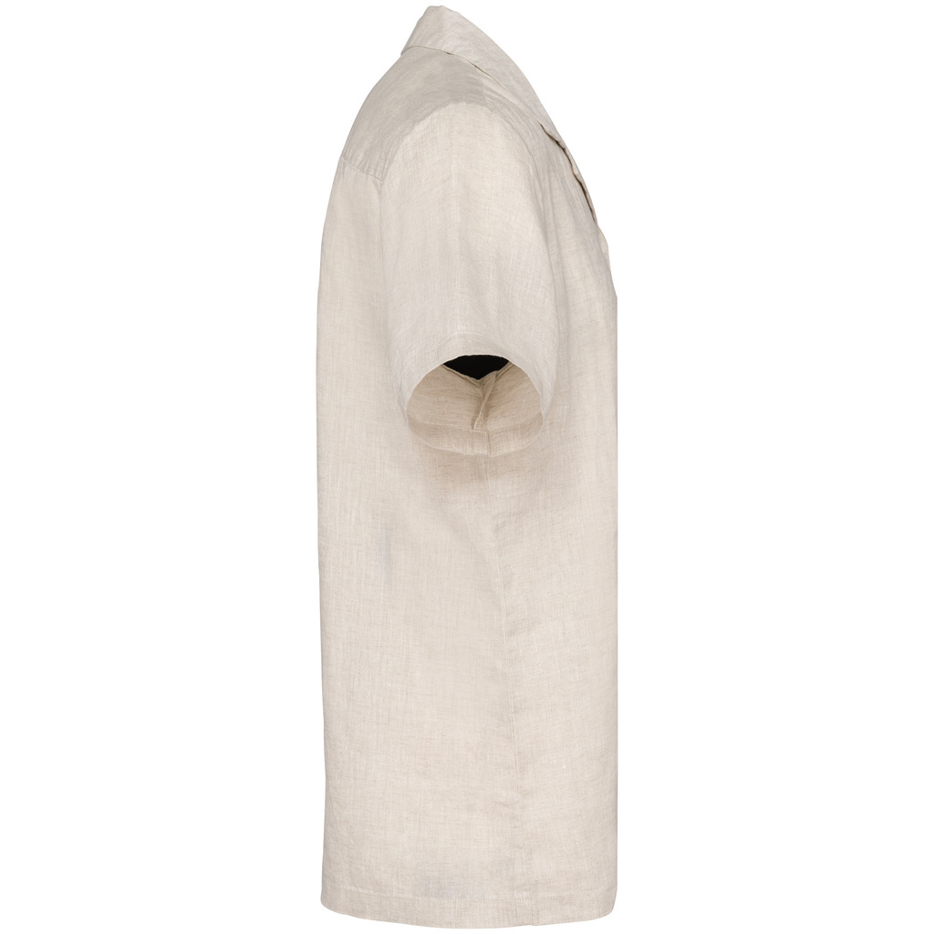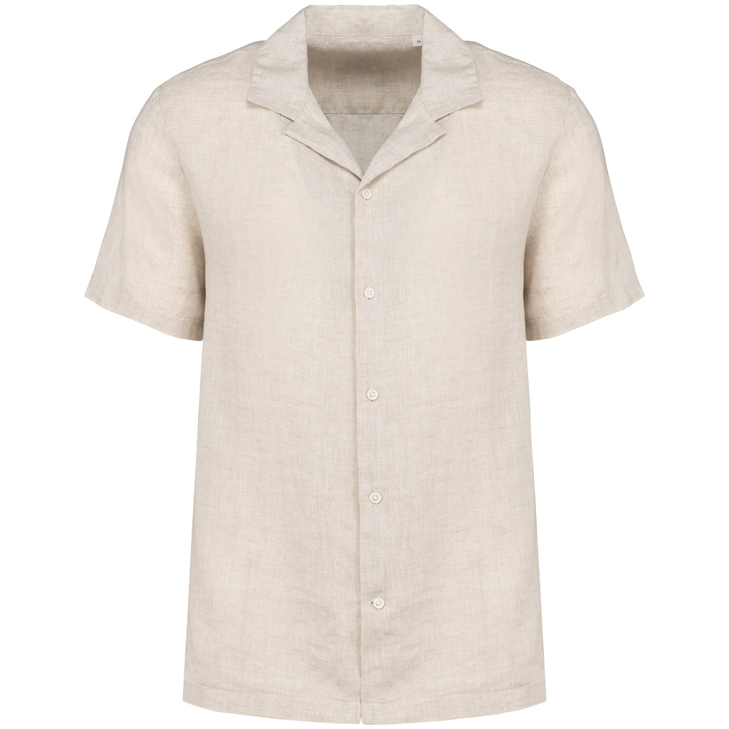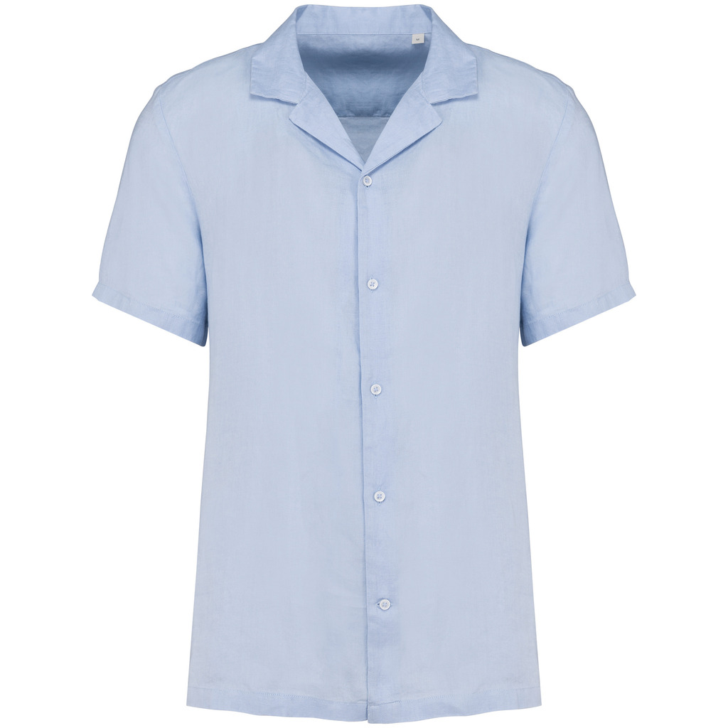 100% linho. Tecida. Corte justo. Colarinho bowling. Encaixe nas costas. Bainha simples nos punhos e na parte inferior da peça. Carcela com botões em contraste efeito nacarado em plástico reciclado com recobrimento no interior. Peça lavada após montagem, as cores podem variar de produto para produto.