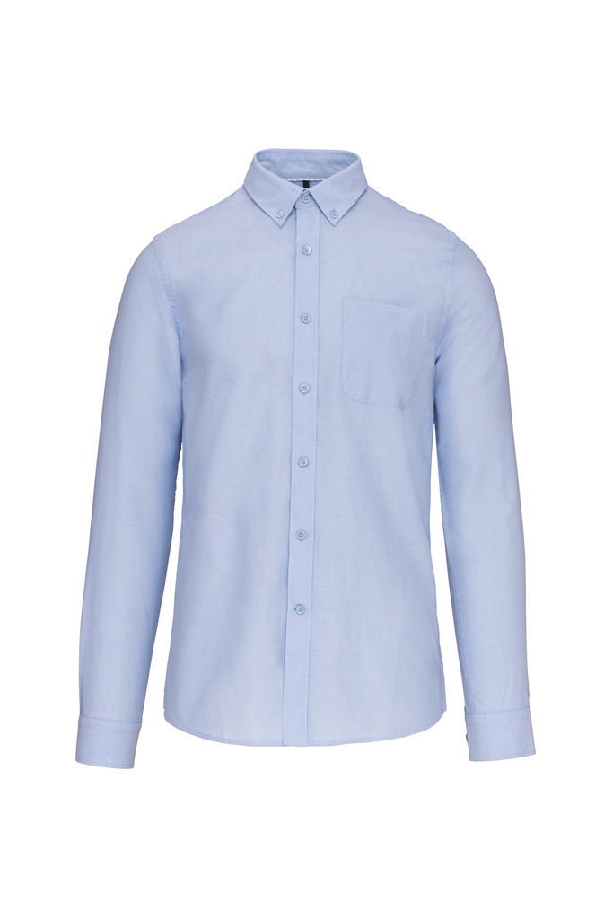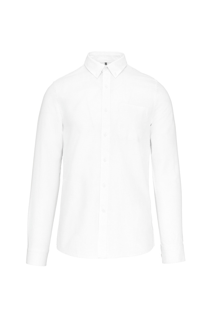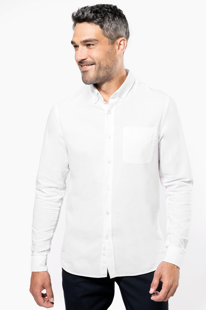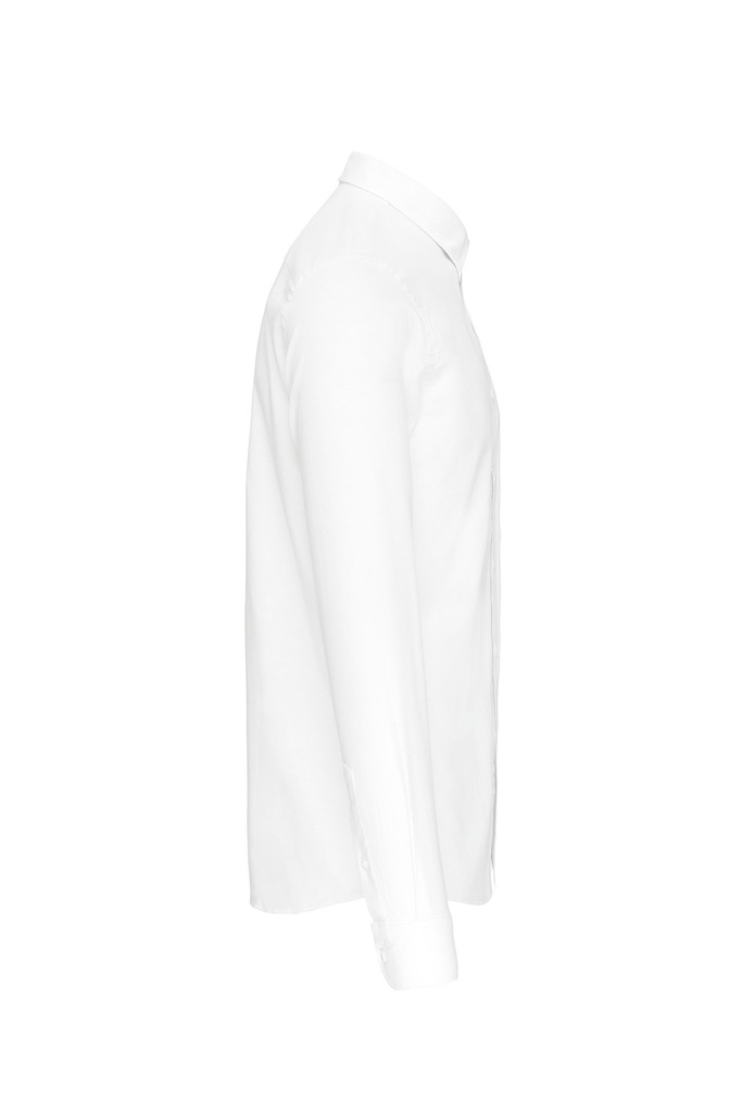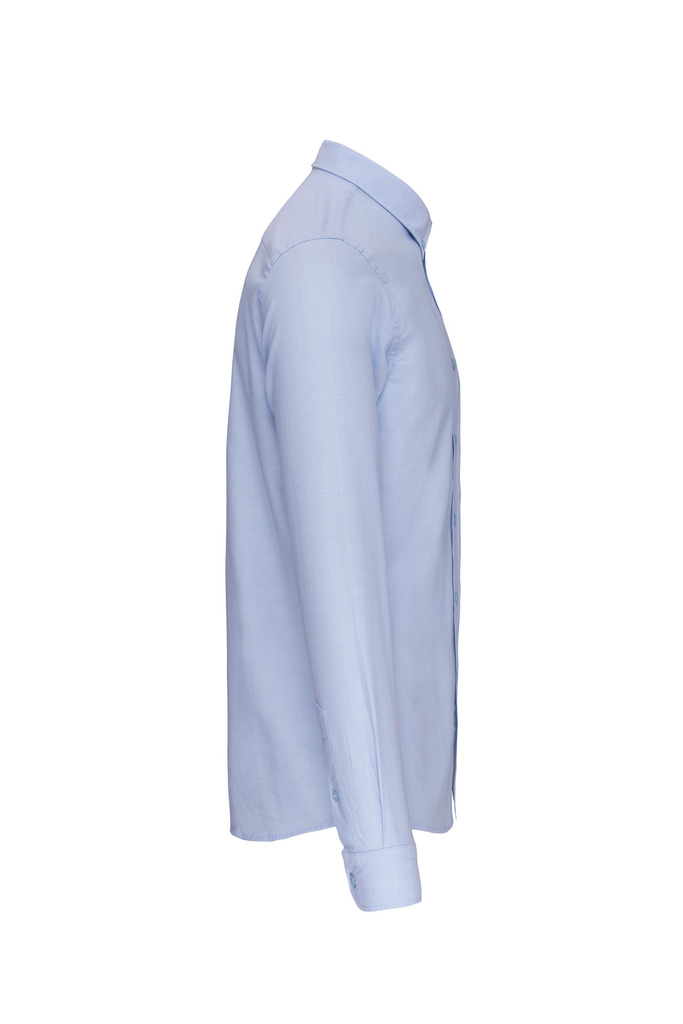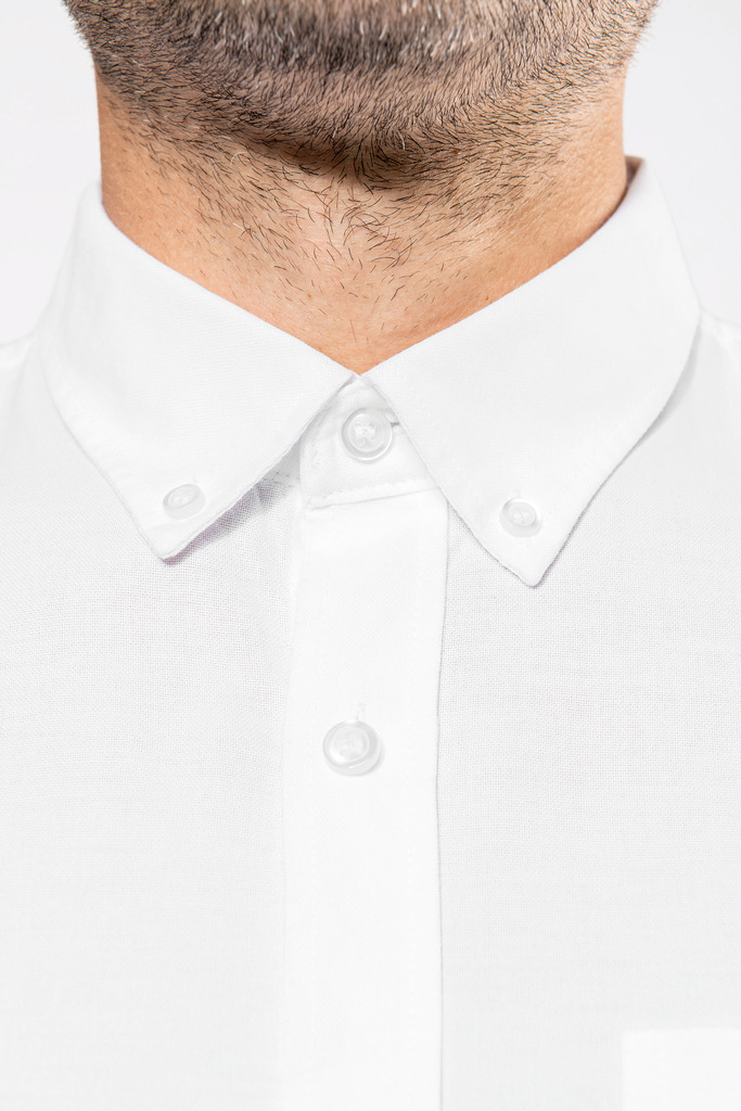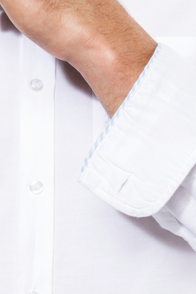 100% algodão. Corte justo. Botões no colarinho. Contraste no interior do colarinho e dos punhos. Botões à cor. Bolso no peito esquerdo. Punhos de cantos arredondados, ajustáveis com botão duplo. 2 botões extra. Bainha arredondada.