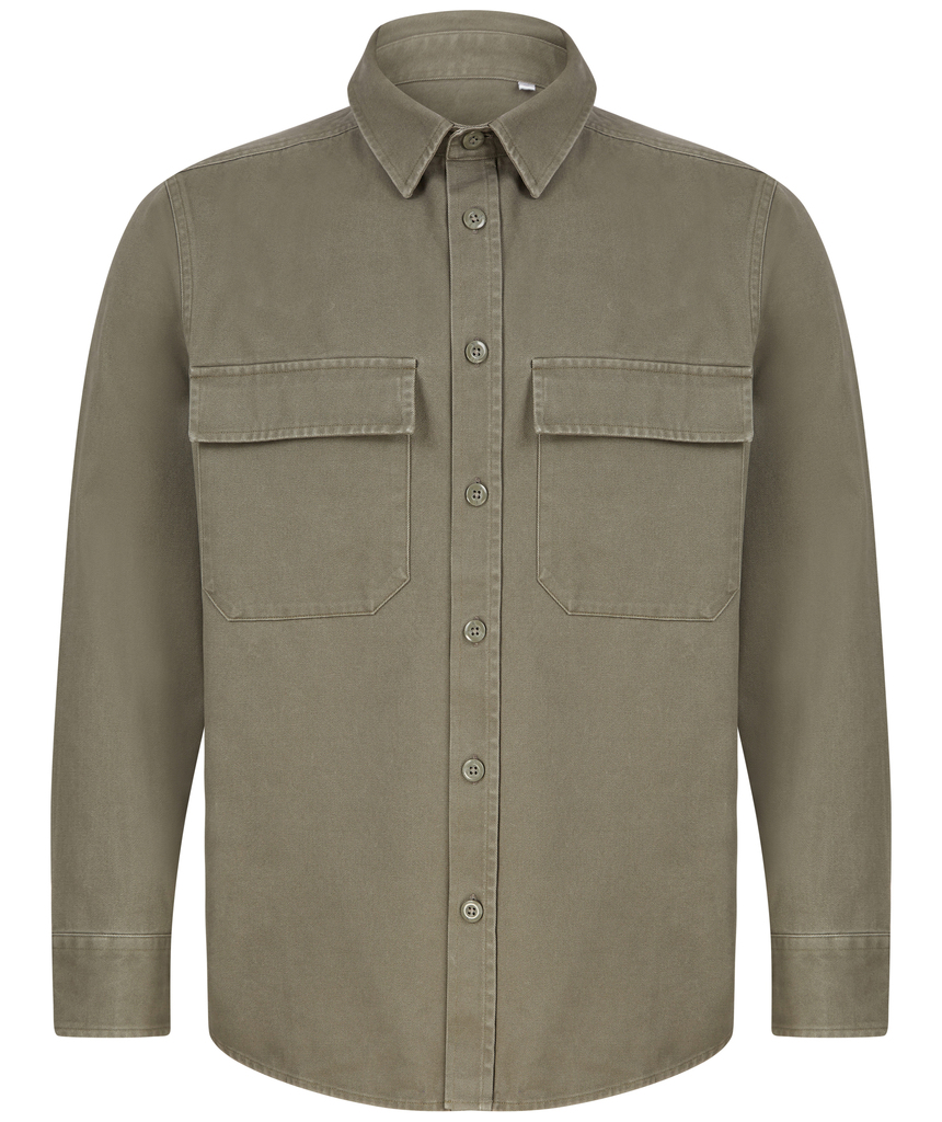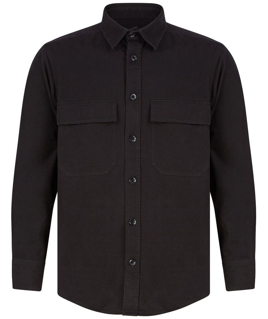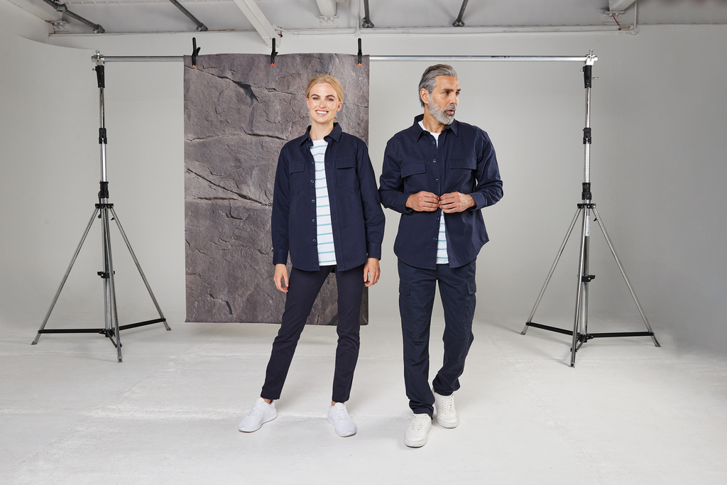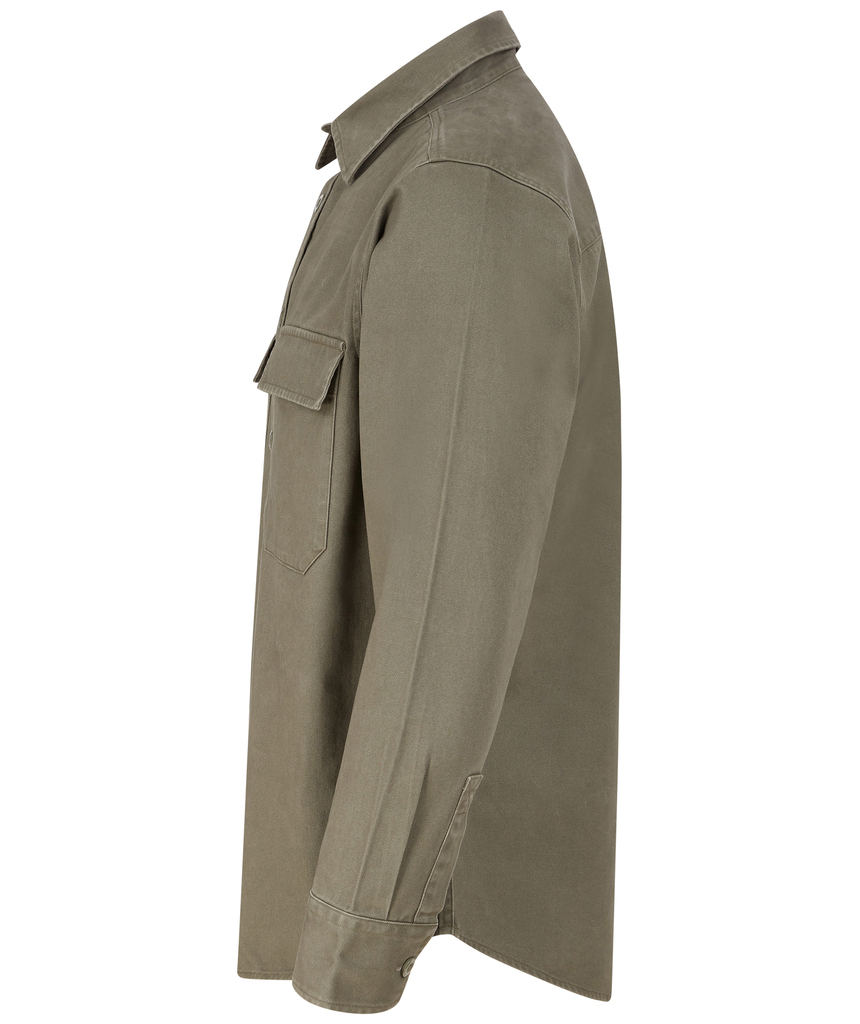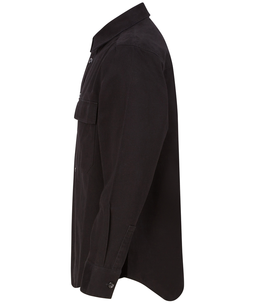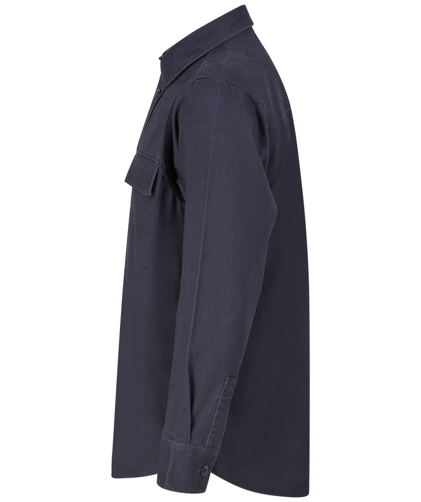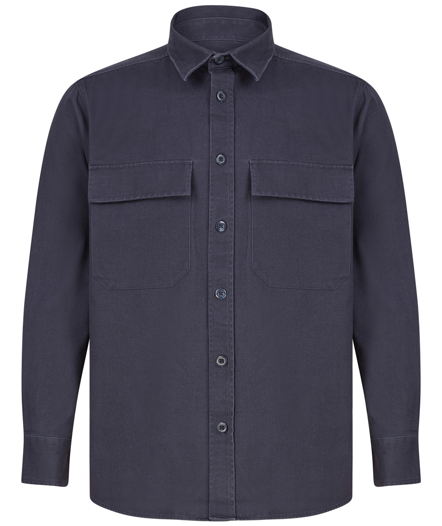 100% algodão. Camisa forrada com encaixe nas costas. Pesponto duplo. Bolsos frontais com pala.