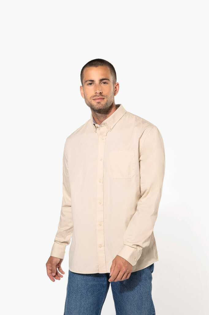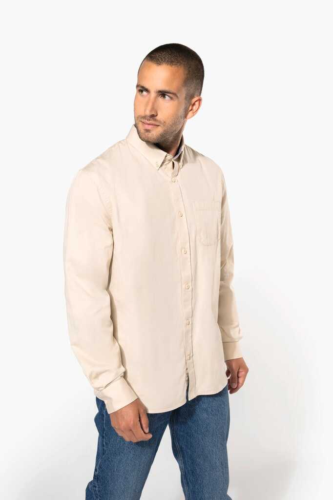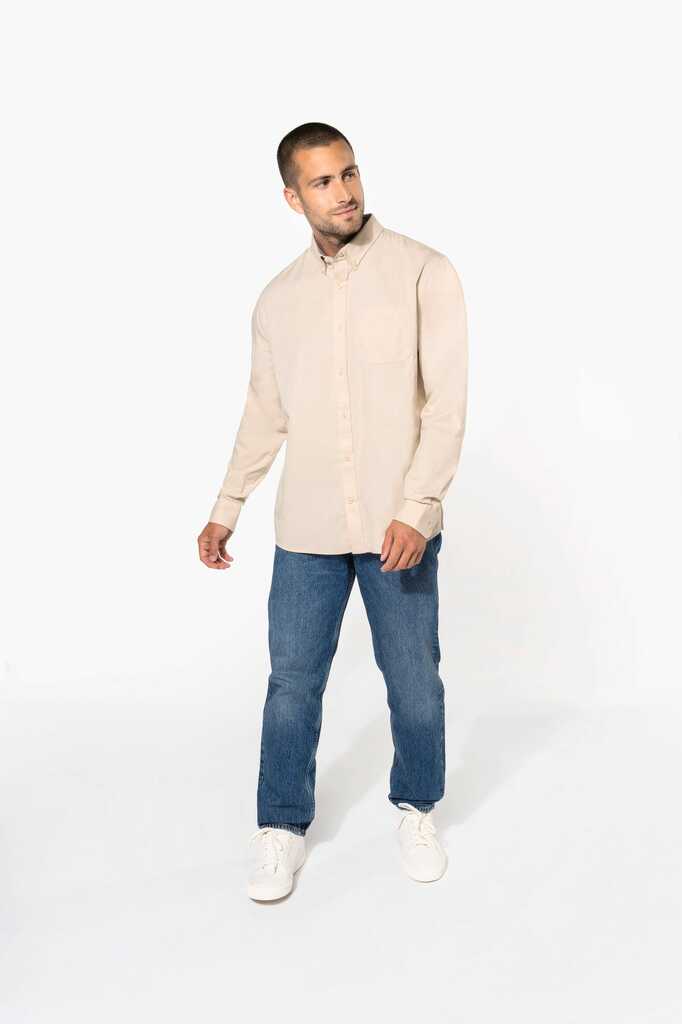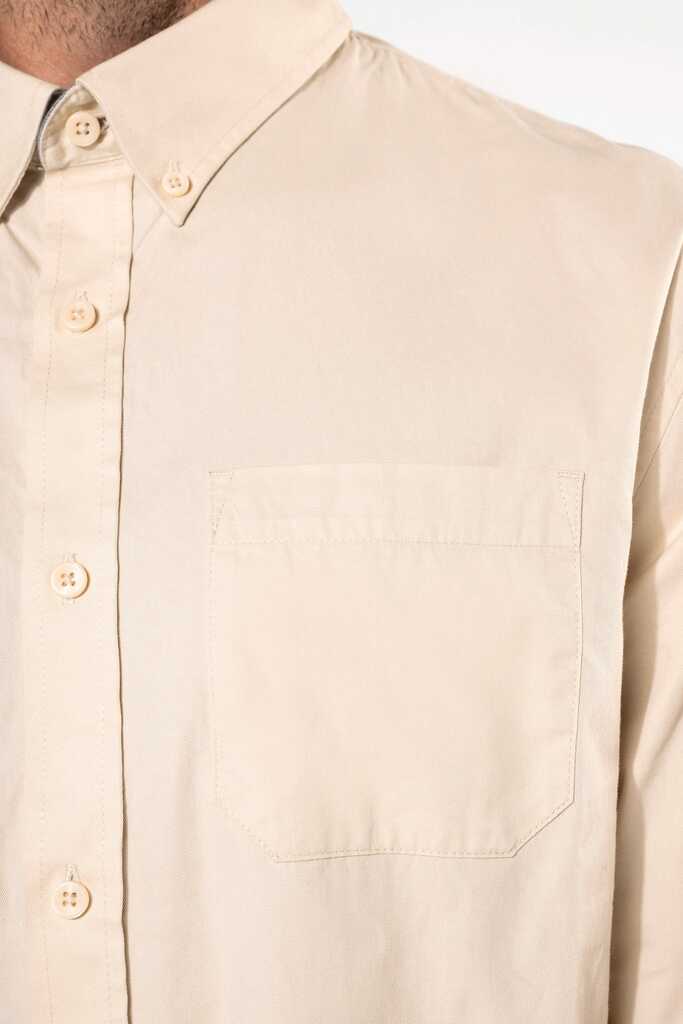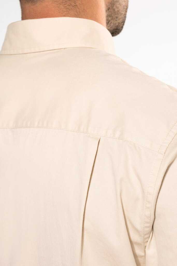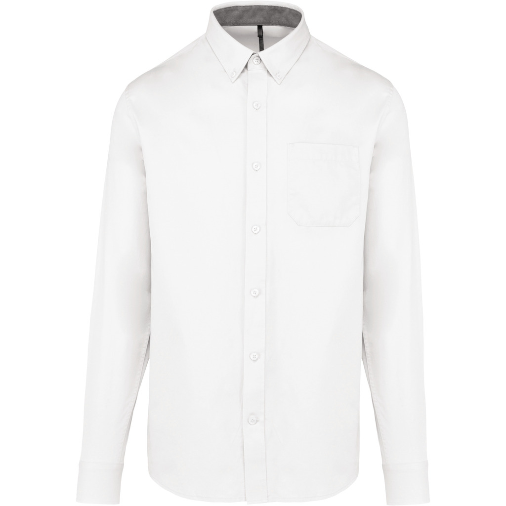 100% algodão. Tecido em sarja e com toque de pele de pêssego. Colarinho com botão. Botões à cor. Bolso no peito no esquerdo. Interior do colarinho e punhos em contraste na cor Oxford silver. 2 pregas nas costas com presilha. Punho ajustável com botões. Botão extra.