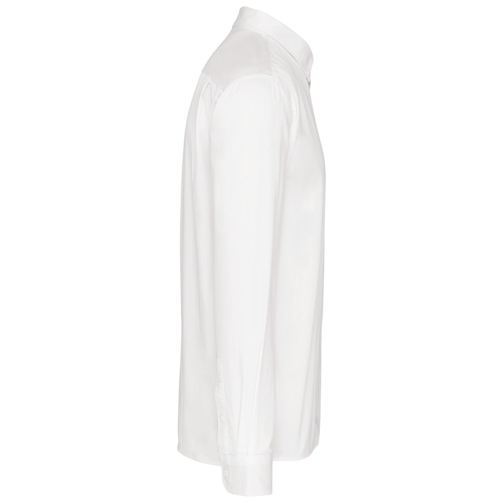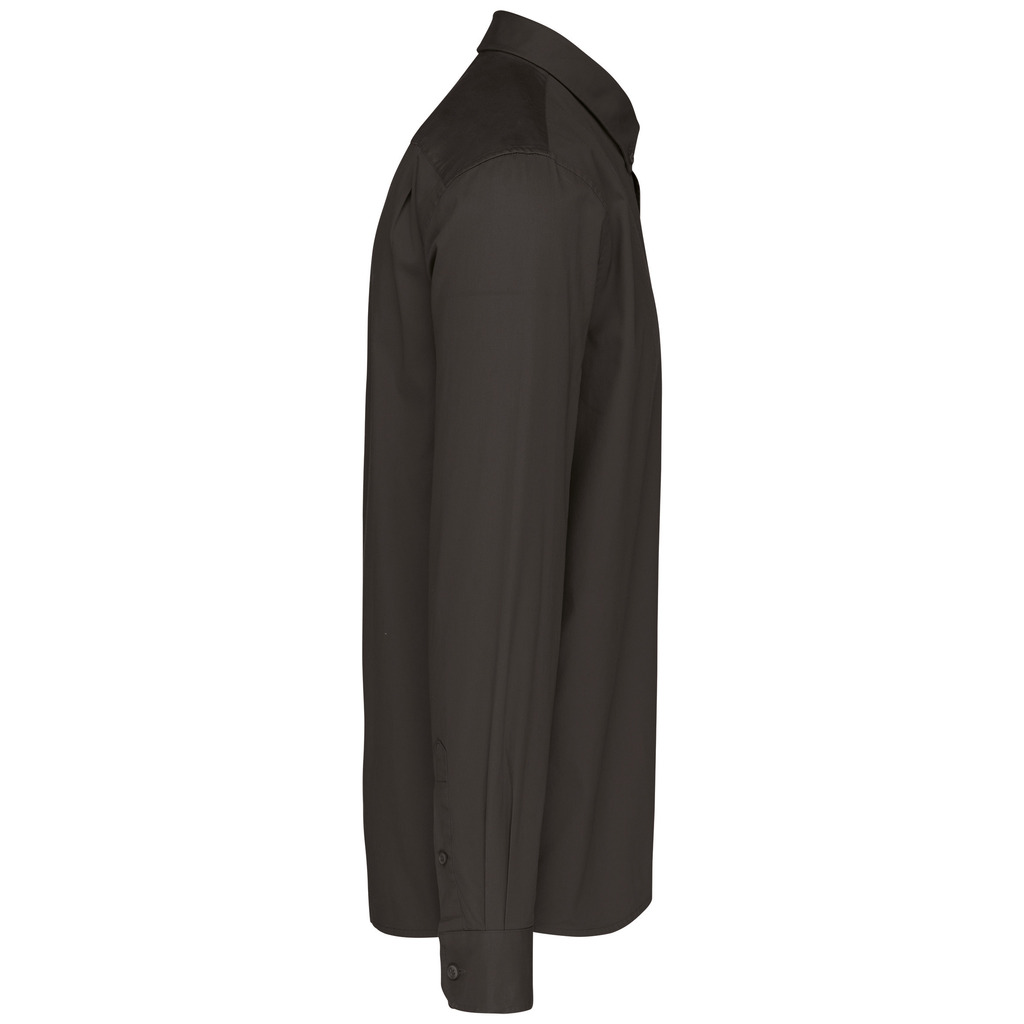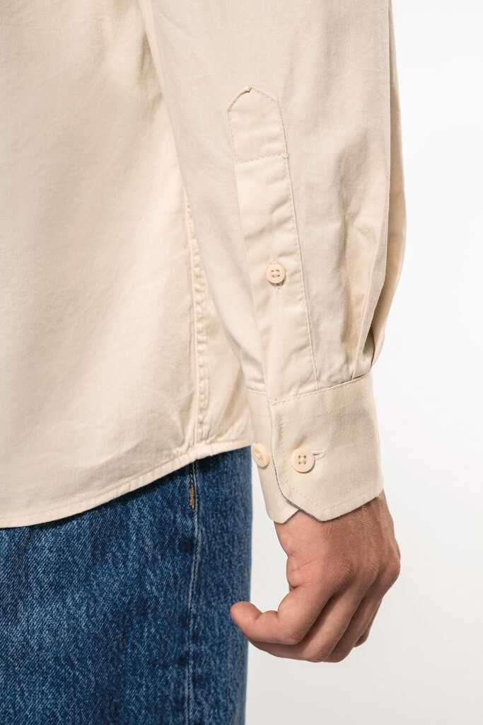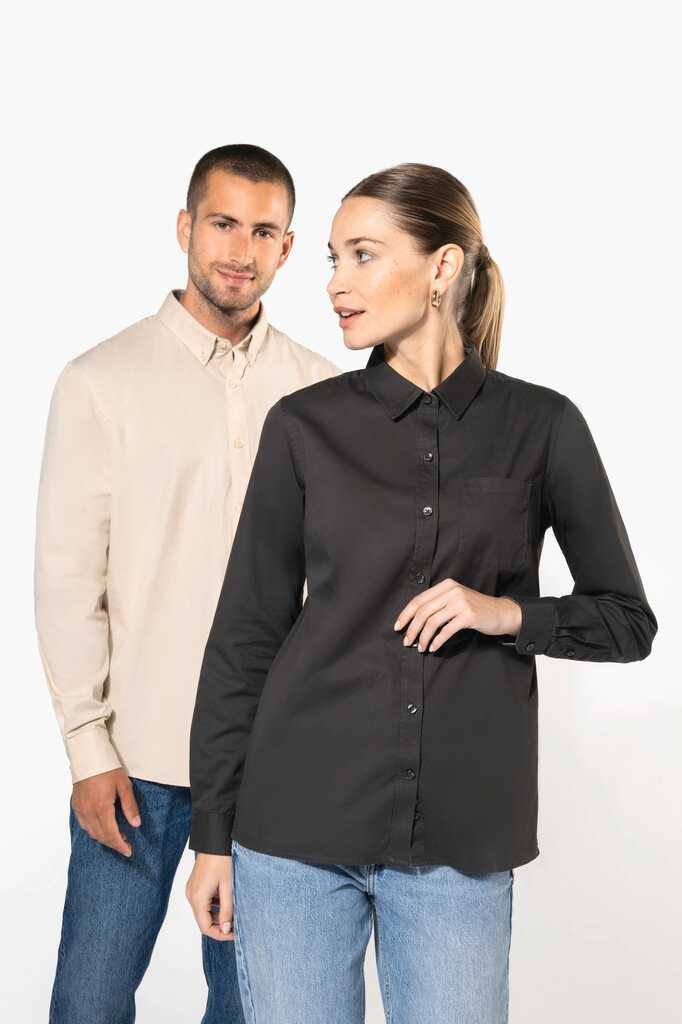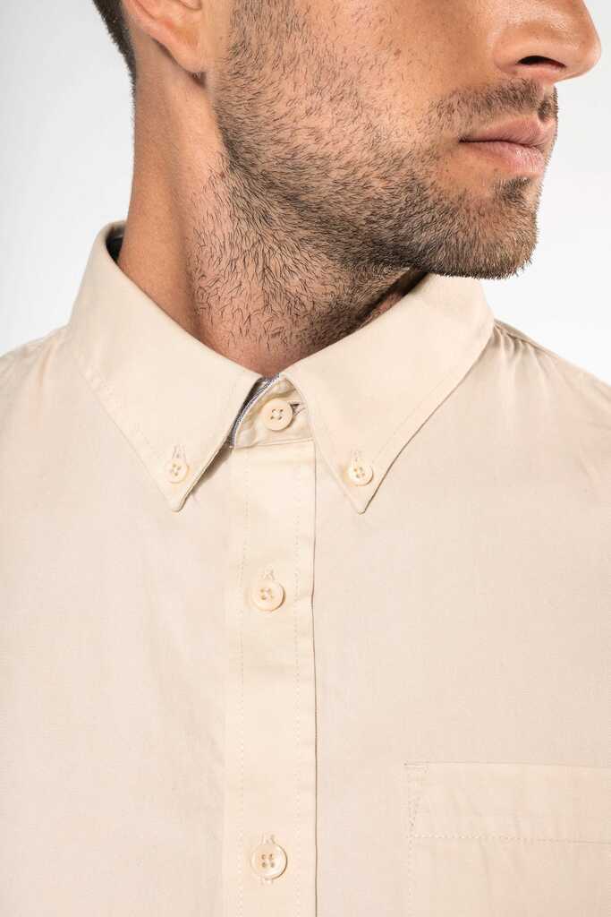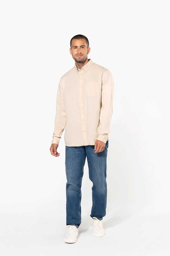 100% algodão. Tecido em sarja e com toque de pele de pêssego. Colarinho com botão. Botões à cor. Bolso no peito no esquerdo. Interior do colarinho e punhos em contraste na cor Oxford silver. 2 pregas nas costas com presilha. Punho ajustável com botões. Botão extra.