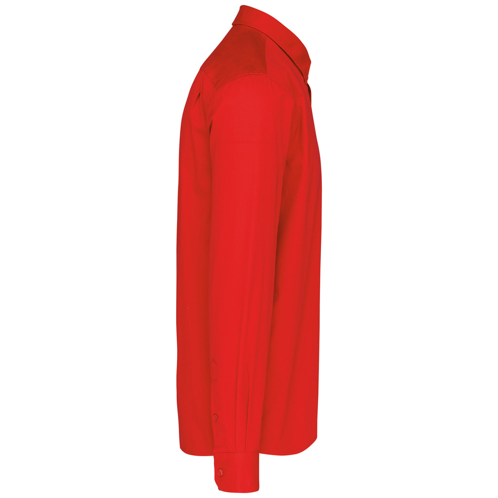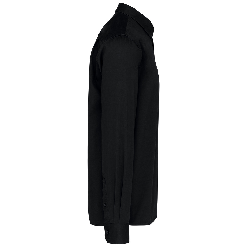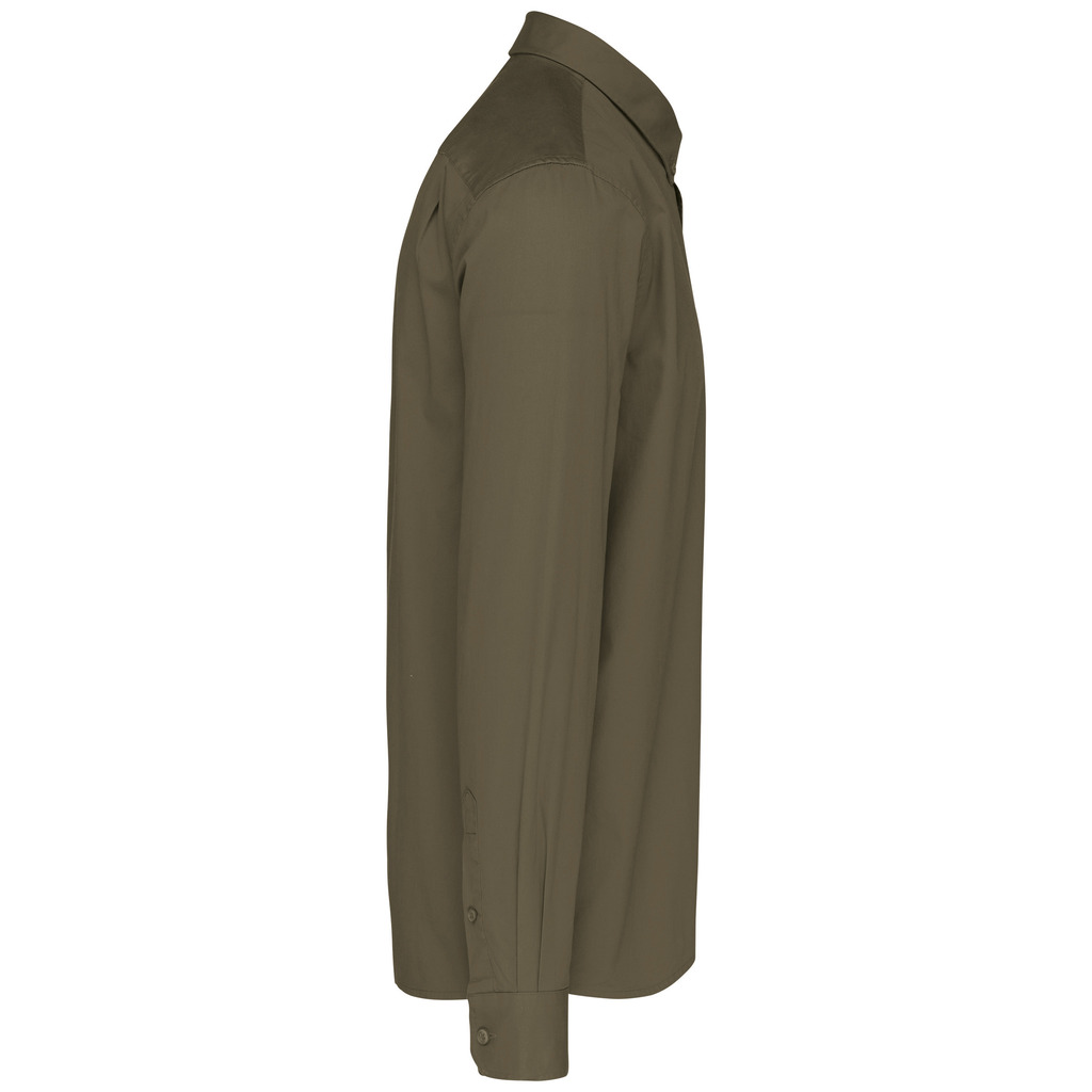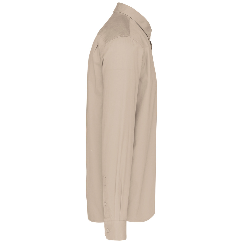 100% algodão. Tecido em sarja e com toque de pele de pêssego. Colarinho com botão. Botões à cor. Bolso no peito no esquerdo. Interior do colarinho e punhos em contraste na cor Oxford silver. 2 pregas nas costas com presilha. Punho ajustável com botões. Botão extra.