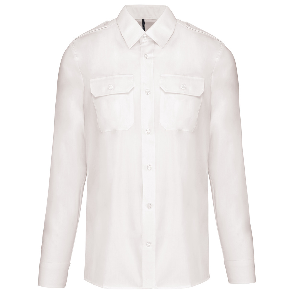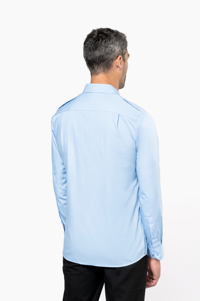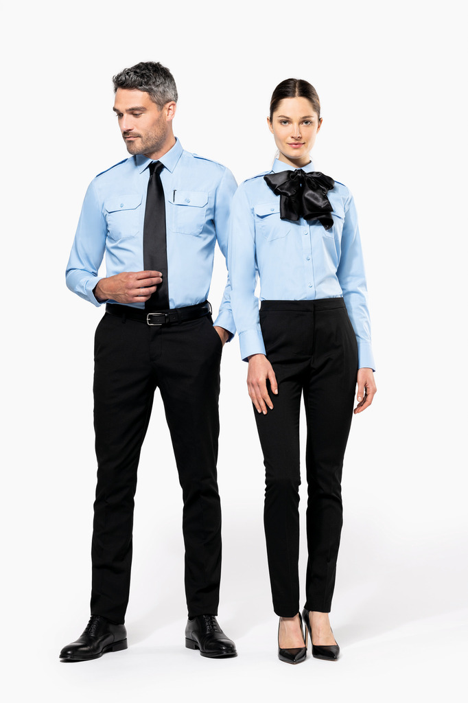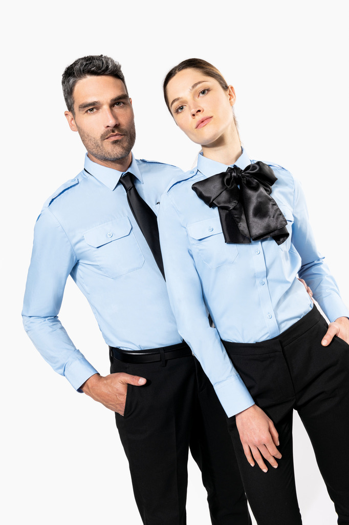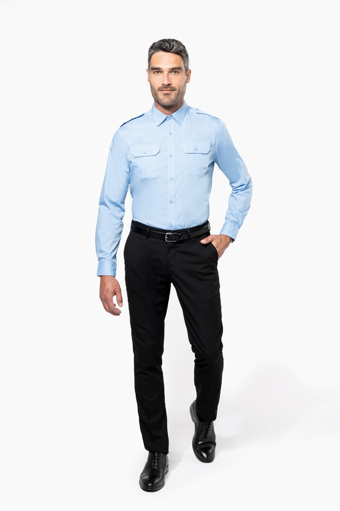 65% poliéster / 35% algodão. Tecido popeline. Tratamento fácil (Easy Care). Botões à cor. 2 bolsos frontais com pala, um deles com espaço para caneta no lado esquerdo. Prega nas costas. Aba com botão nos ombros para aplicação dos galões (galões não incluÃdos). Punhos reguláveis.