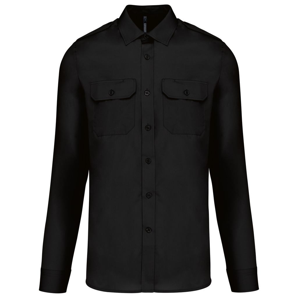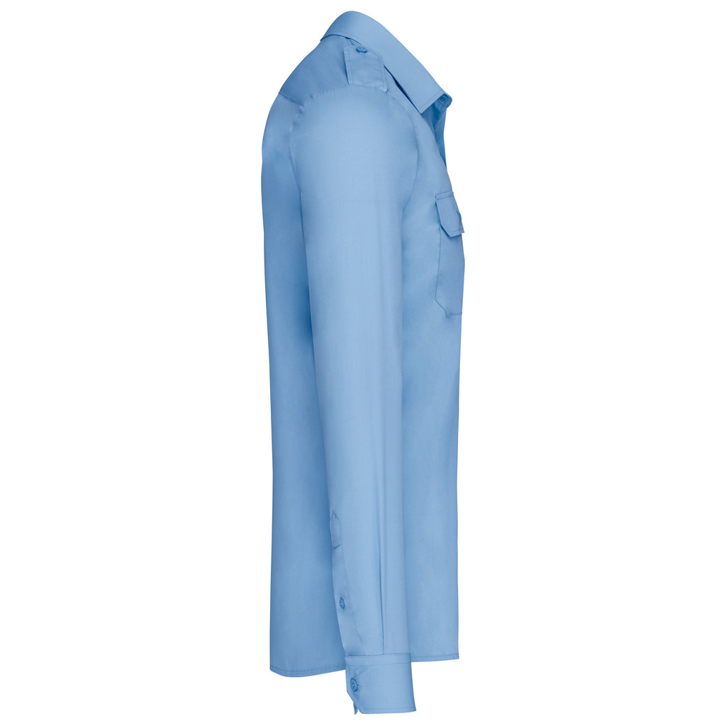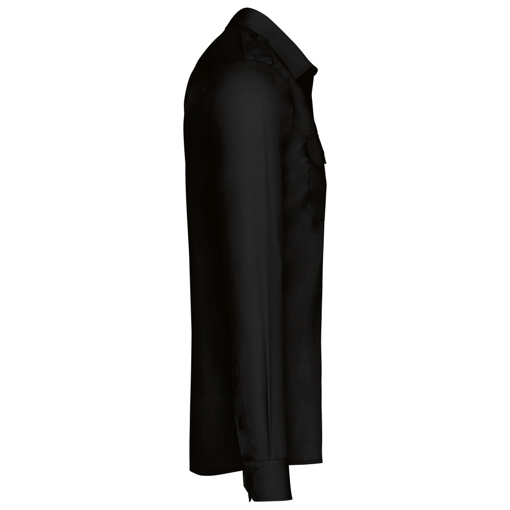 65% poliéster / 35% algodão. Tecido popeline. Tratamento fácil (Easy Care). Botões à cor. 2 bolsos frontais com pala, um deles com espaço para caneta no lado esquerdo. Prega nas costas. Aba com botão nos ombros para aplicação dos galões (galões não incluÃdos). Punhos reguláveis.