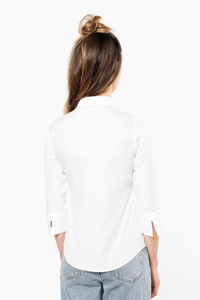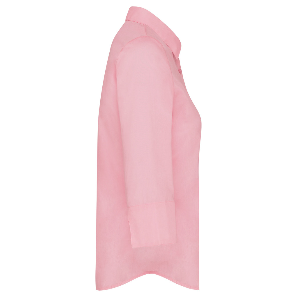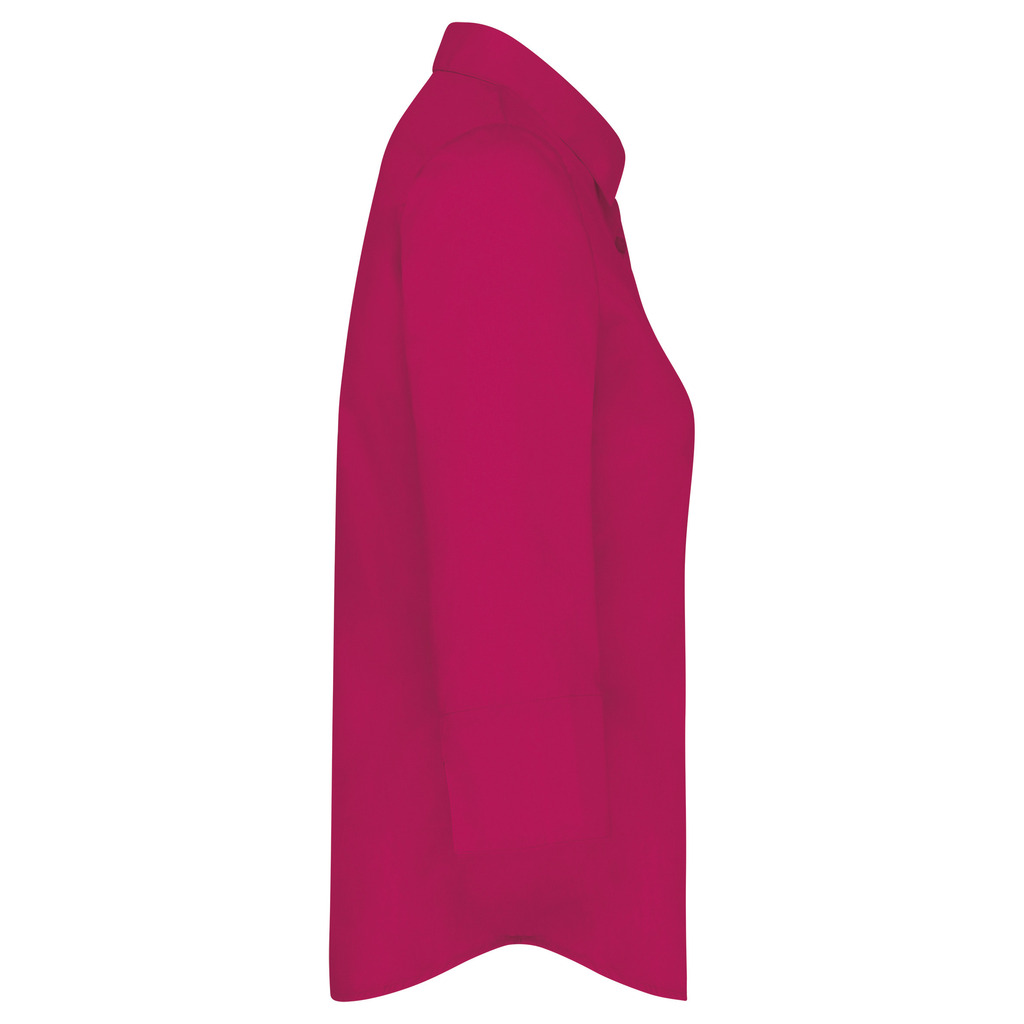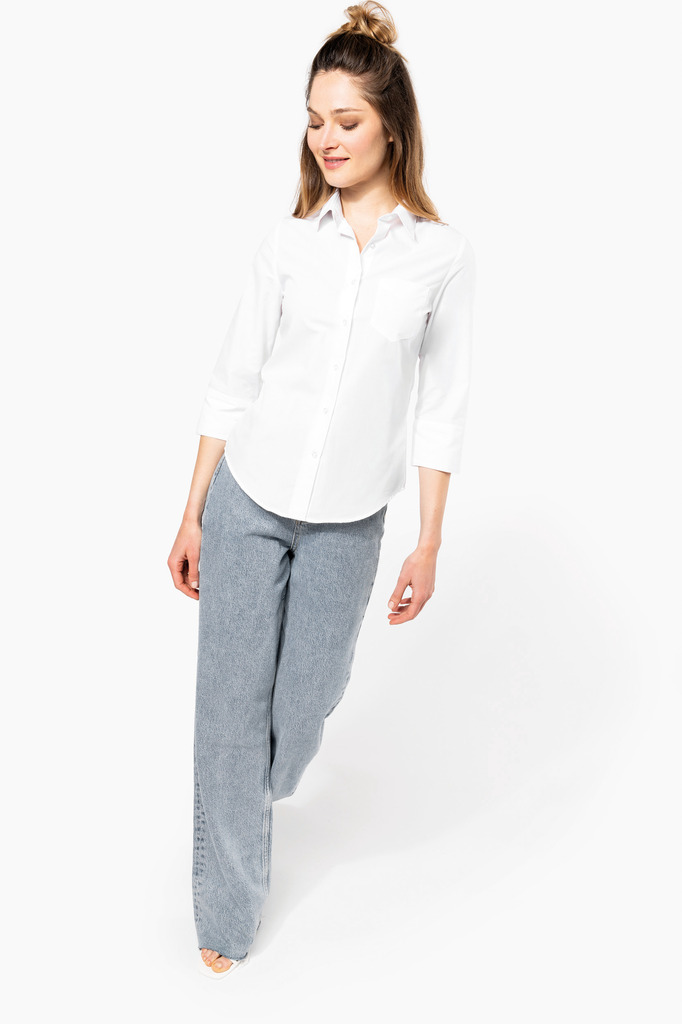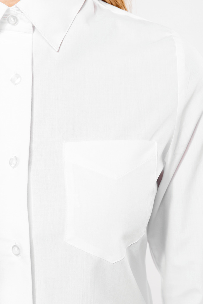 65% poliéster / 35% algodão popeline. Tratamento fácil. Sem botões no colarinho. Botões à cor. Bolso no peito esquerdo com acabamento em V. 1 botão extra. Bainha arredondada.