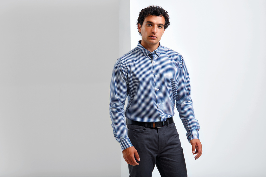 65% poliéster/35% algodão popeline tingido. Camisa de manga comprida com botões nas mangas. Botão de colarinho. Pinça no peito e nas costas. lavagem doméstica a 40°C.