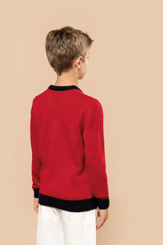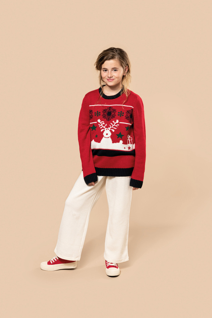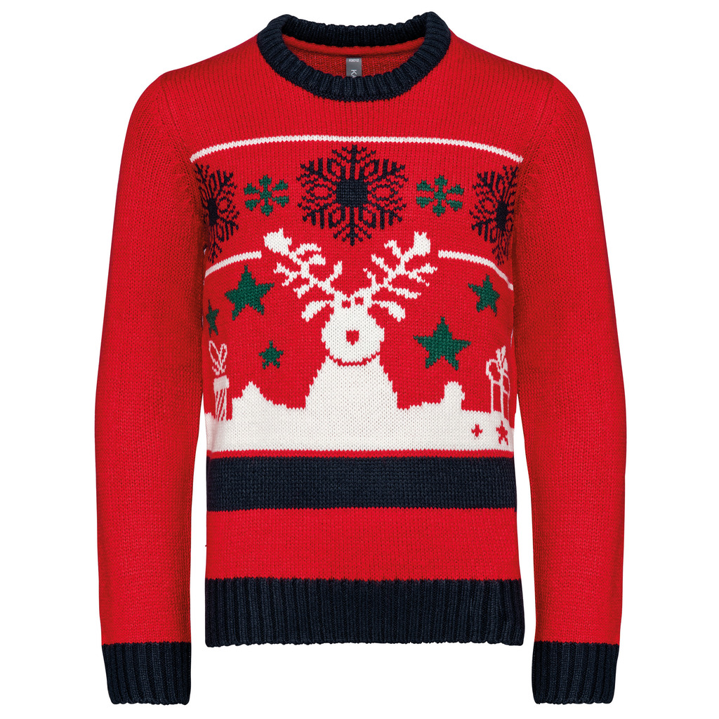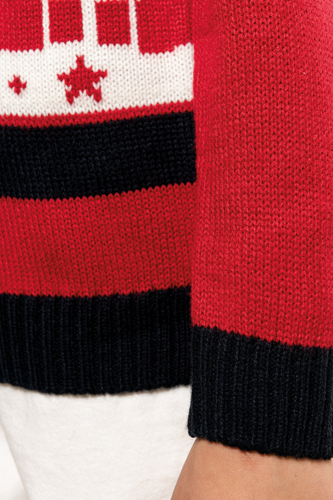 100% acrÃlico. 357g / m². Corte justo. Arqueado 5. Malha intarsia com motivos de Natal na frente, Muito fashion: tricotada na forma e montada na máquina das malhas. Decote redondo. Acabamento malha rib 2 x 2 em contraste no decote, nos punhos e na bainha. Elastano na malha rib nos punhos e na bainha, para evitar que a camisola se deforme. Tapa-costuras tom sobre tom na cor predominante. Sem etiqueta de marca no decote, apenas com indicação de tamanho para facilitar a personalização.