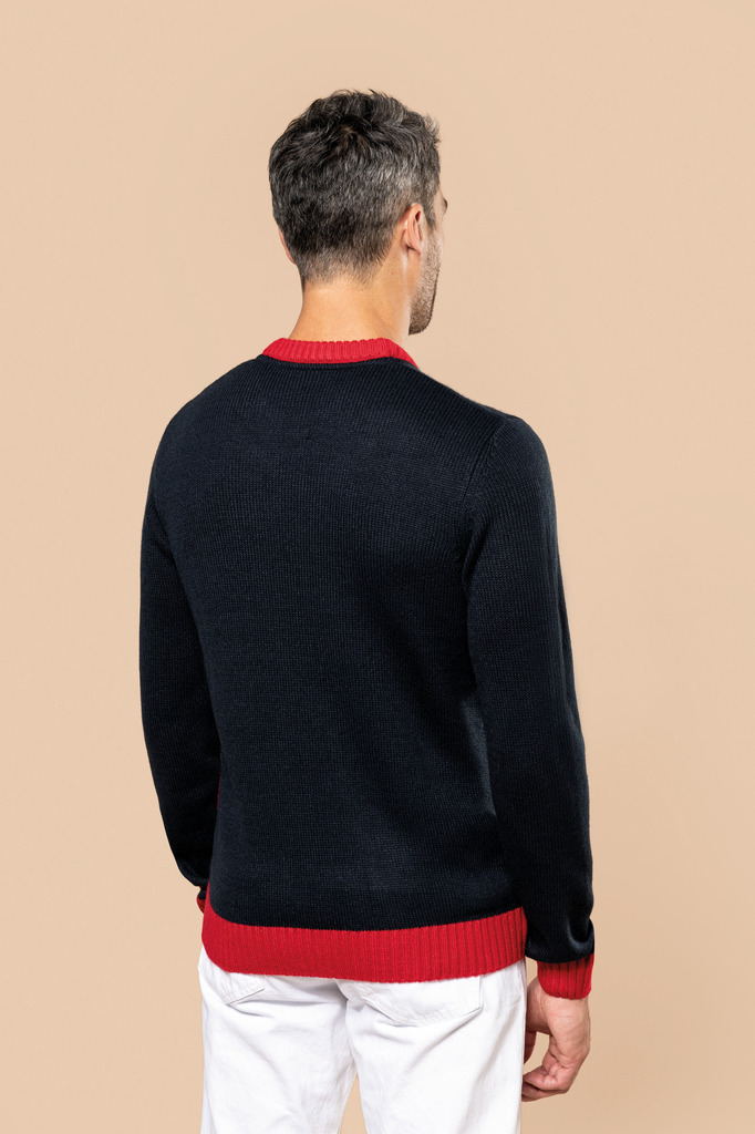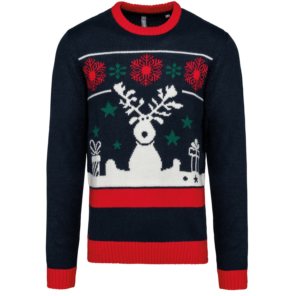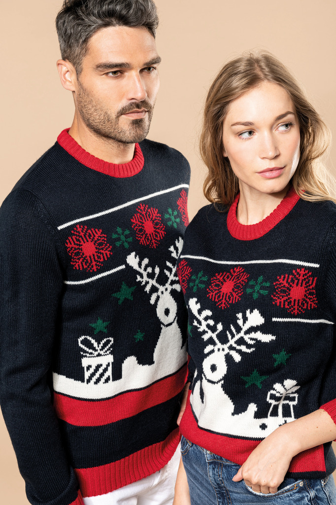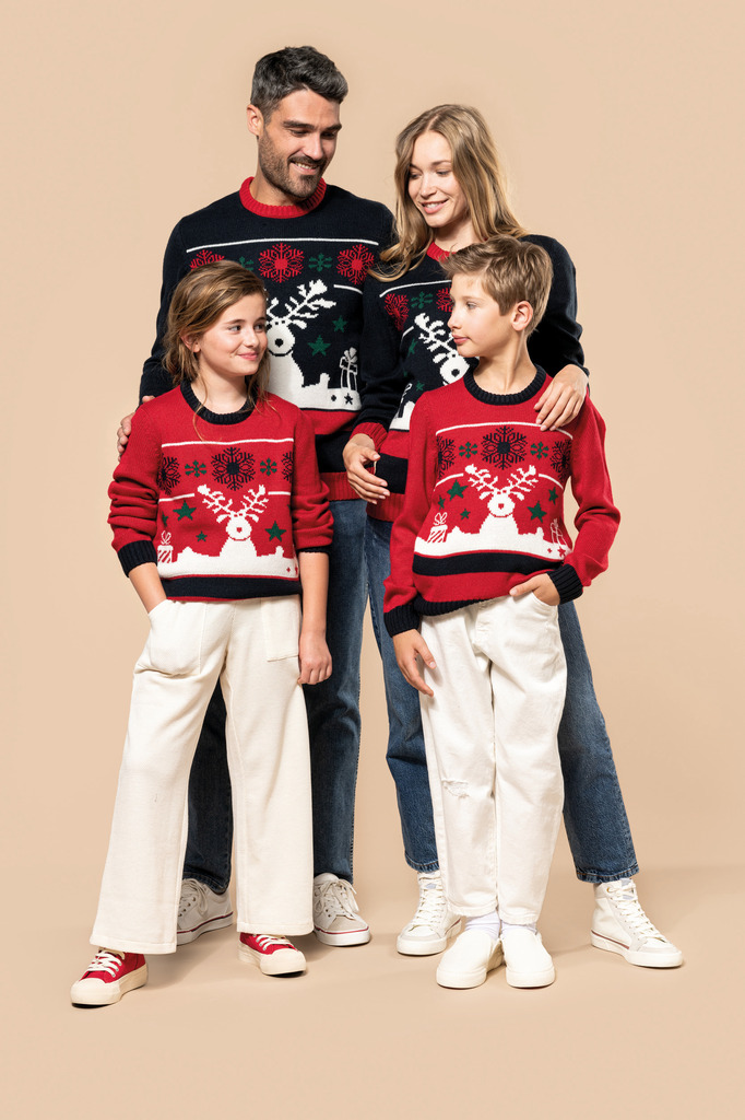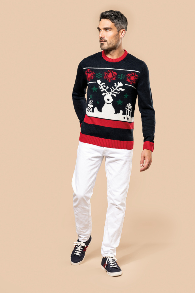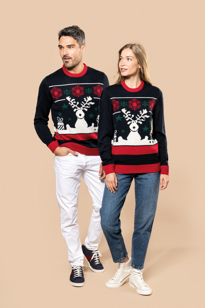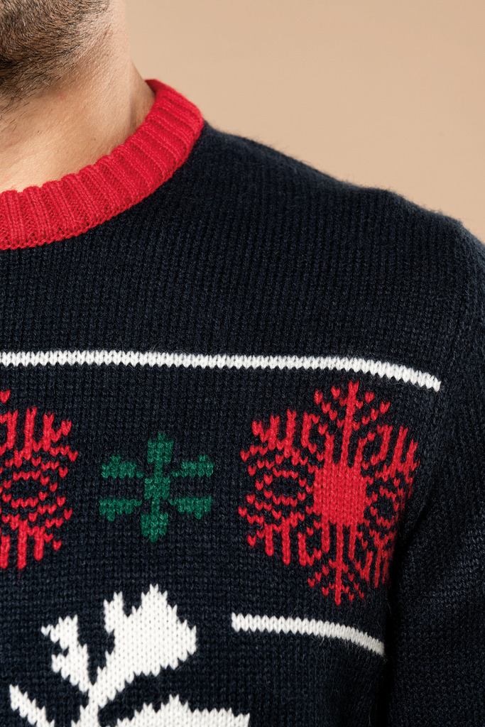 100% acrÃlico. Corte justo. Arqueado 5. Muito fashion: tricotada na forma e montada na máquina das malhas. Malha intarsia com motivos de Natal na frente. Decote redondo. Acabamento malha rib 2 x 2 em contraste no decote, nos punhos e na bainha. Elastano na malha rib nos punhos e na bainha, para evitar que a camisola se deforme. Tapa-costuras tom sobre tom com a cor predominante. Sem etiqueta de marca no decote, apenas com indicação de tamanho para facilitar a personalização.