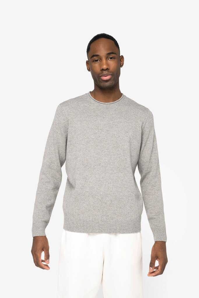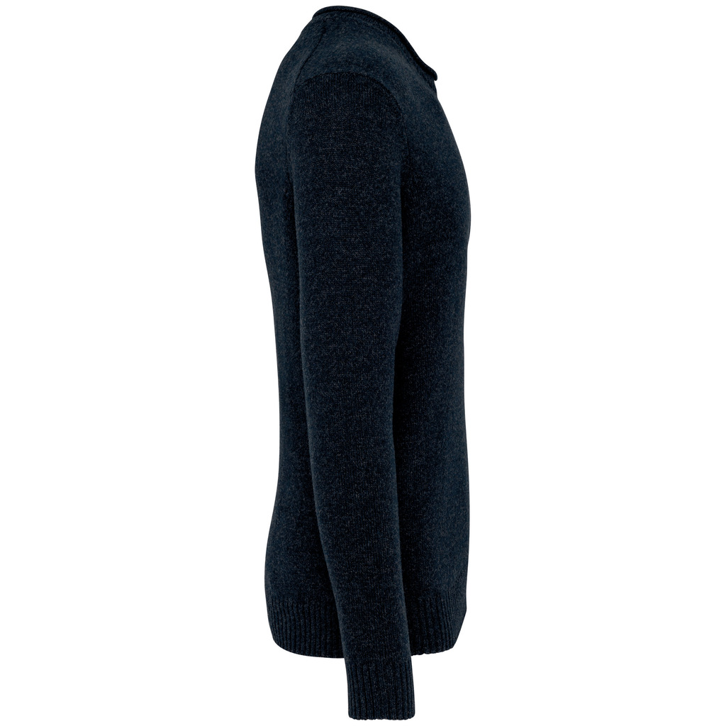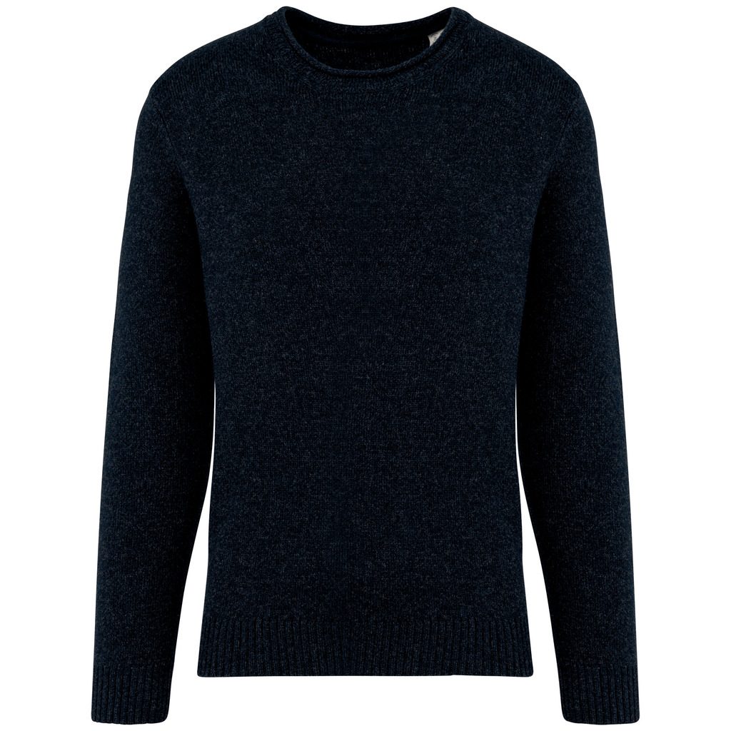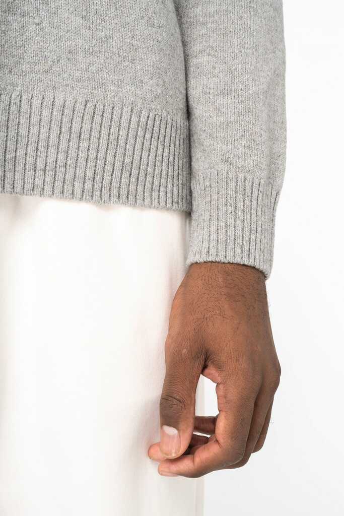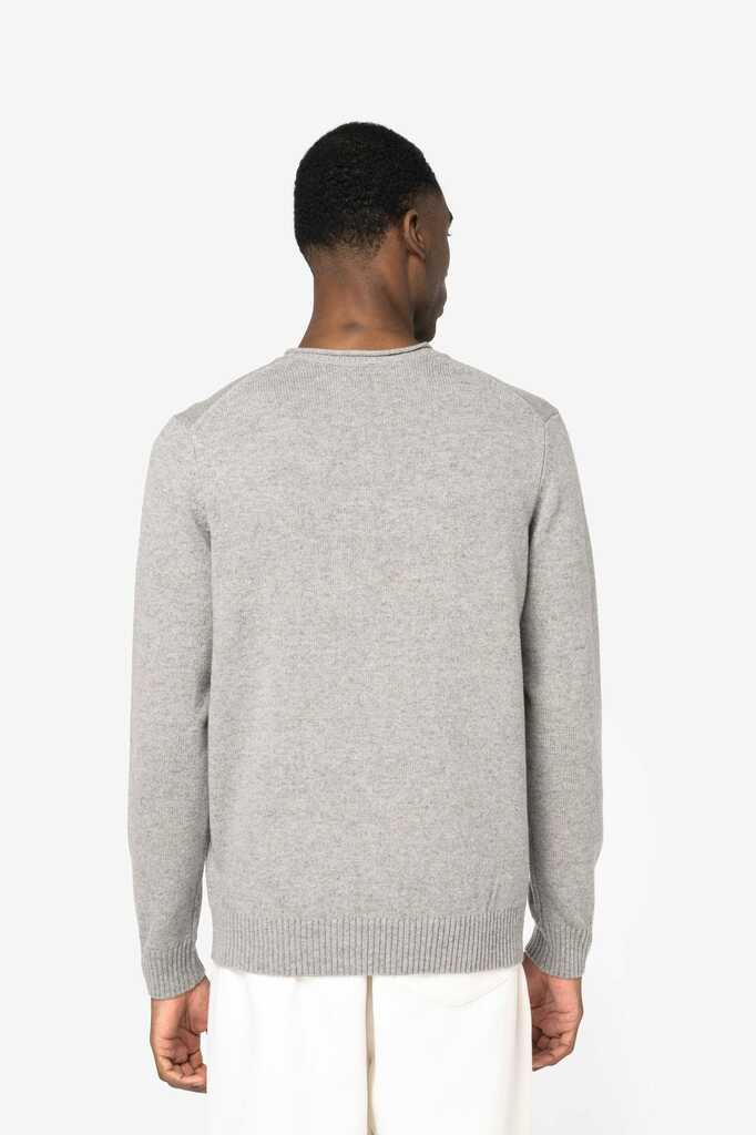 Algodão penteado. Arqueado 7. Corte justo. Decote com acabamento enrolado no tecido principal. Tapa-costuras Navy Blue em todas as cores. Malha rib 2 x 2 no cós e nos punhos. Malha « Fully Fashion ». Peso médio do tamanho L: 425 g.