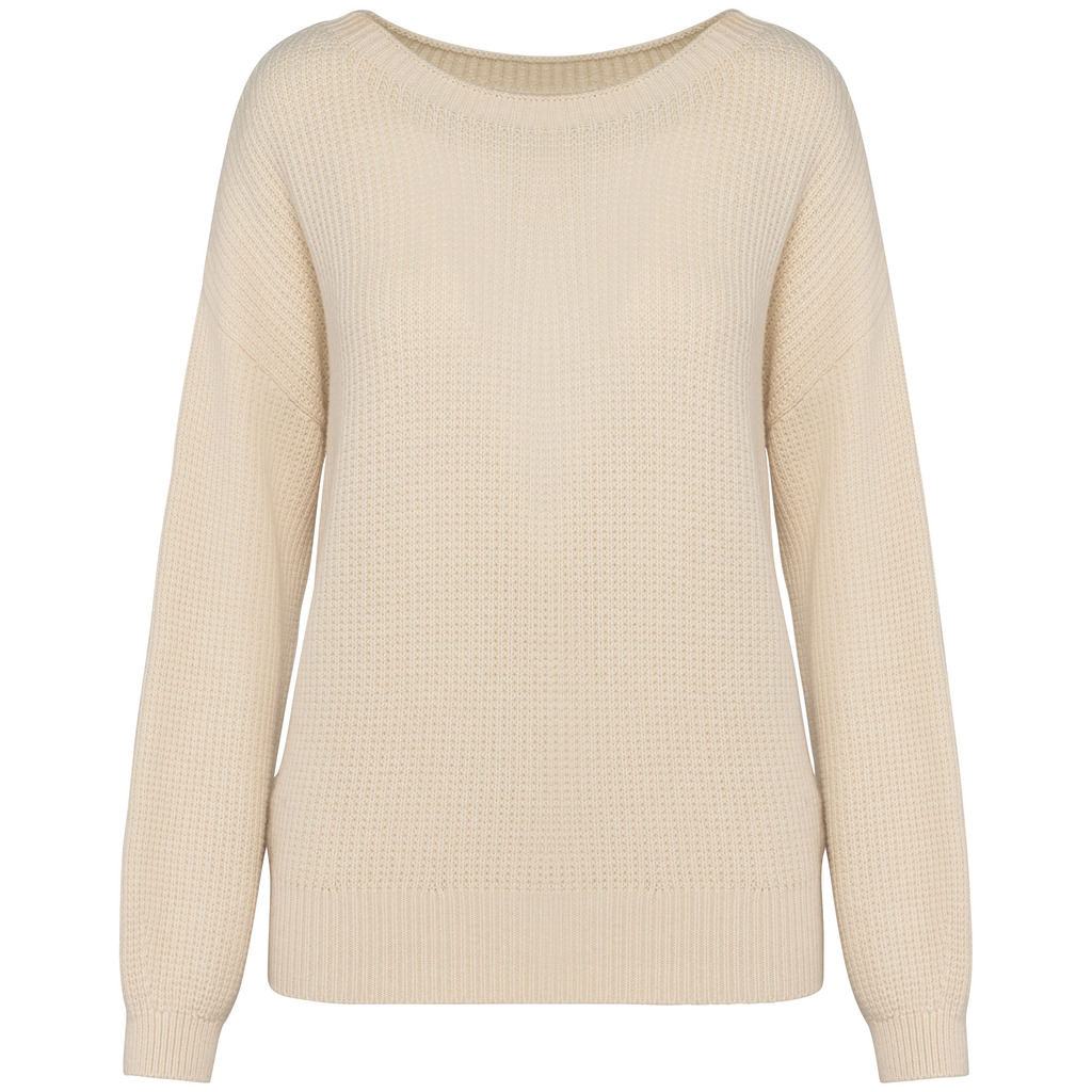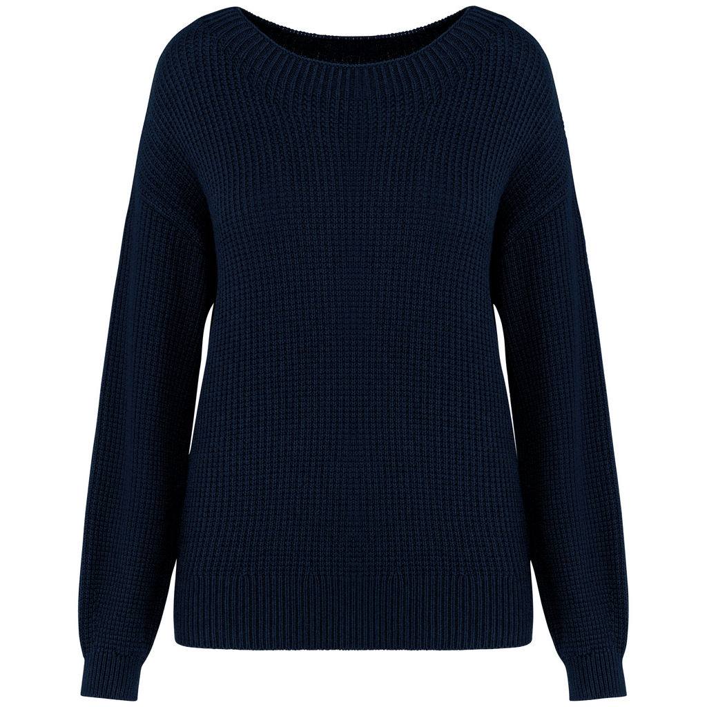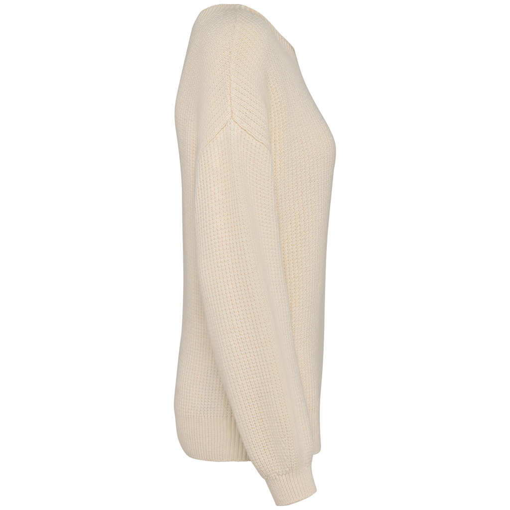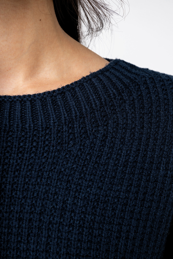 50% algodão biológico / 50% lã Merino eco-responsável RWS. Algodão penteado. Arqueado 5. Corte confortável e mangas « balão ». Malha rib 1 x 1 no decote, nos punhos e no cós. Malha « Fully Fashion ». Peso médio do tamanho M: 600 g.