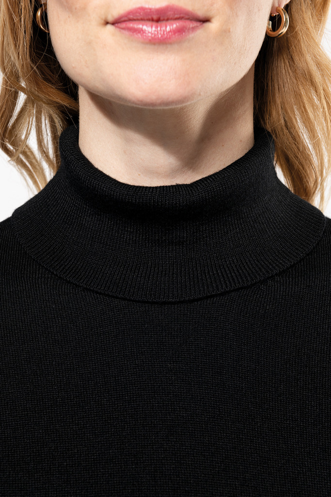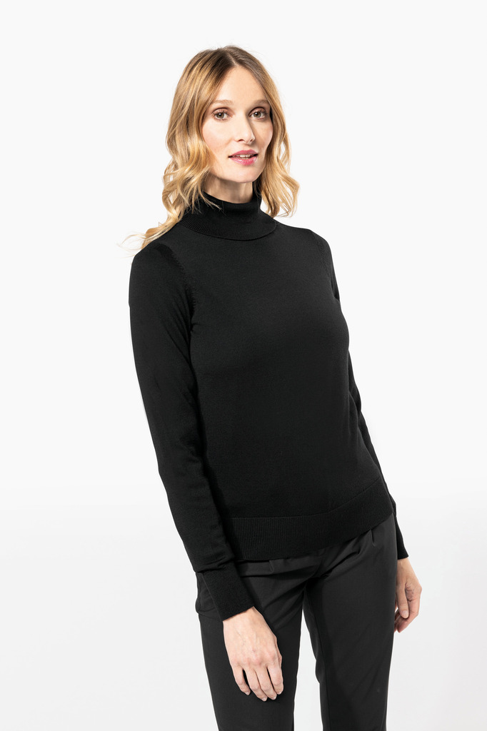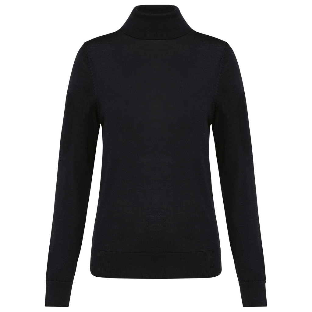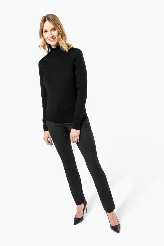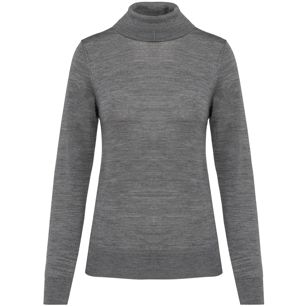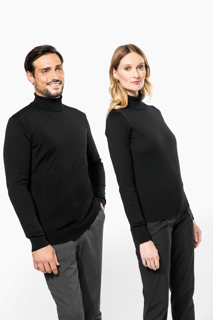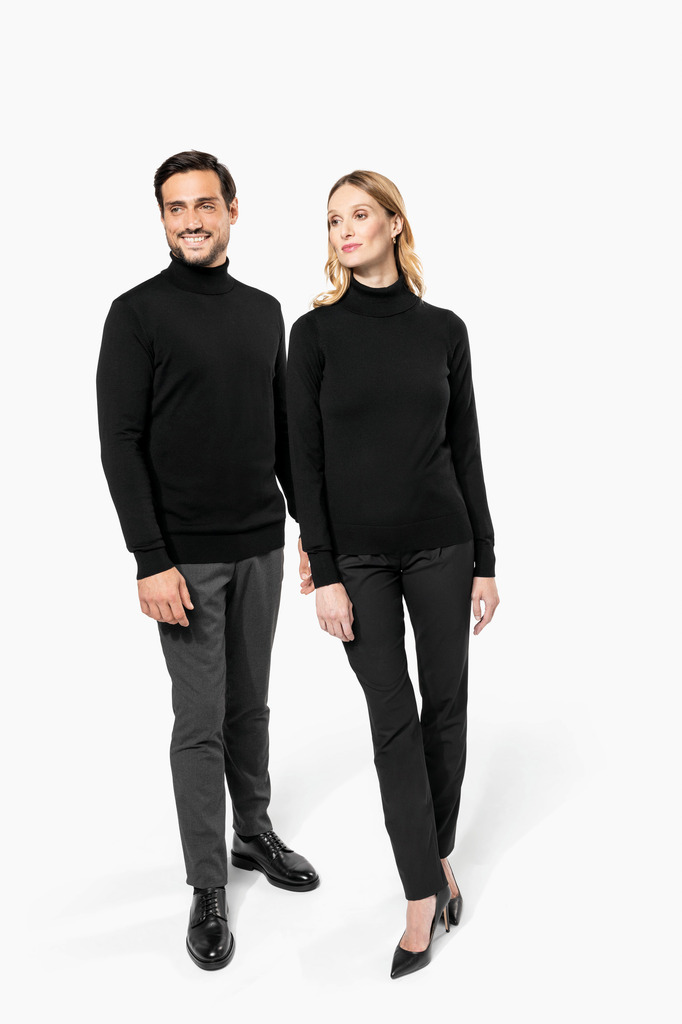 100% Lã Merino extrafina penteada. Arqueado 14. Muito fashion: tricotada na forma e montada na máquina das malhas. Gola alta, punhos e bainha em malha rib 1 x 1.