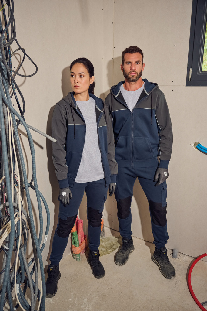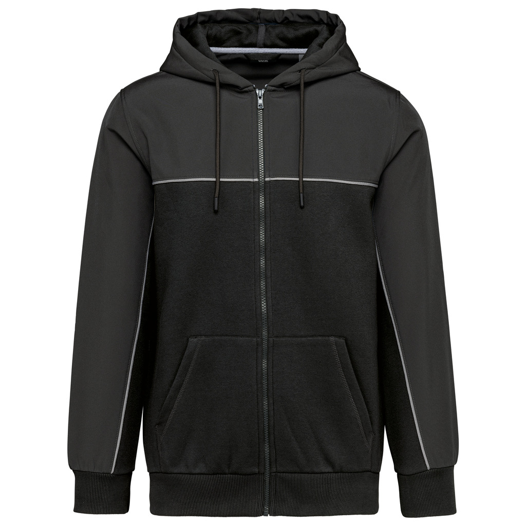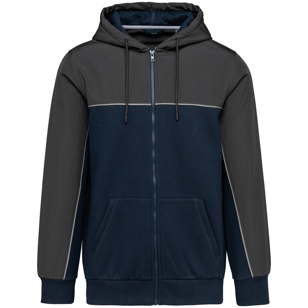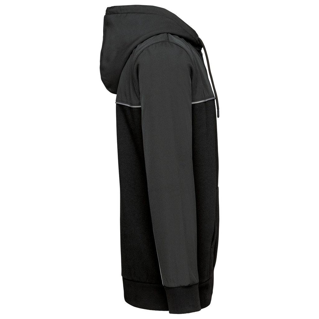 60% algodão/40% poliéster reciclado. Tecido dos encaixes: softshell 2 camadas repelente à água 95% poliéster/5% elatano. Corte direito. 3 bolsos à canguru. Capuz com 2 partes com cordão de ajuste redondo e extremidades em borracha. Encaixes frontais, nas costas e na parte de cima das mangas em tecido em contraste. Fecho frontal tom sobre tom. Meia-lua nas costas em softshell. Pesponto em contraste Silver nos encaixes frontais e das mangas. Presilha para pendurar e tapa-costuras em chevron Silver na gola. Punhos e bainha em malha rib tutubar 2 x 2. Etiqueta de marca amovÃvel.