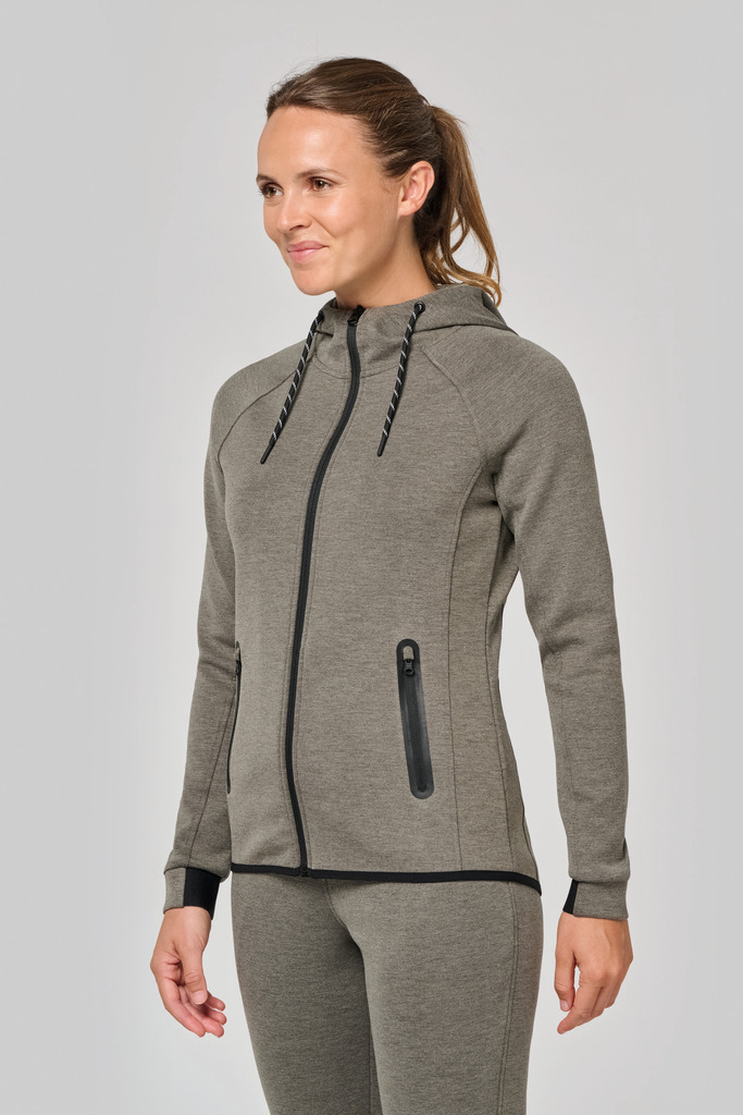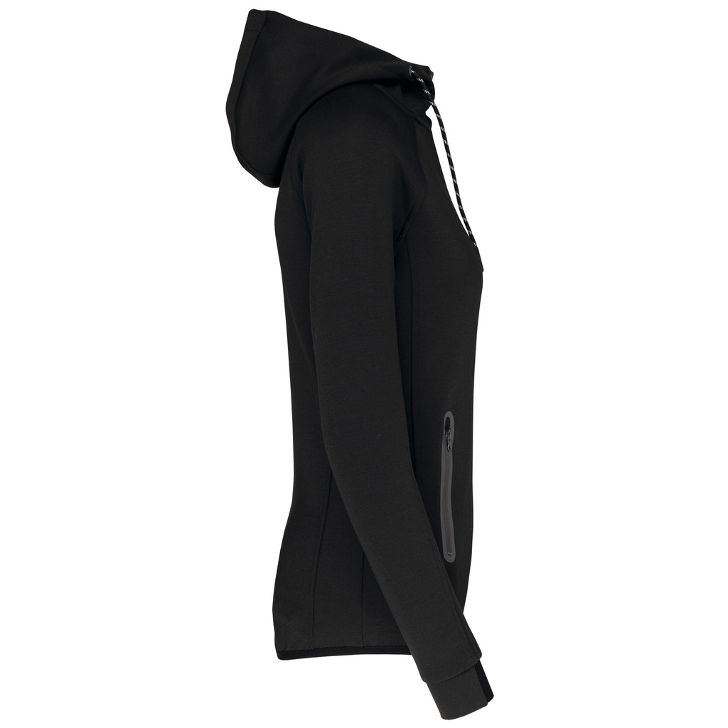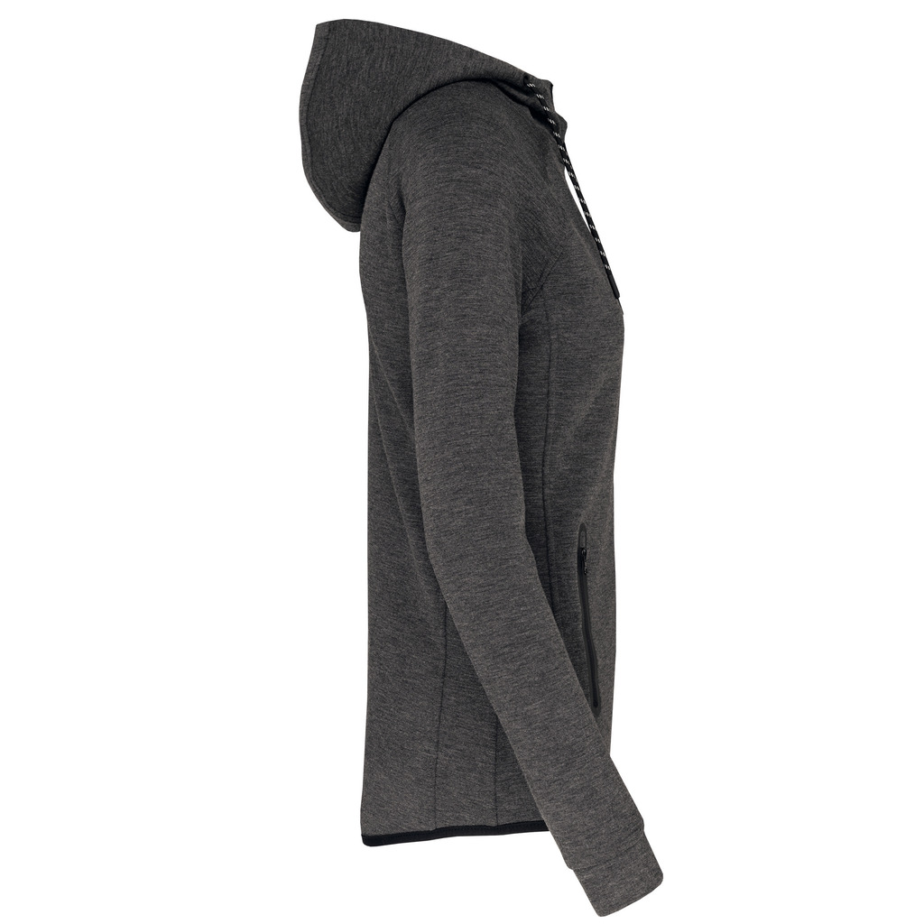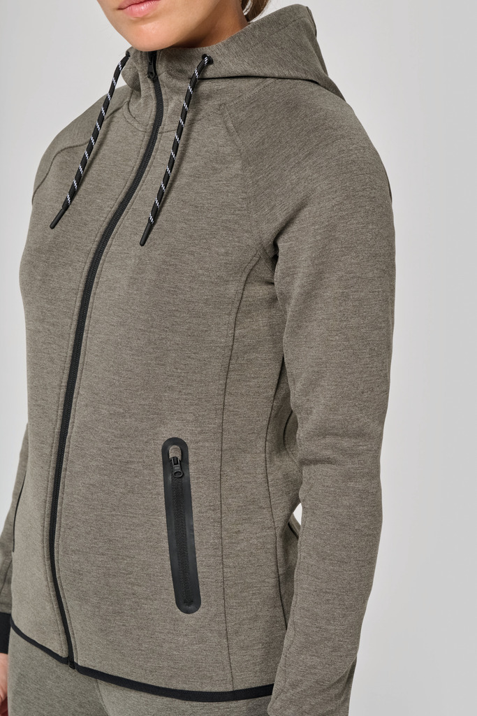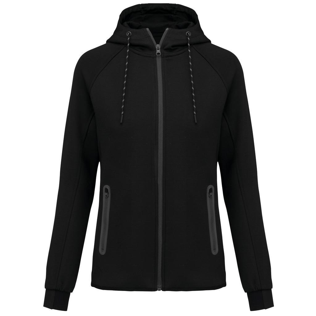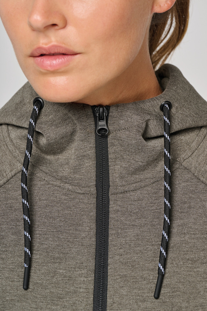 94% poliéster/6% elastano (79% poliéster/15% viscose/6% elastano nas cores mescladas). Material ultraconfortável. Com fecho. 2 bolsos frontais com fecho com acabamento termocolado. Capuz com forro em jersey 65% poliéster/35% viscose com cordão de ajuste bicolor e acabamento em plástico. Mangas ajustáveis com parte elástica em contraste e cós com recobrimento em contraste Black em todas as cores e Dark Grey na Ash Heather (fechos também).