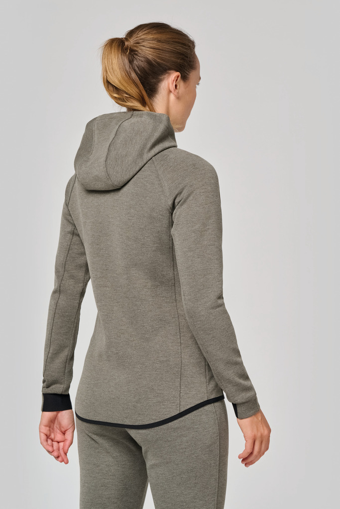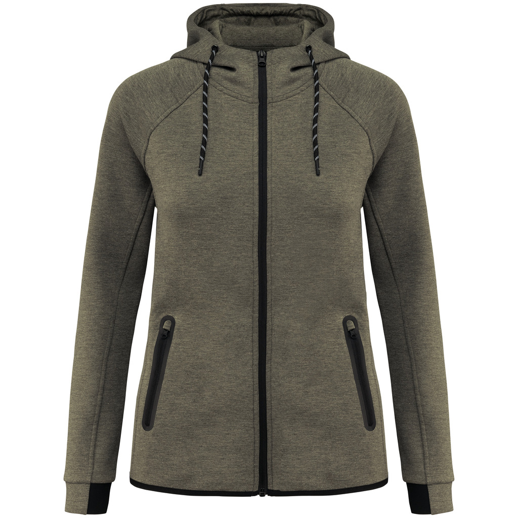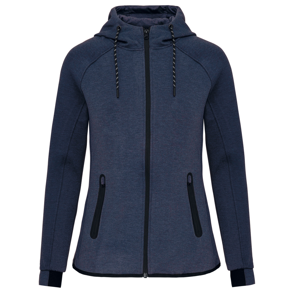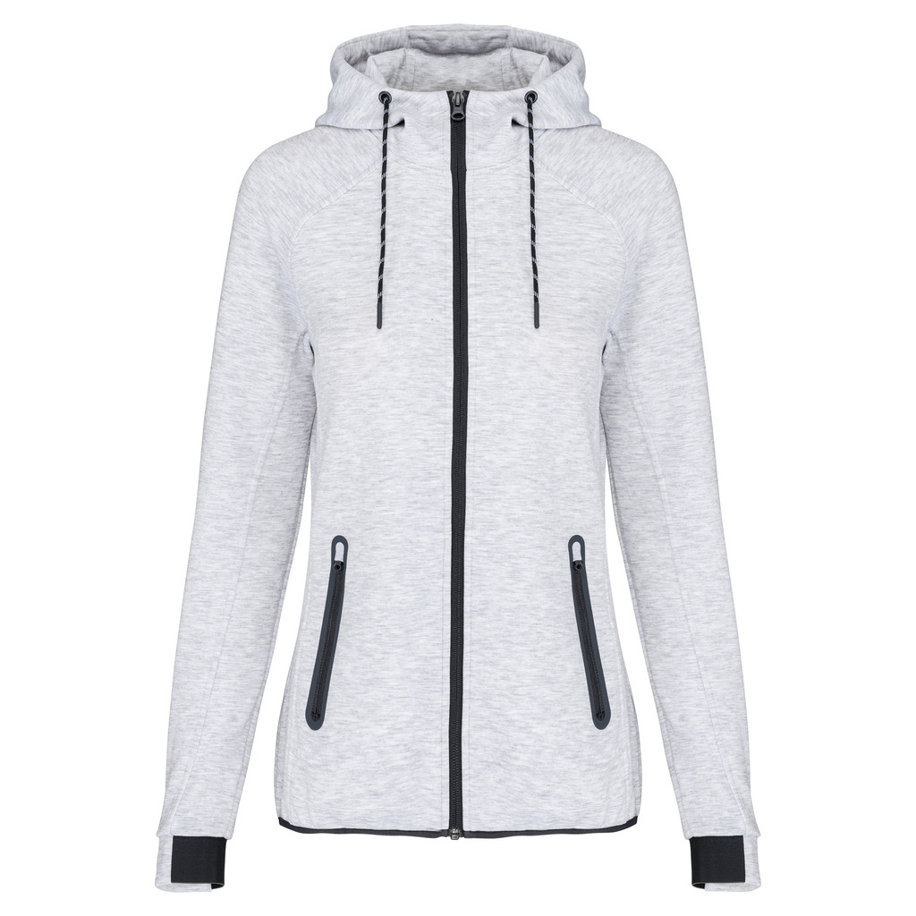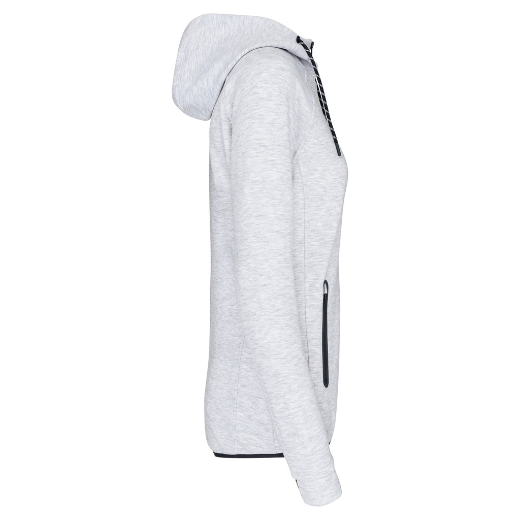 94% poliéster/6% elastano (79% poliéster/15% viscose/6% elastano nas cores mescladas). Material ultraconfortável. Com fecho. 2 bolsos frontais com fecho com acabamento termocolado. Capuz com forro em jersey 65% poliéster/35% viscose com cordão de ajuste bicolor e acabamento em plástico. Mangas ajustáveis com parte elástica em contraste e cós com recobrimento em contraste Black em todas as cores e Dark Grey na Ash Heather (fechos também).