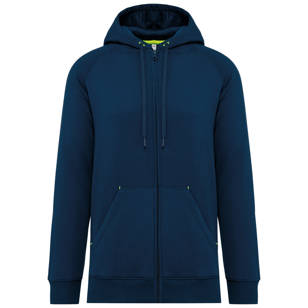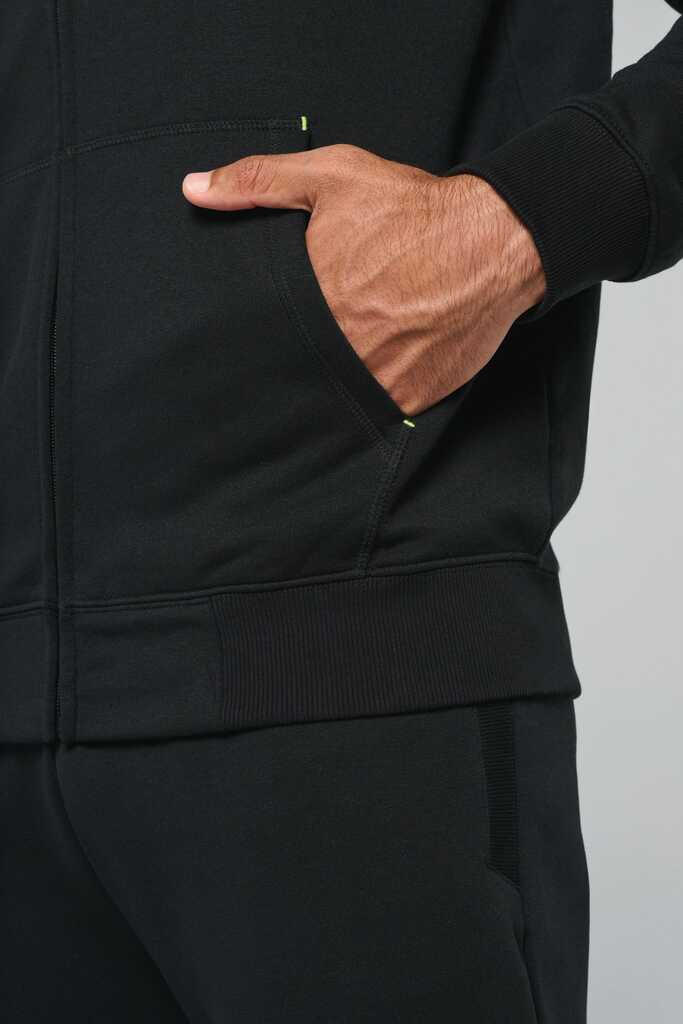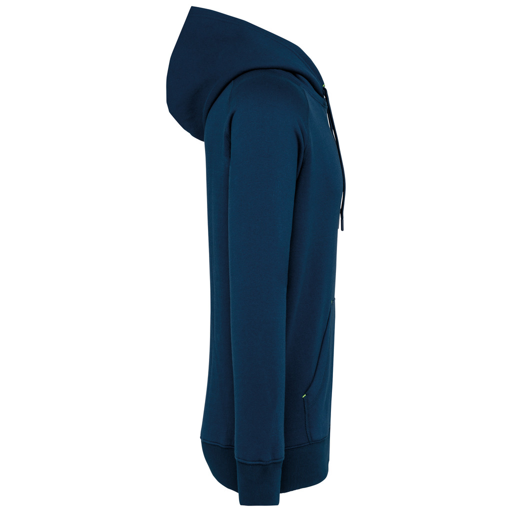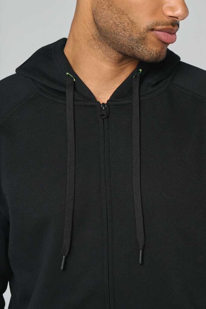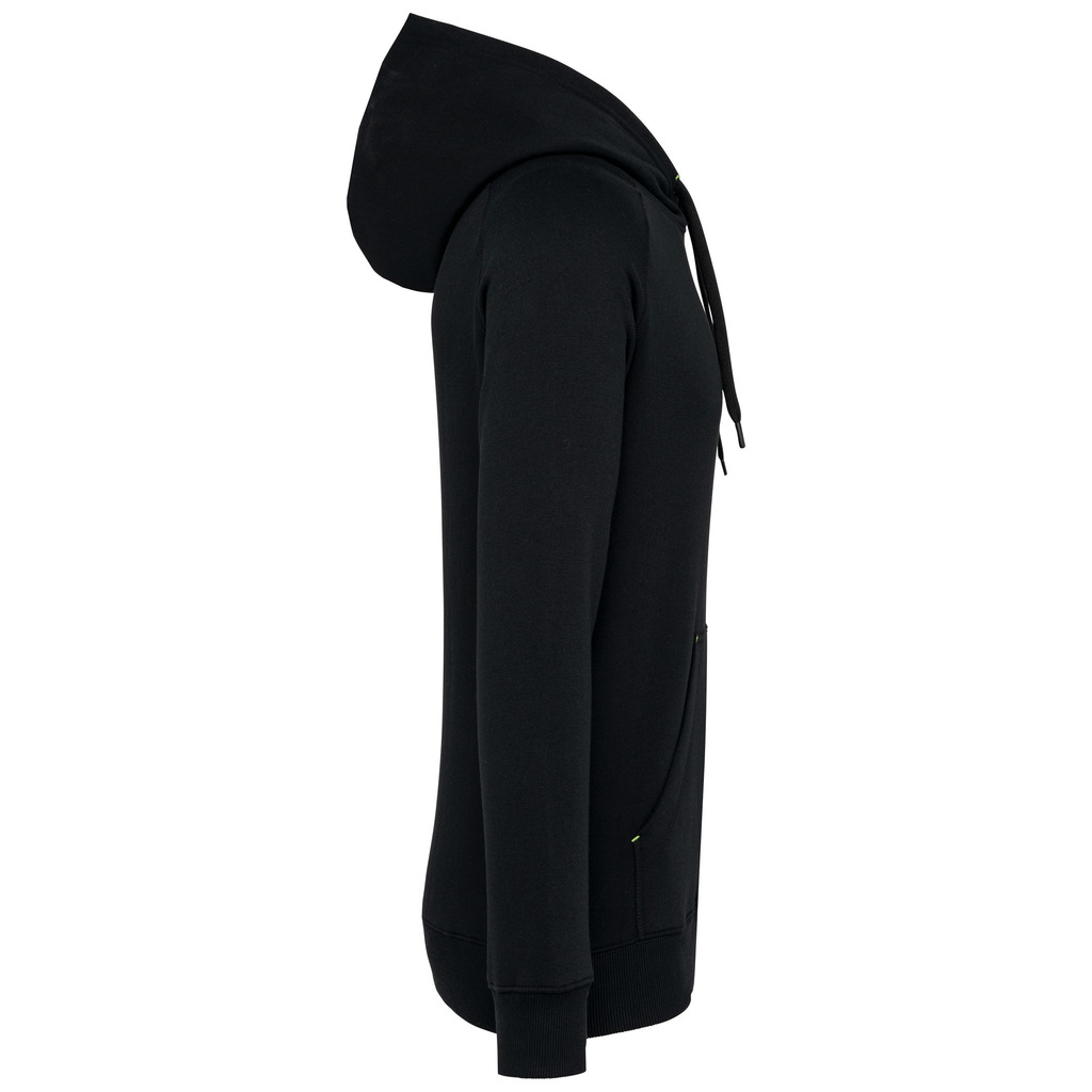 65% poliéster/35% algodão. Fio Vortex. Interior cardado. Algodão penteado. Corte justo. Mangas raglan. Fecho em nylon. Capuz forrado em malha de rede tom sobre tom. Bolsos tipo canguru com 1 bolso fluorescente para telefone. Tapa-costuras no interior do capuz, ilhós do cordão do capuz e pontos nos bolsos em cores fluorescentes. Punhos e cós em malha rib 2 x 2 com espessura dupla. Acabamento em meia-lua nas costas para facilitar a personalização de marca no interior. Etiqueta de marca Tear-away.