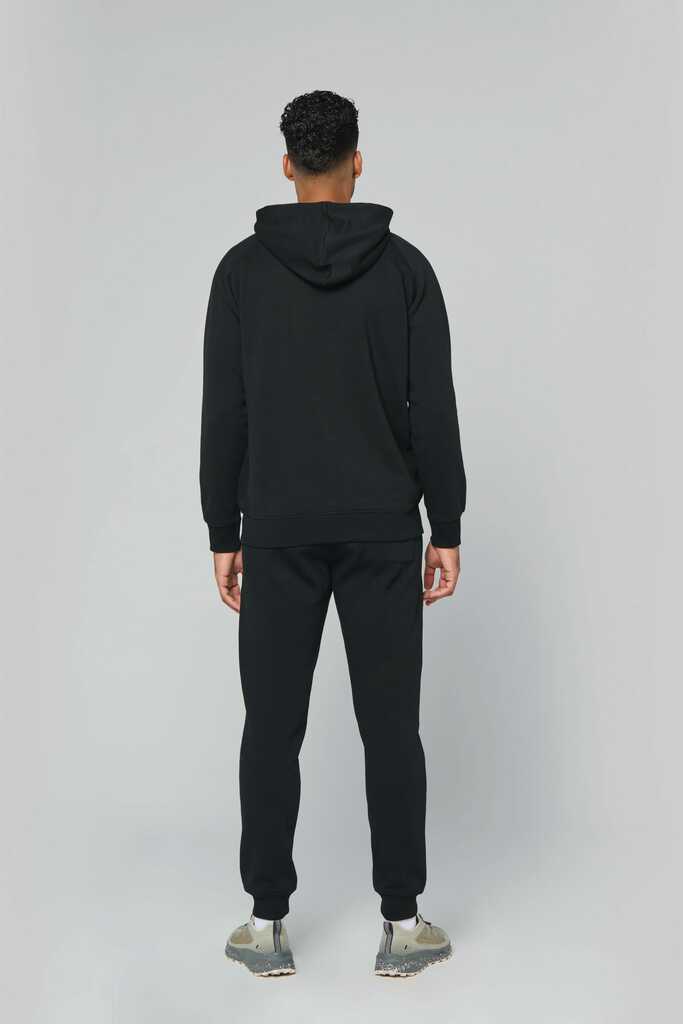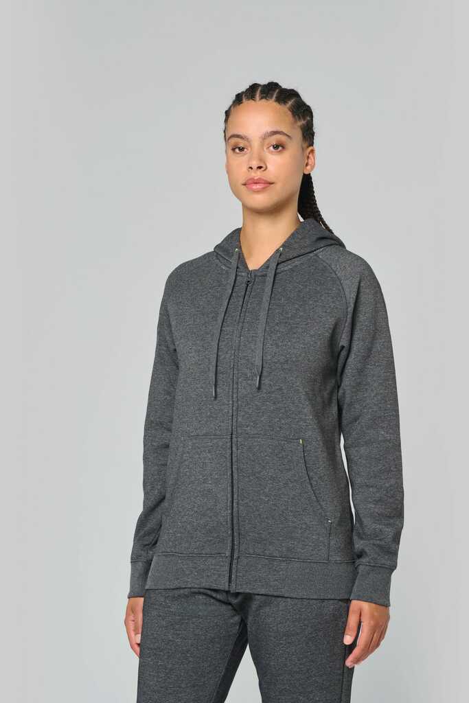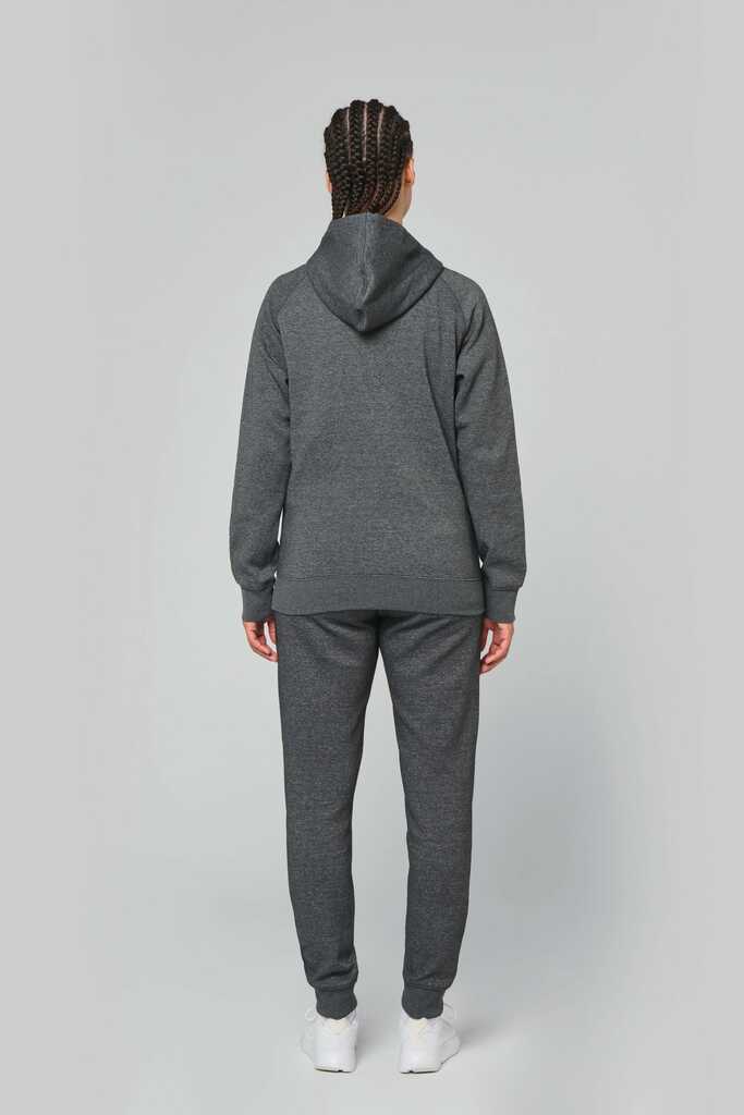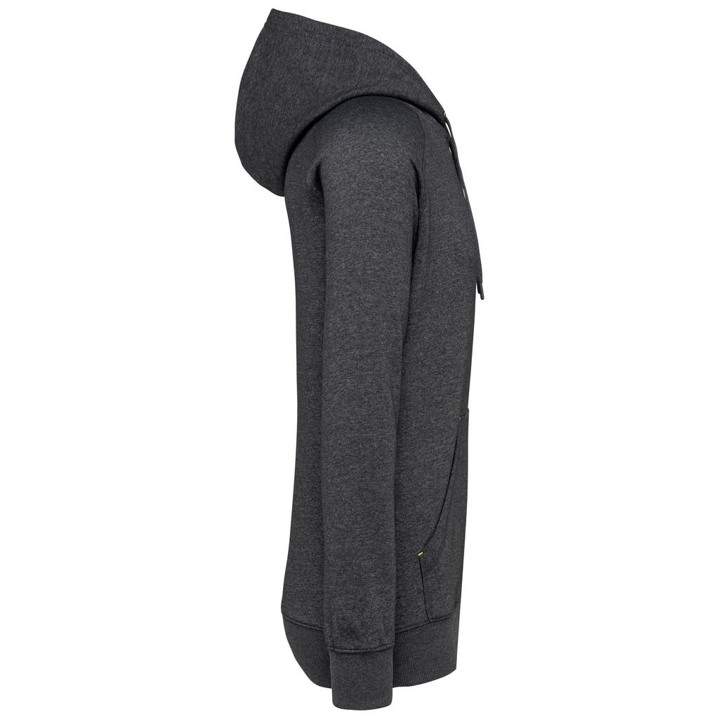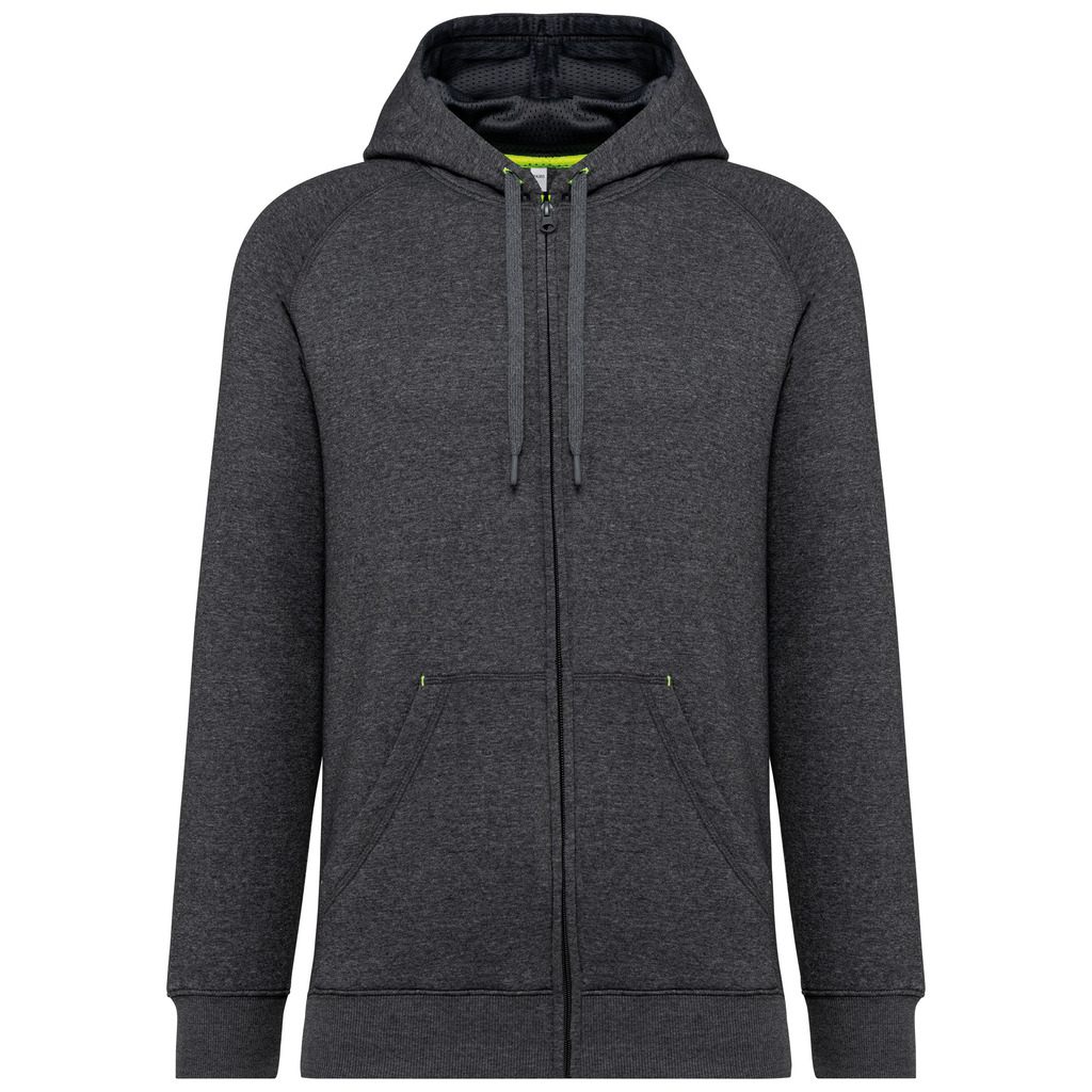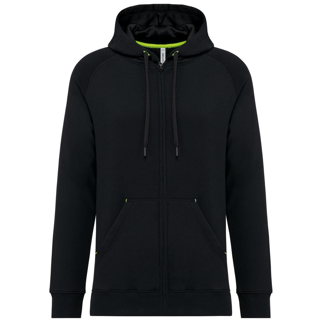 65% poliéster/35% algodão. Fio Vortex. Interior cardado. Algodão penteado. Corte justo. Mangas raglan. Fecho em nylon. Capuz forrado em malha de rede tom sobre tom. Bolsos tipo canguru com 1 bolso fluorescente para telefone. Tapa-costuras no interior do capuz, ilhós do cordão do capuz e pontos nos bolsos em cores fluorescentes. Punhos e cós em malha rib 2 x 2 com espessura dupla. Acabamento em meia-lua nas costas para facilitar a personalização de marca no interior. Etiqueta de marca Tear-away.