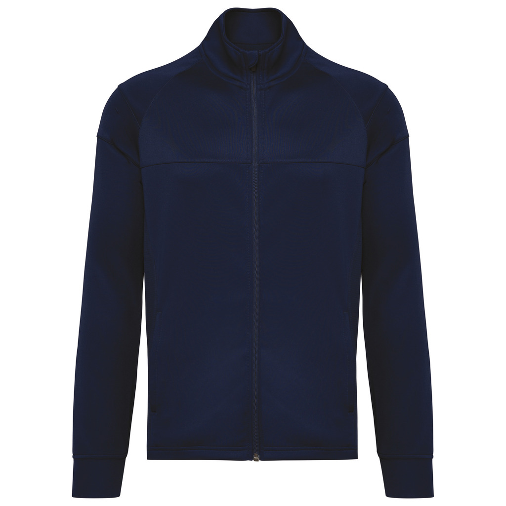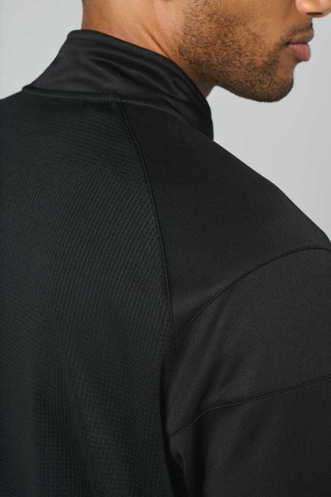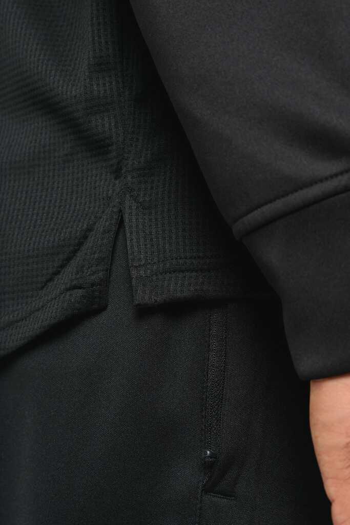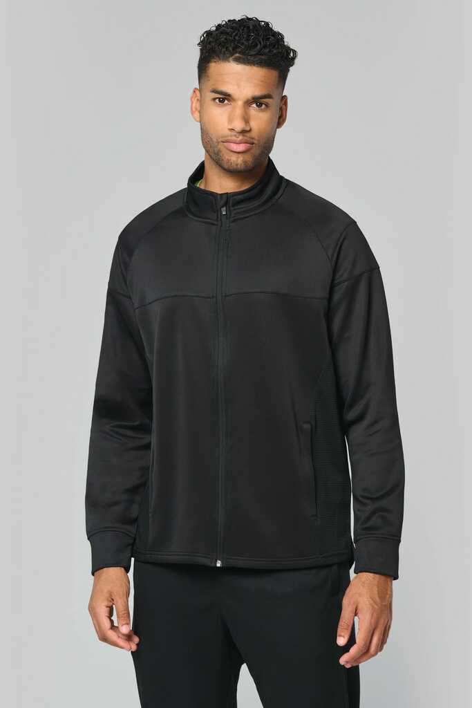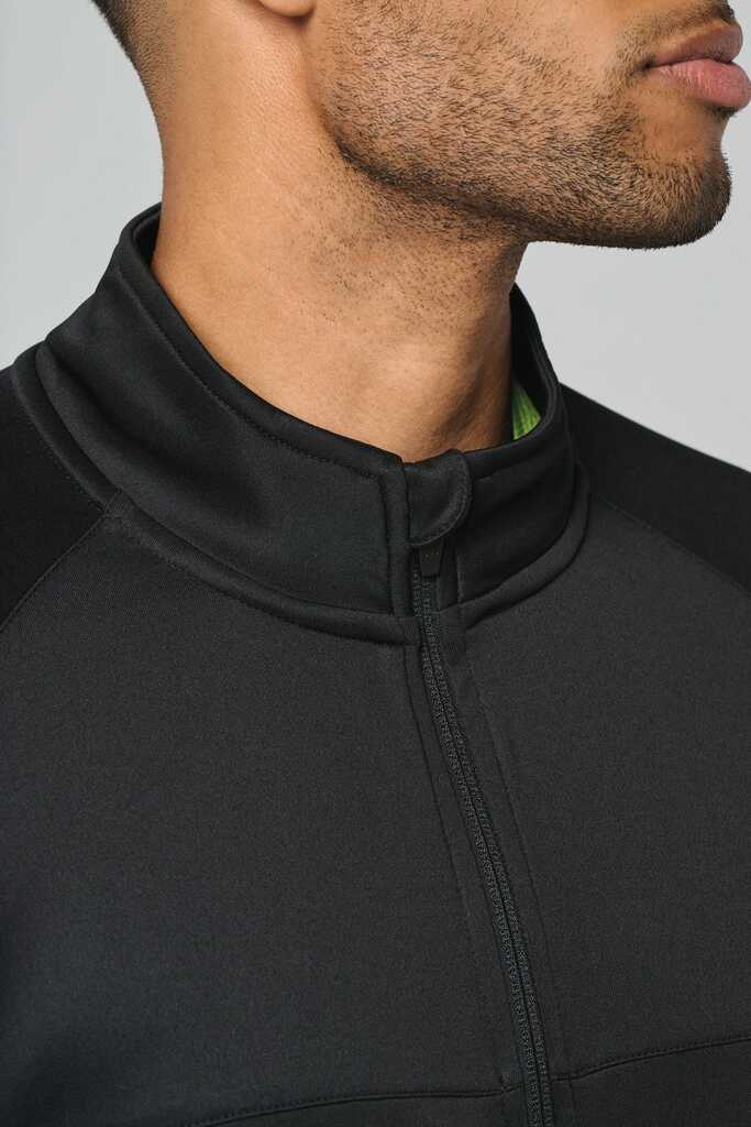 96% poliéster reciclado/4% elastano. Corte direito. Fecho frontal invertido em nylon tom sobre tom. Mangas raglan com recortes nos ombros. Punhos no tecido principal. 2 bolsos frontais com fecho. Tecido texturado nas laterais e nas costas. Fecho recoberto na parte de cima da gola para maior conforto. Debruado na bainha. Costas mais compridas e aberturas laterais para maior liberdade de movimentos. Etiqueta de marca amovÃvel para facilitar a personalização.