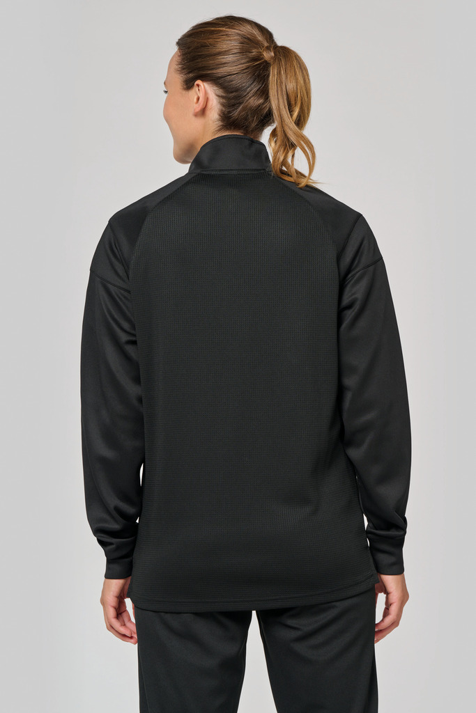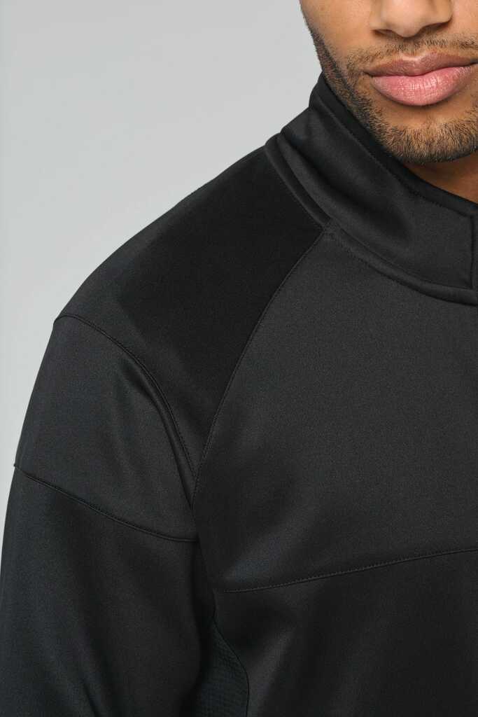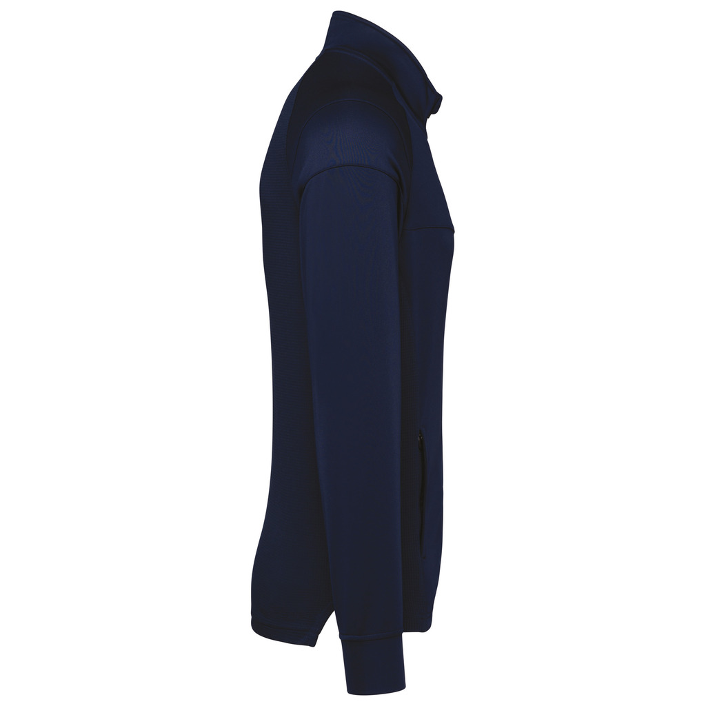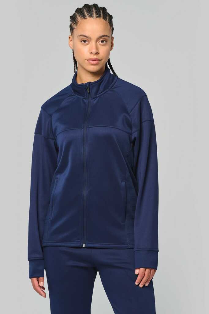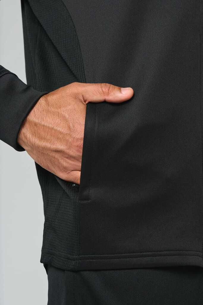 96% poliéster reciclado/4% elastano. Corte direito. Fecho frontal invertido em nylon tom sobre tom. Mangas raglan com recortes nos ombros. Punhos no tecido principal. 2 bolsos frontais com fecho. Tecido texturado nas laterais e nas costas. Fecho recoberto na parte de cima da gola para maior conforto. Debruado na bainha. Costas mais compridas e aberturas laterais para maior liberdade de movimentos. Etiqueta de marca amovÃvel para facilitar a personalização.