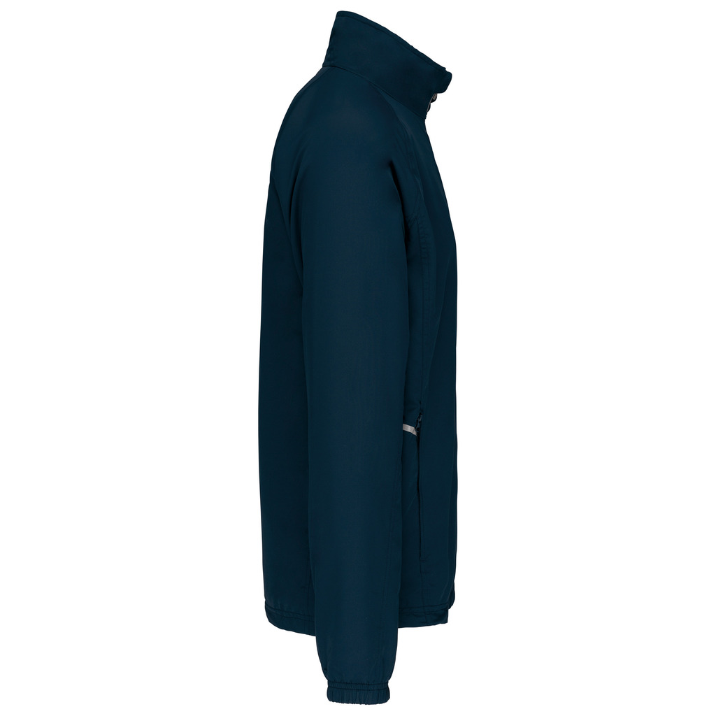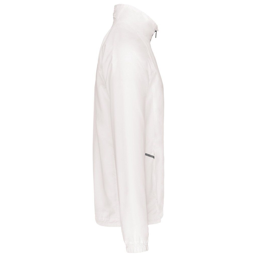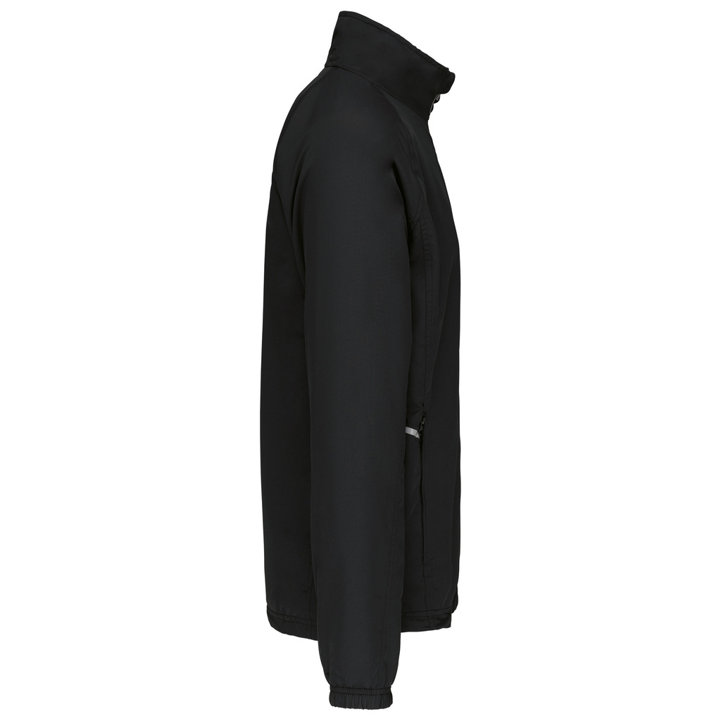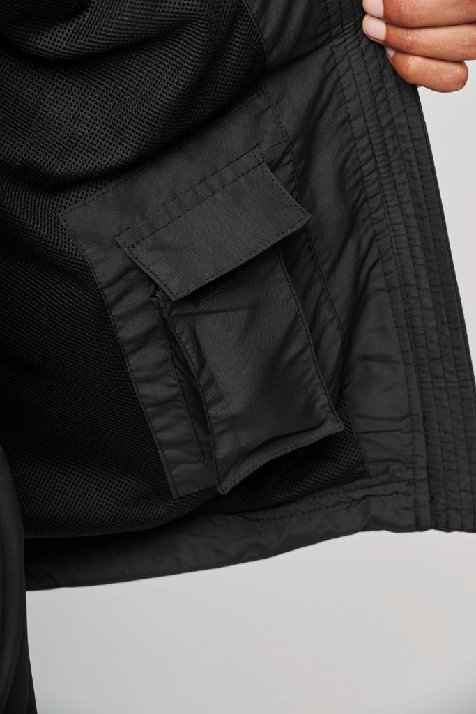 100% poliéster Diamond. Forro em malha. Fecho frontal com detalhe reflector. 2 bolsos frontais com fecho. 1 bolso interior. Punhos elásticos. Cordão de ajuste na cintura. Detalhe reflector nas laterais. Fecho de acesso para personalização.
