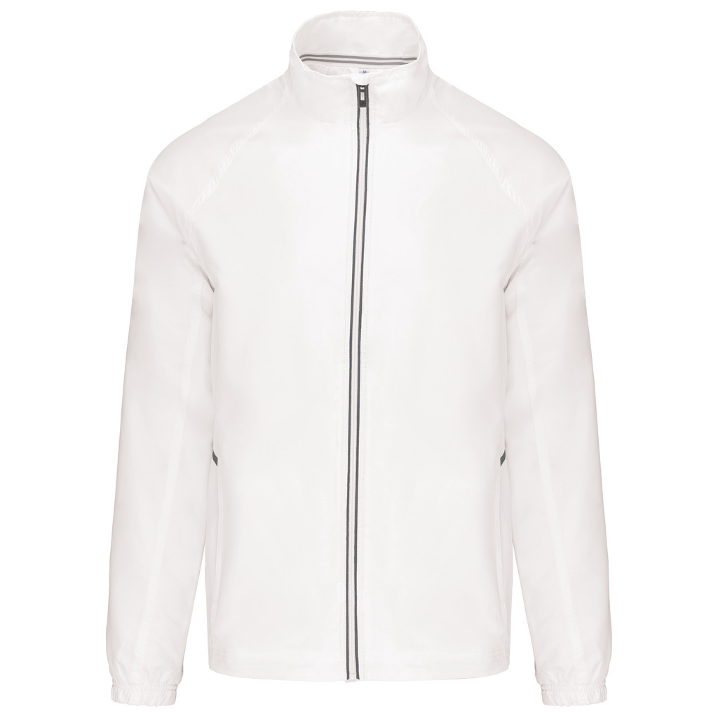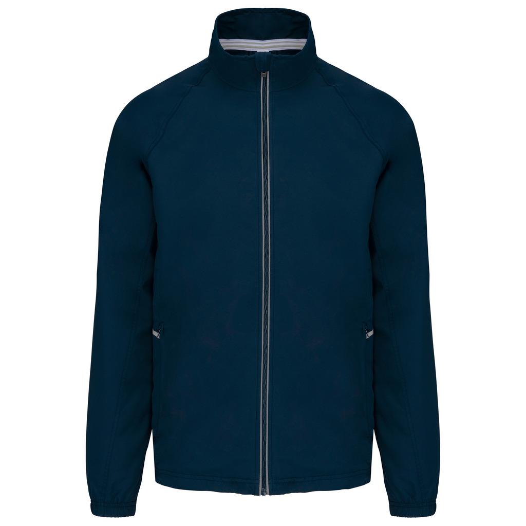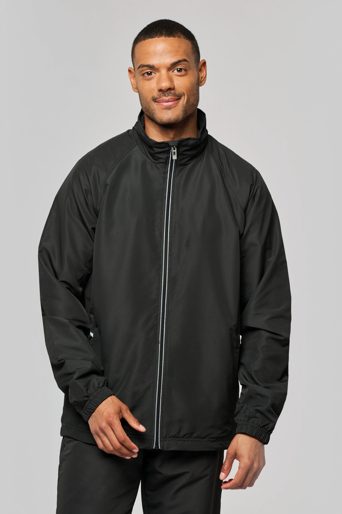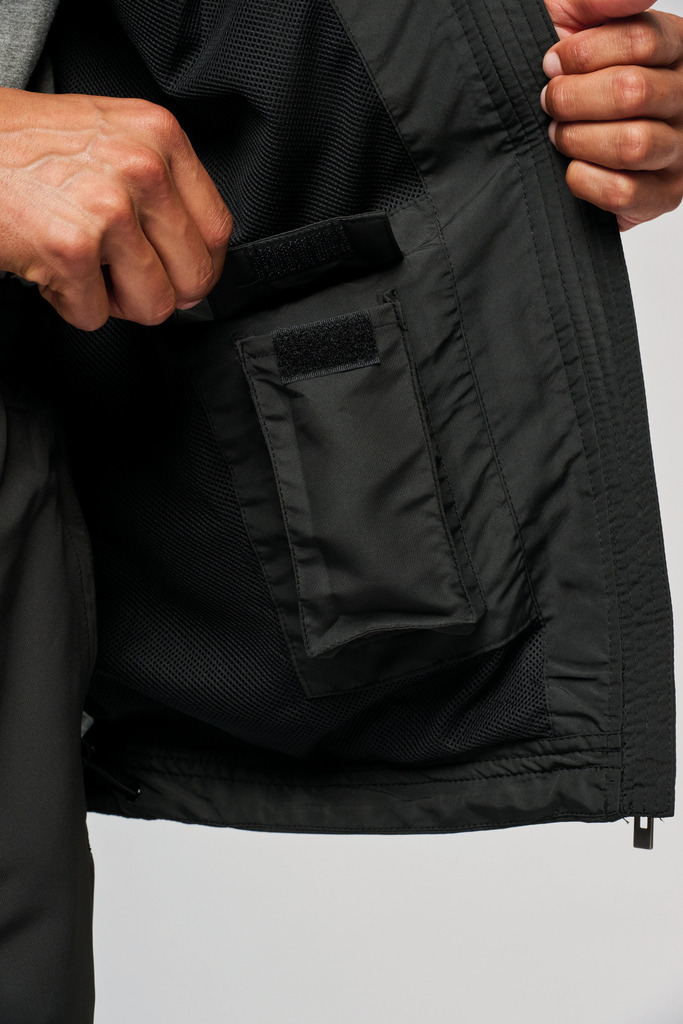 100% poliéster Diamond. Forro em malha. Fecho frontal com detalhe reflector. 2 bolsos frontais com fecho. 1 bolso interior. Punhos elásticos. Cordão de ajuste na cintura. Detalhe reflector nas laterais. Fecho de acesso para personalização.