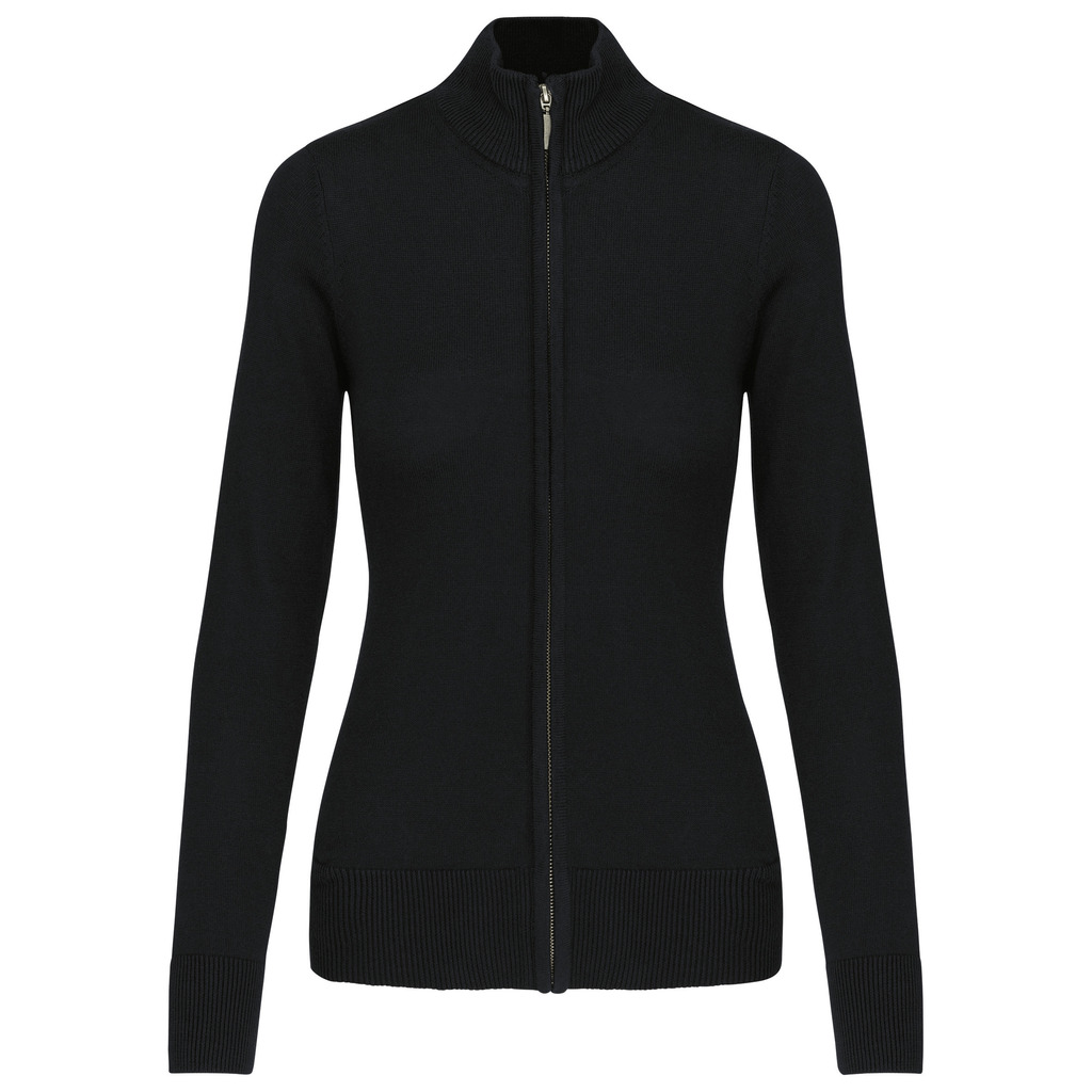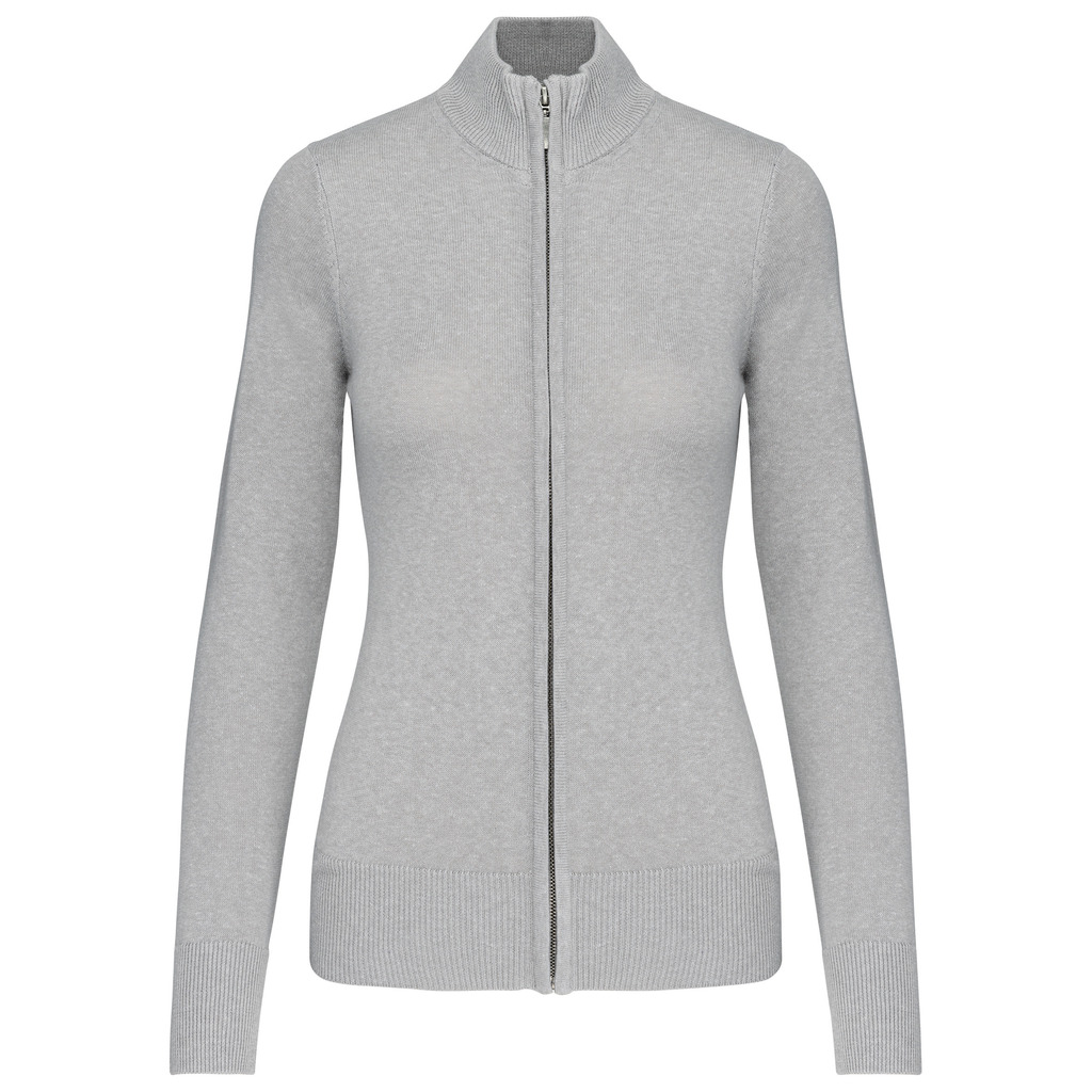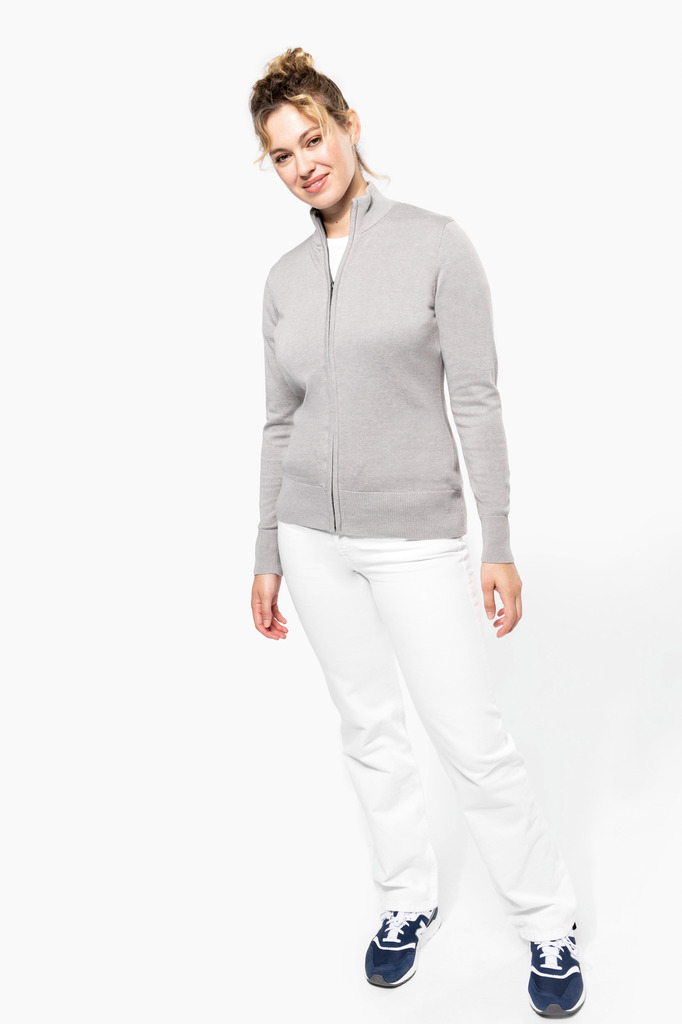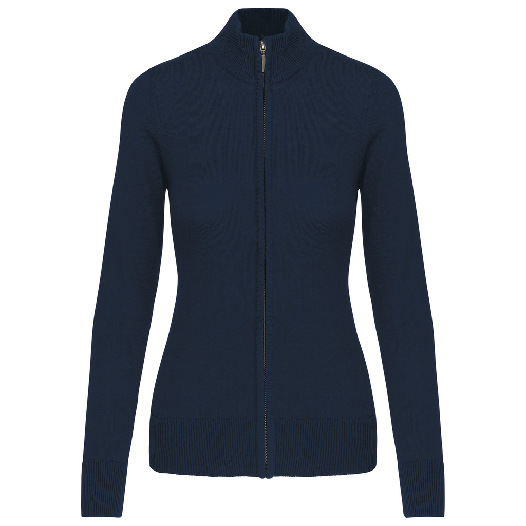 50% algodão / 50% acrilico. Corte cintado. Gola subida. Fecho frontal. Tapa-costuras.