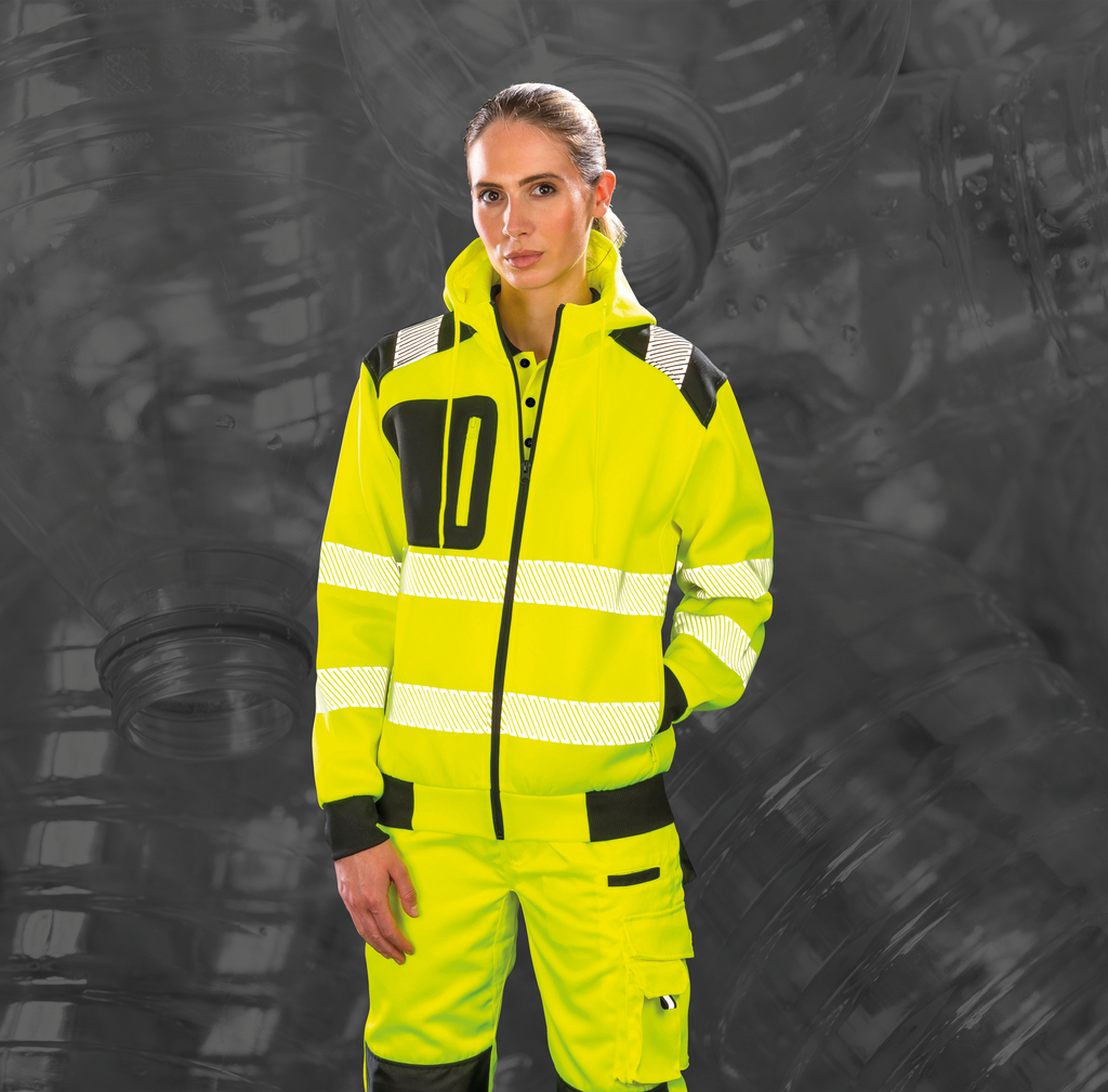 100% poliéster. 100% poliéster reciclado REPREVE®. Peça fabricada a partir de garrafas de plástico e resÃduos pós-industriais. Sweatshirt de segurança quente, respirável e corta-vento. Fecho frontal YKK com tira. Punhos e cós em tricot extensÃvel. Acabamentos reflectores impressos extensÃveis. Bolsos laterais com fecho e bolso com fecho no peito do lado direito. Capuz com cordão de ajuste. Polar no interior. Presilha para pendurar. Norma High Viz: EN ISO 20471: 2013+A1: 2016 Classe 2 RIS-3279-TOM Classe 2 (somente o modelo Orange).