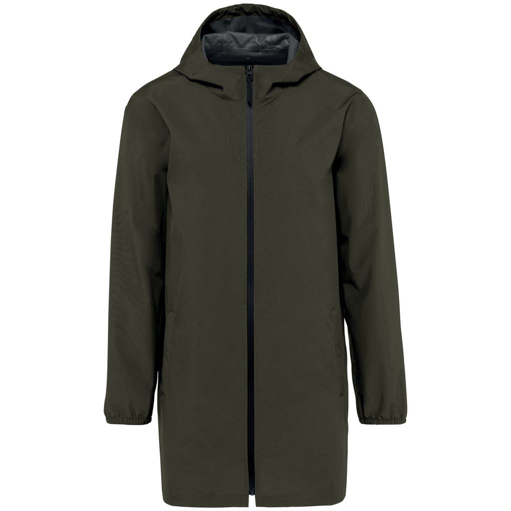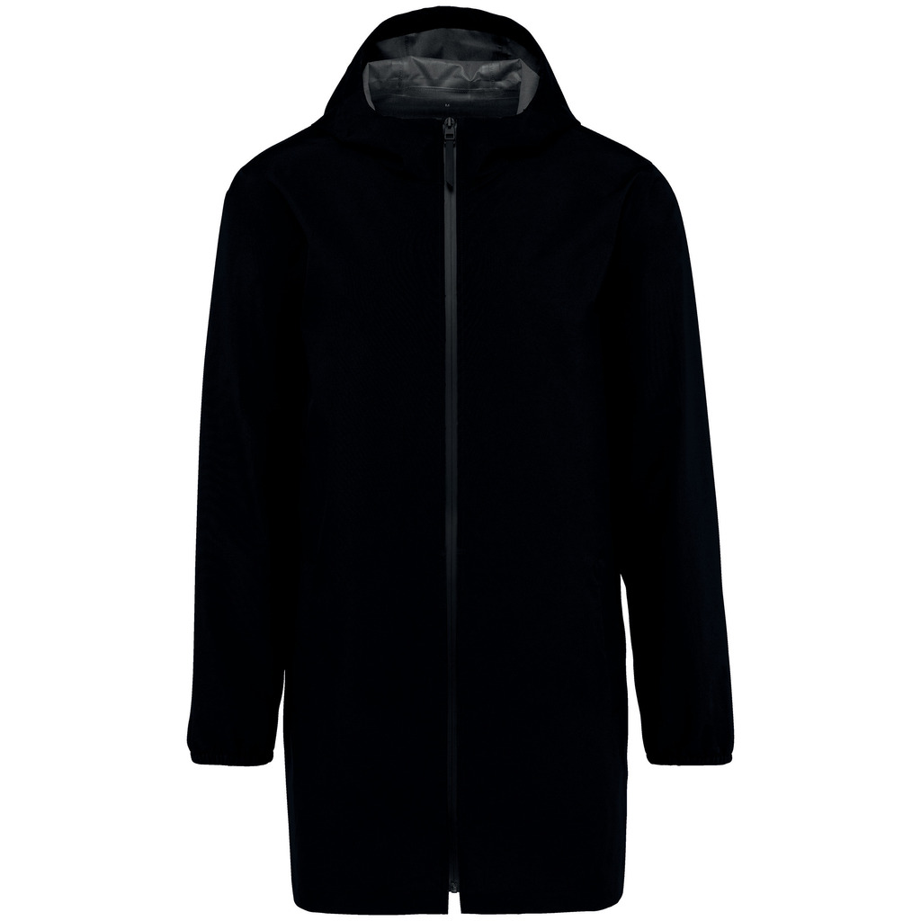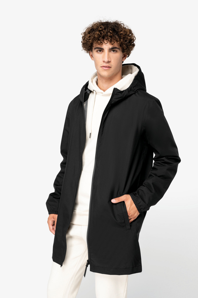 100% poliéster reciclado pós-consumo. Corte direito. Impermeável 4000 mm. Respirável 3000 g/m²/24 horas. Fecho impermeável reciclado com puxador em metal reciclado. Tecido com membrana interior e costuras termocoladas, o que faz com que o produto seja impermeável. Dois bolsos com pesponto com fecho invertido. Capuz com cordão de ajuste. Punhos elásticos.